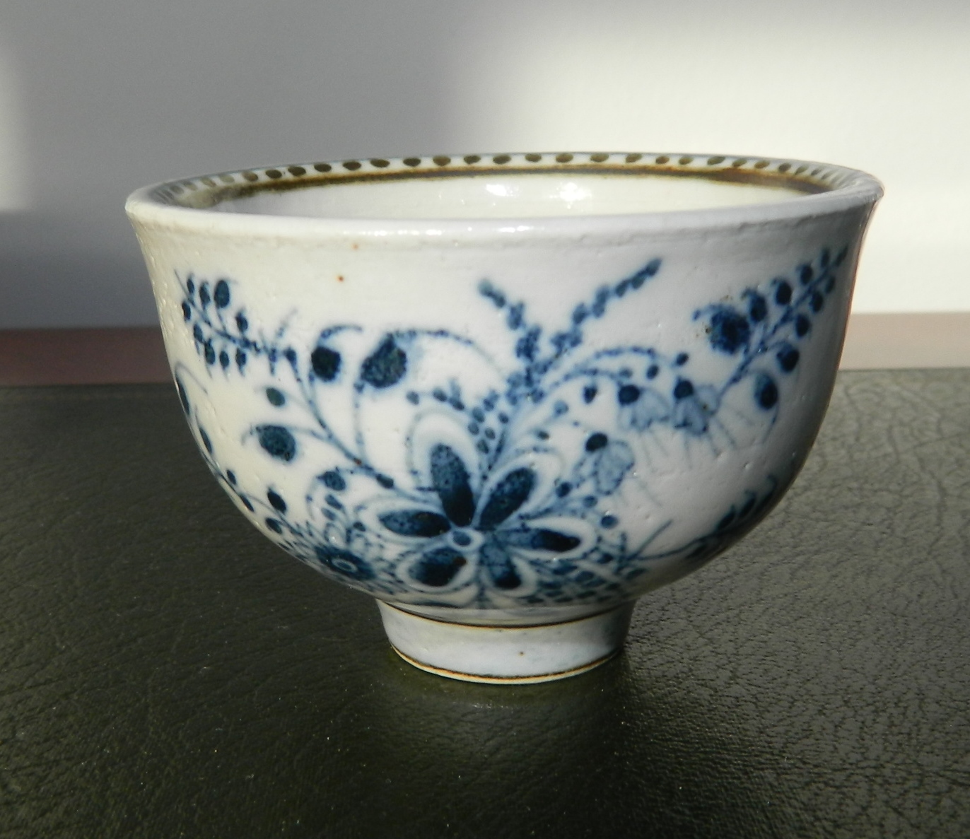 KINESISK STIL: Skål i stentøj fra Royal Copenhagen med blomsterdekoration. Fabriksmærket samt malersignatur på bunden. 1. sortering. Mål: 6 cm høj samt 8½ cm i åbningen. Foden måler 3 cm i diameter.