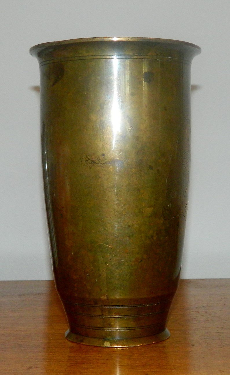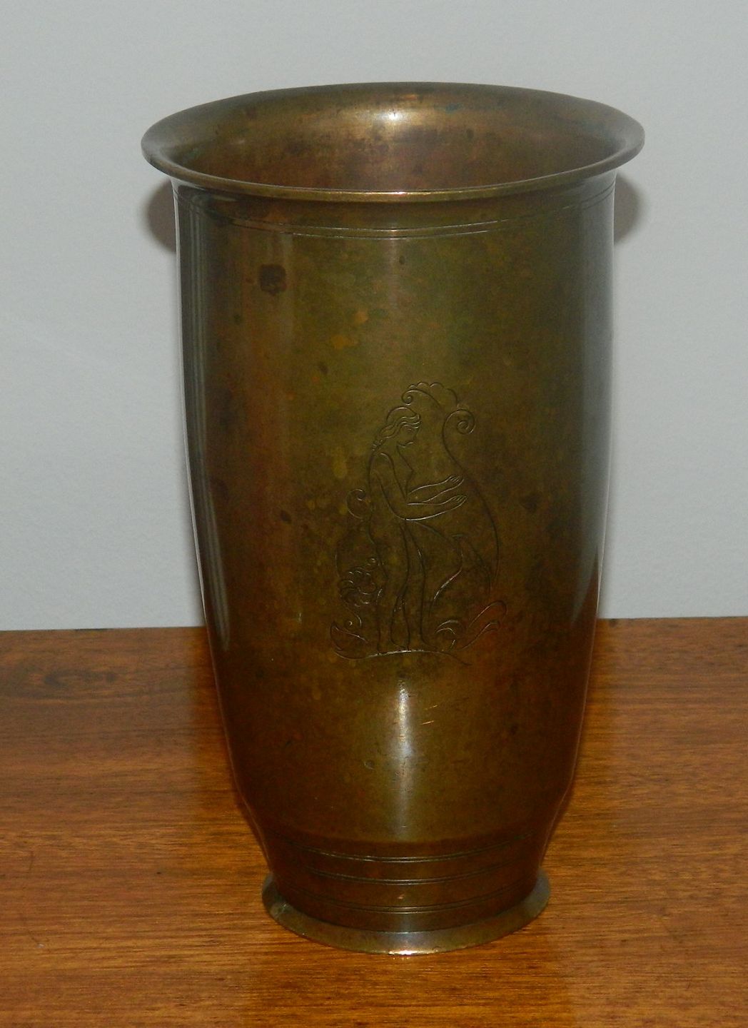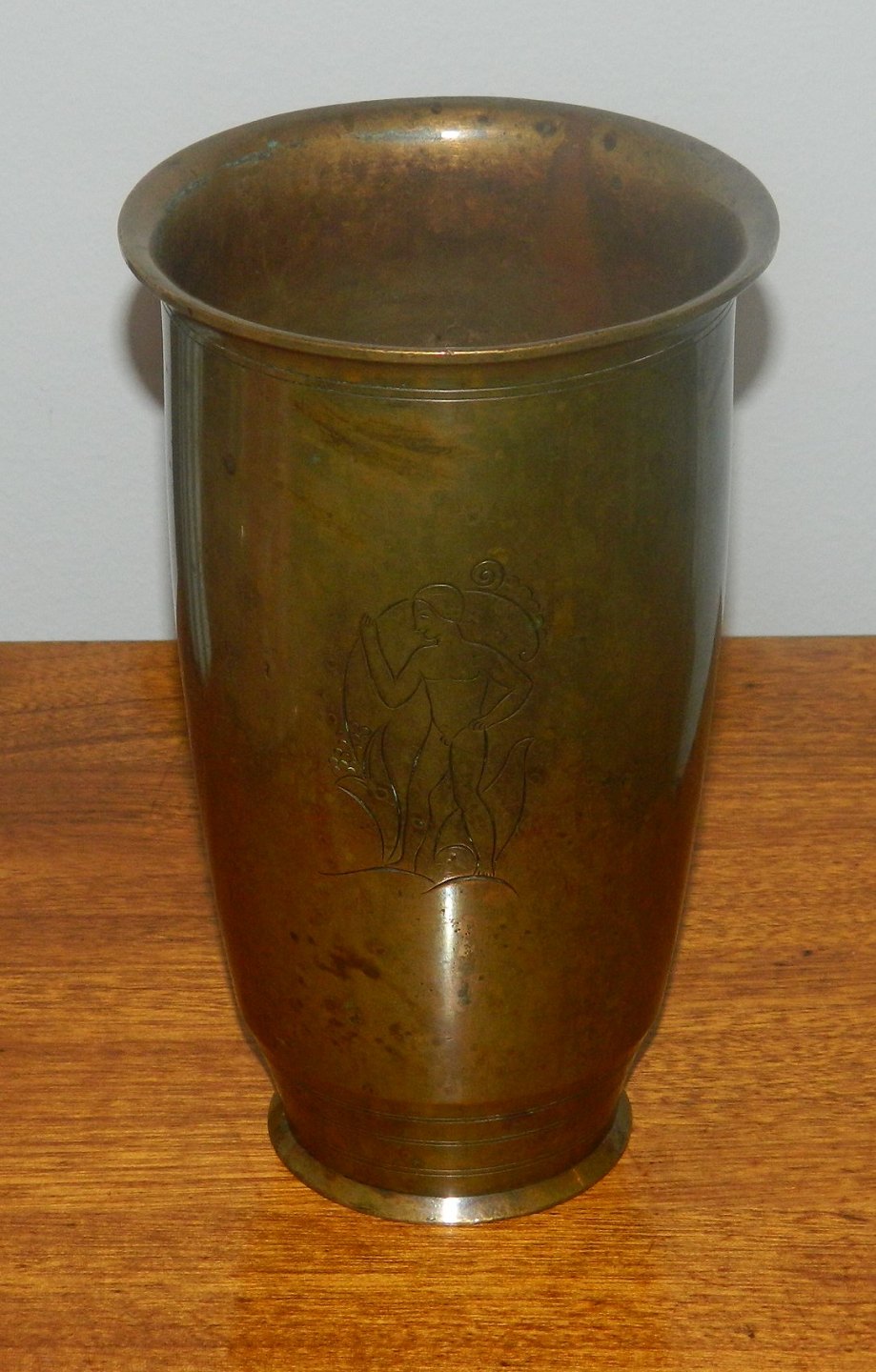Tung vase i bronze af Just Andersen (1884-1943) fra ca. 1930. Form og dekoration af nøgen kvinde og mand i Art Deco stil. Fremstår i god stand uden skader eller reparationer. Almindeligt brugsslid. Fabriksmærket på bunden med fabrikslogo samt modelnummer B 67 samt DENMARK. Mål: H. 20½ cm Ø. 12½ cm