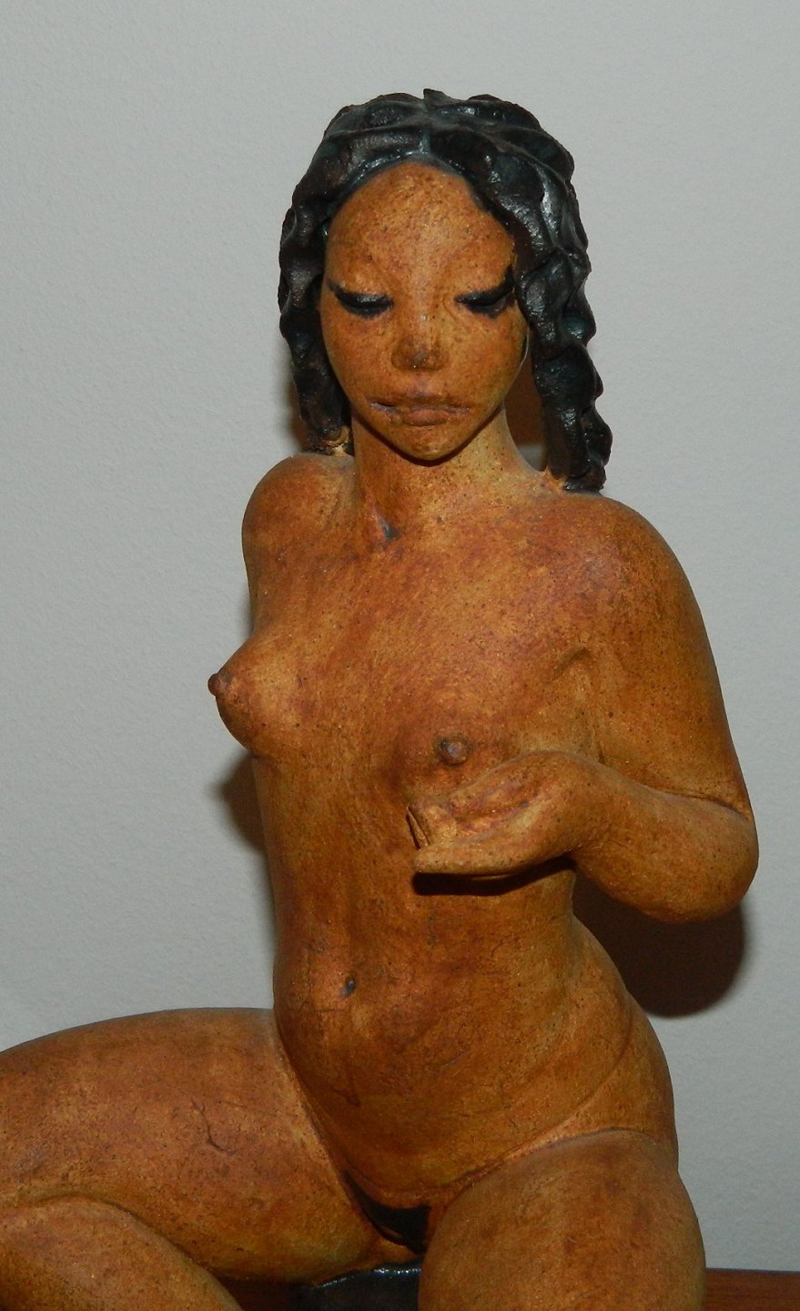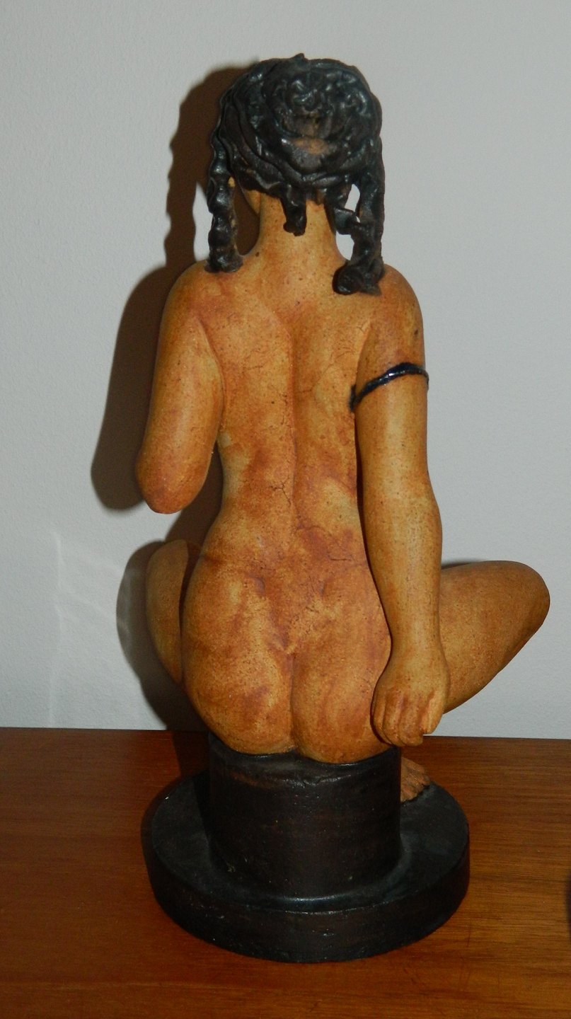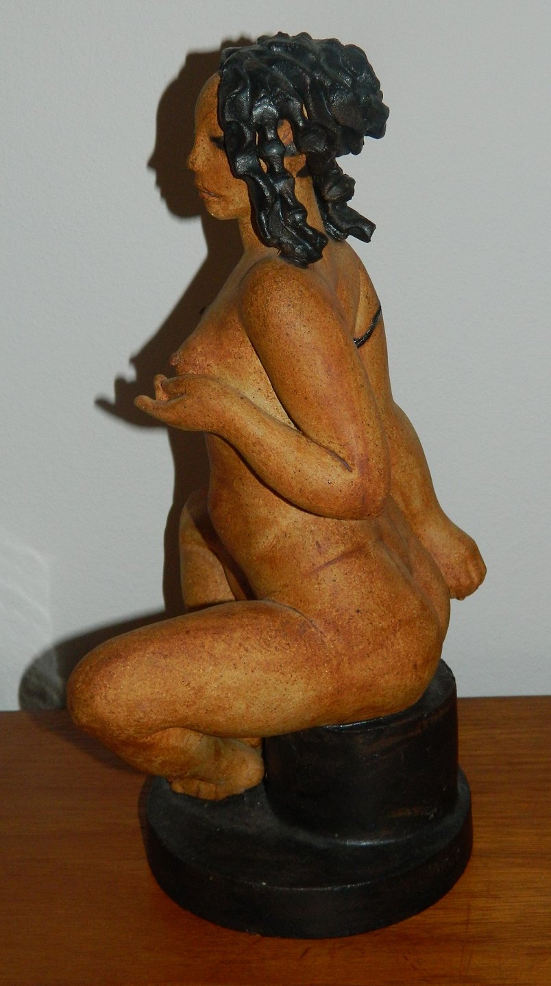 Figur i keramik af ung nøgen kvinde der viser brystet frem. Udført af den danske billedhugger Jacob Bang (1932-2011) i begyndelsen af 1990´erne. Fremstår i perfekt stand uden skader eller reparationer. Signeret JACOB BANG DANMARK. Mål: H. 32½ cm. Soklens diameter er 13½ cm.