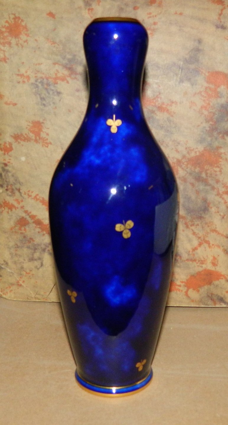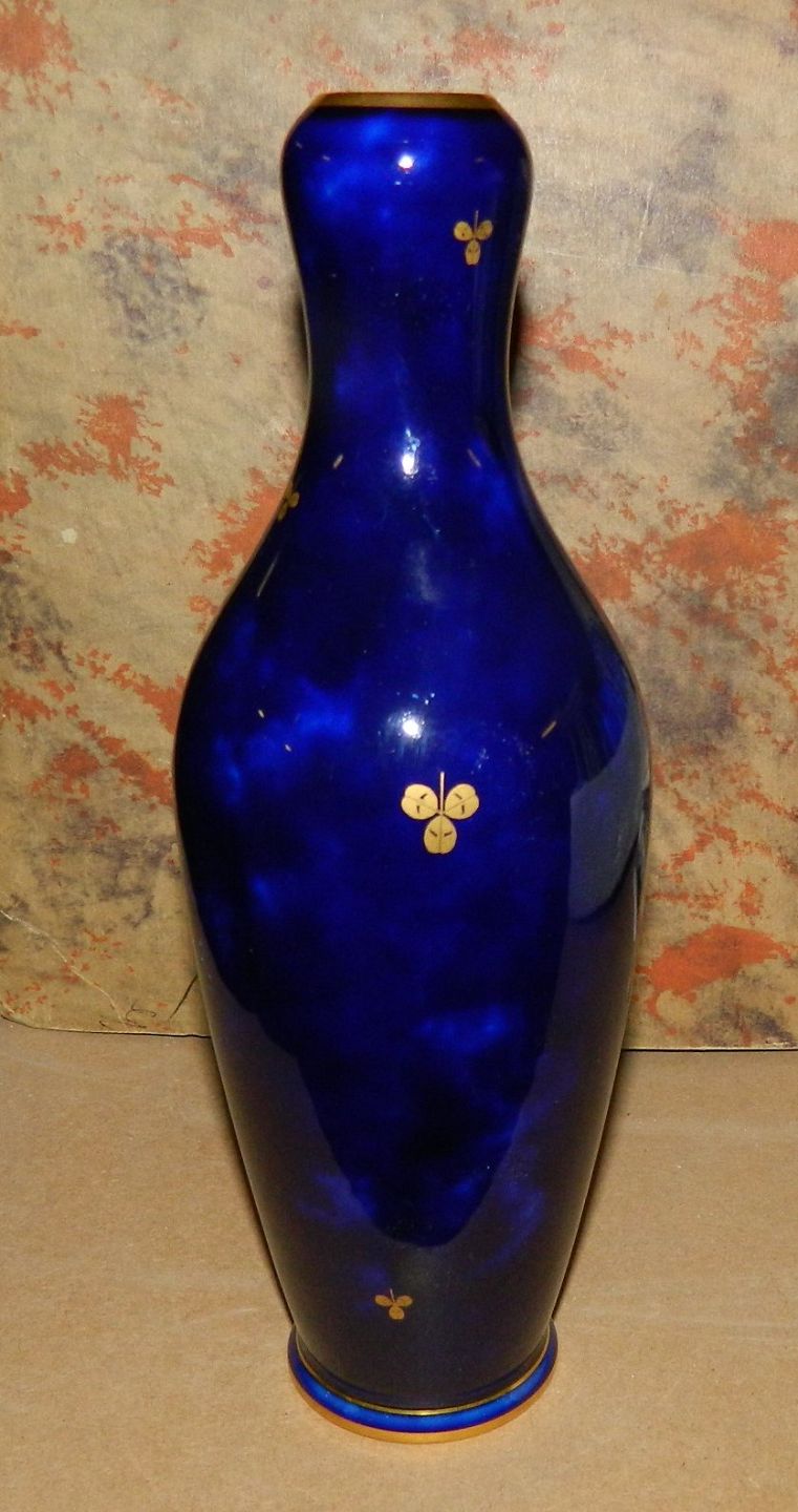Organisk formet vase i porcelæn fra Sevres. Dækket af blå glasur med trekløver dekoration i guld. I perfekt stand. Form og dekoration i Art Nouveau stil. På bunden fabriksstemplet samt 1903. Vase er 24½ cm høj.