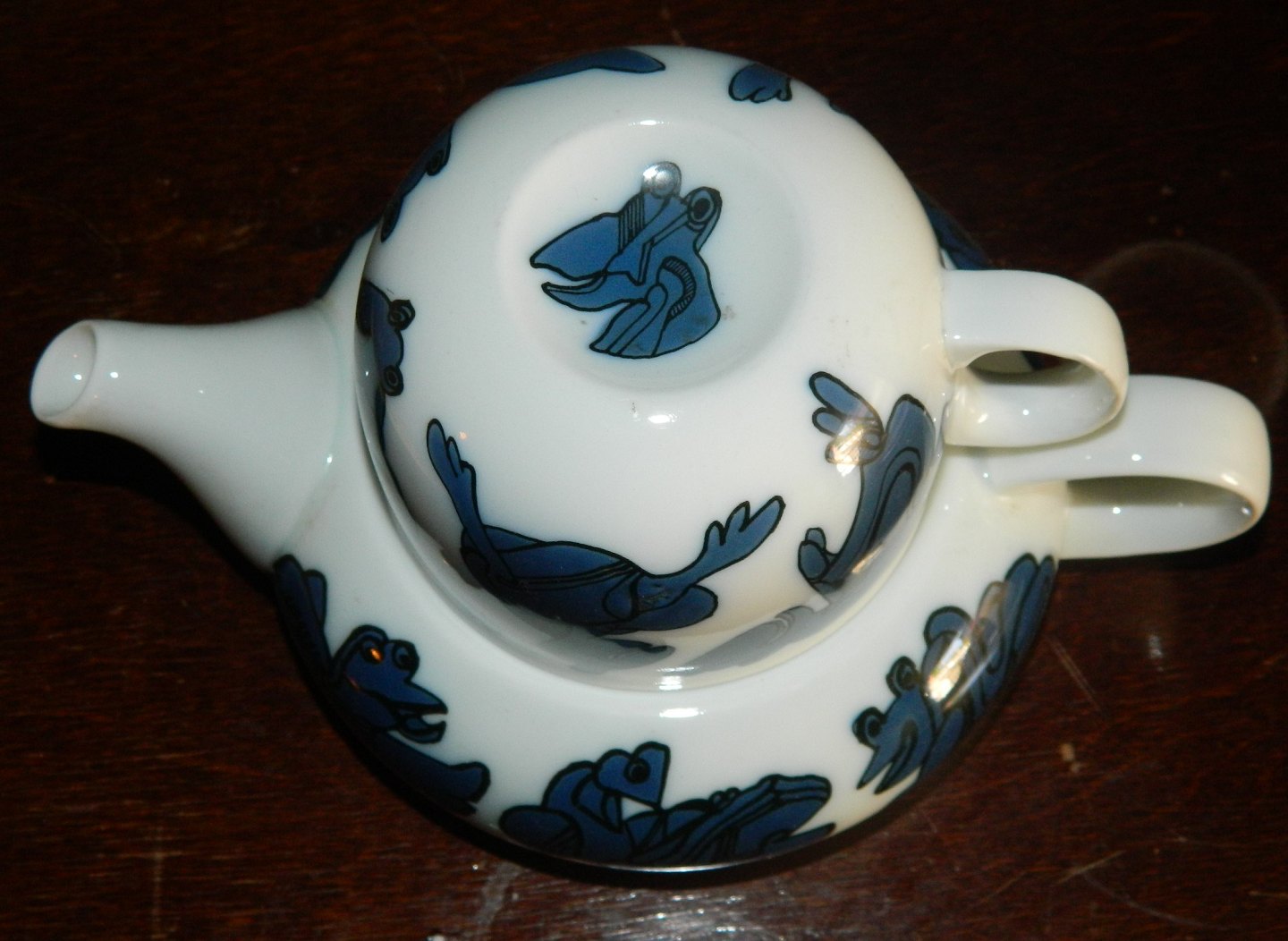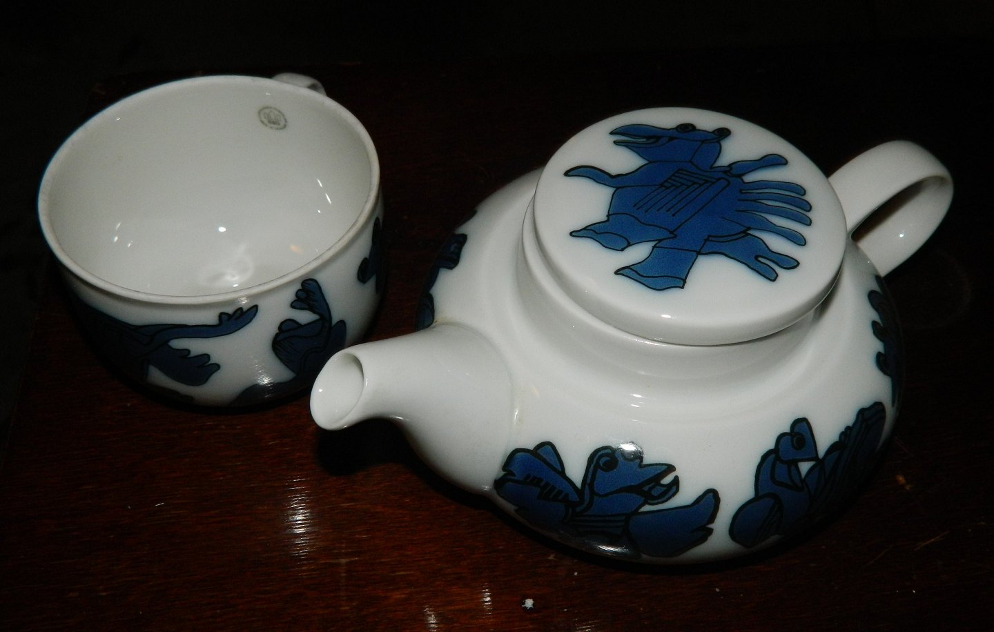 Hvid tepotte i porcelæn fra Bing & Grøndahl. Dekoreret med fabelfigurer i blå farver fra Sten Lykke Madsens fantasiverden. I god stand. 1. sortering. Alle dele fabriksmærkede. Mål: H. 11½ cm og 21 cm lang. Koppens åbningsdiameter er 9 cm.