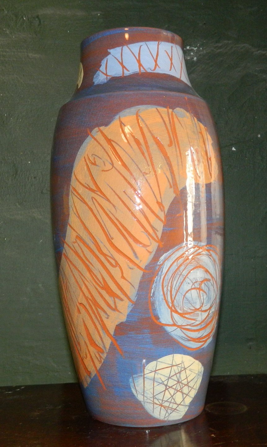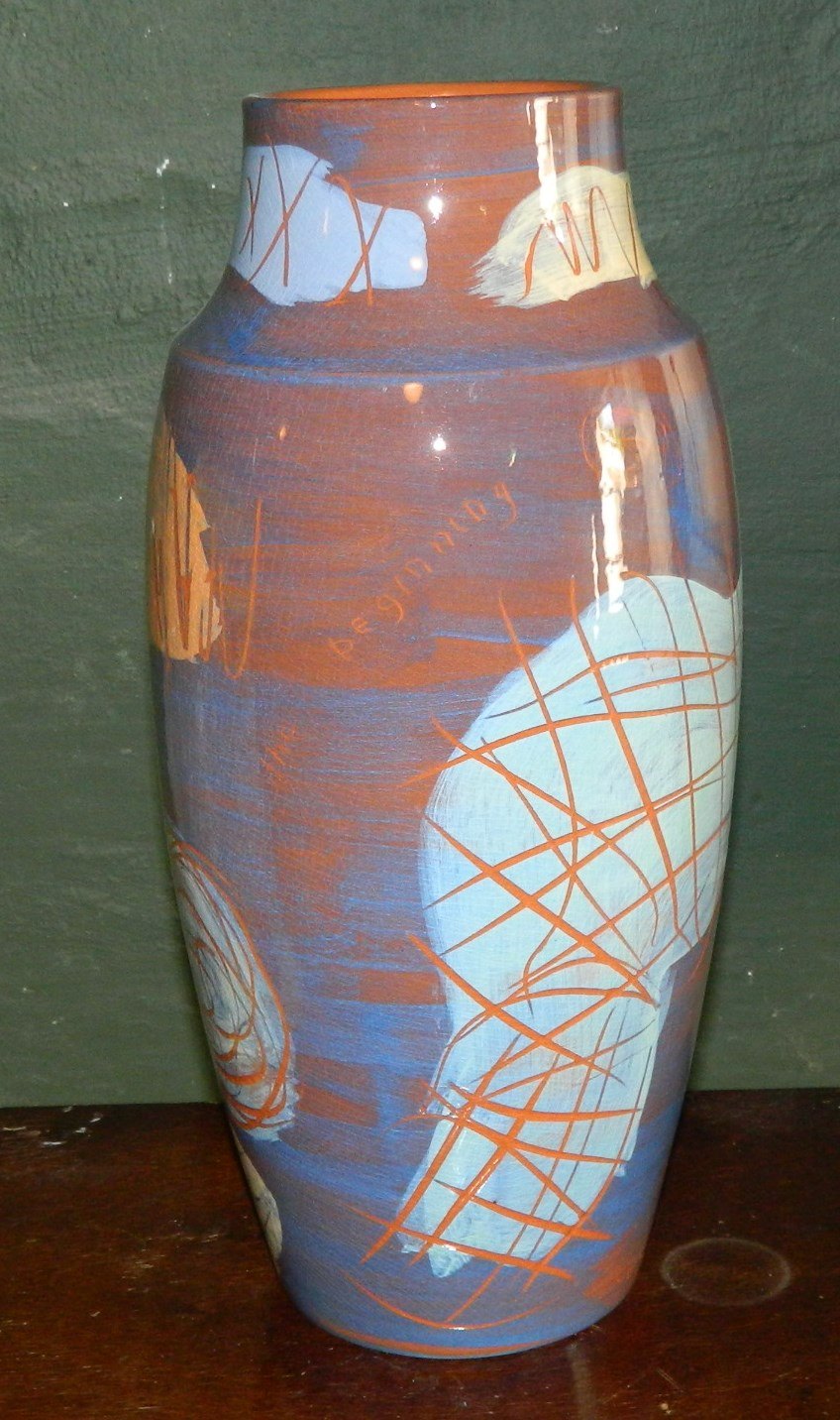 Stor vase i keramik fra Kähler fabrikken i Næstved. Dekoration af Ole Bach Sørensen omkring 2000. Fremstår i god stand. Ingen skader eller reparationer. Mål: 39½ cm høj.