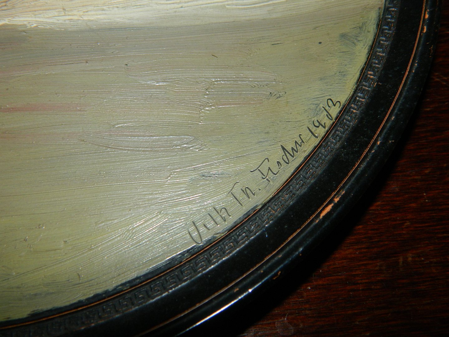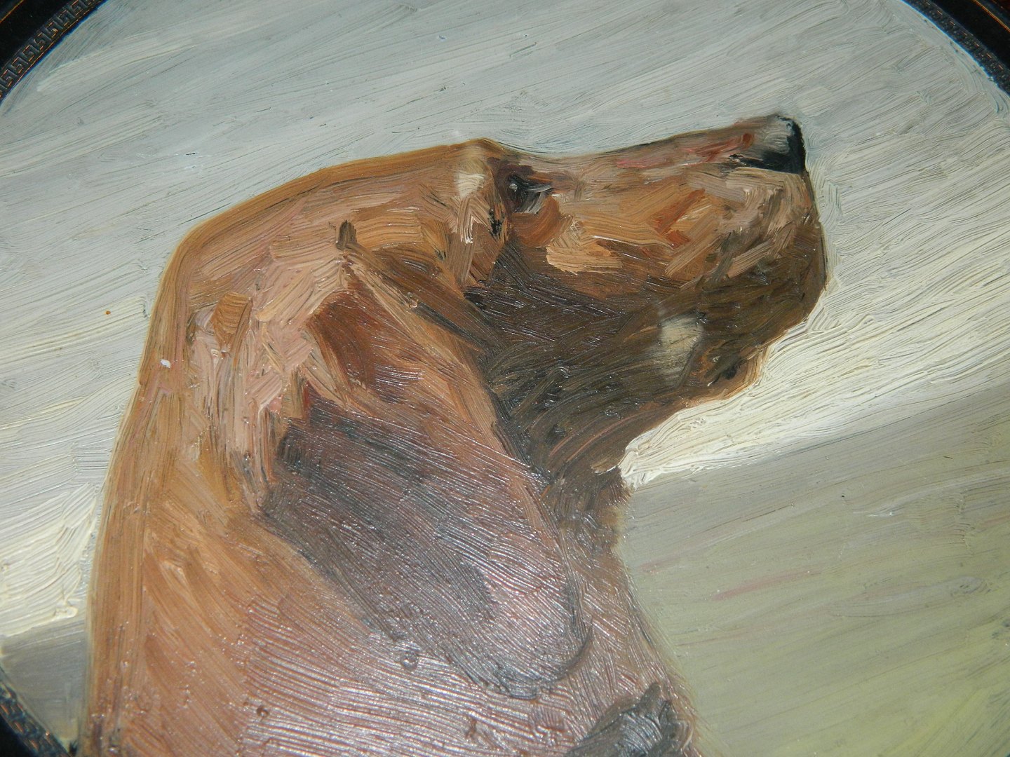 Bemalet portræt af pointer hund af den danske kunstner Vilhelm Th. Fischer (1857-1928). Han har især malet og tegnet dyr fra den danske natur. Endvidere skaberen af flere store arbejder af bl.a. fugle i porcelæn for Royal Copenhagen. Her har kunstneren brugt olie maling på en terracotta platte fra den københavnske keramikfabrik Peter Ipsen til sit portræt. Motivet er signeret af kunstneren med navnetræk samt fremstillingsår 1913. Overfladen af motivet i god stand. På bagsiden ses et par små skår på inderkanden på platten (se foto). Platten fabriksmærket på bagsiden. Mål: 24½ cm i diameter.