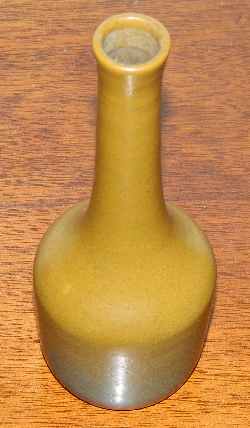 Langhalset vase i keramik fra skønvirkeperioden i Danmark fra P. Ipsen´s Enke. Produceret omkring 1920. Dækket af en olivengrøn gullig glasur. Fremstår i perfekt stand uden skader eller reparationer. Fabriksmærket på bunden. H. 18½ cm.