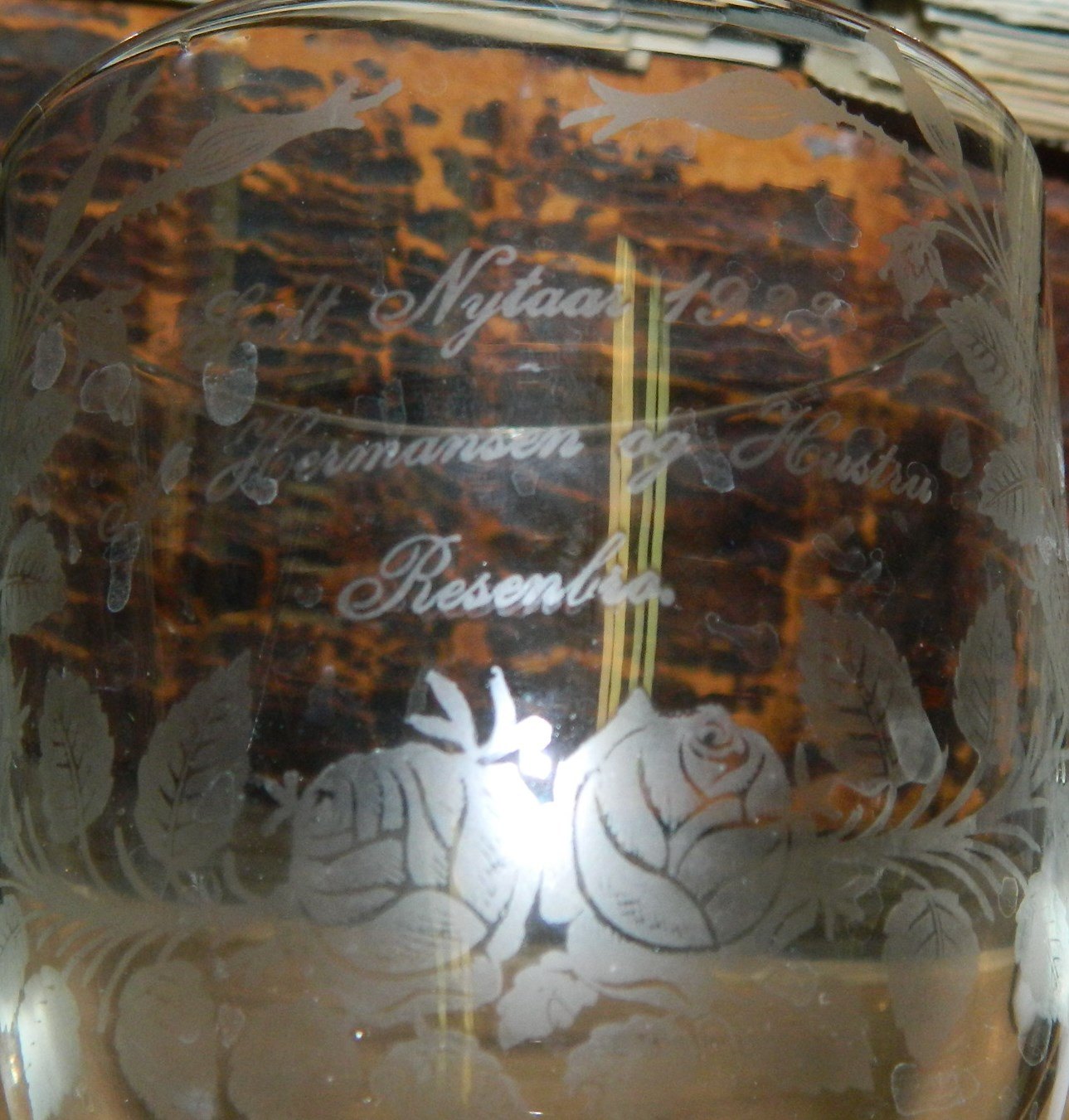 Erindringsglas fra Kastrup Glasværk med teksten: "Godt Nytaar 1933 A. Hermansen og Hustru Resenbro". I perfekt stand. H. 15,5 cm.
