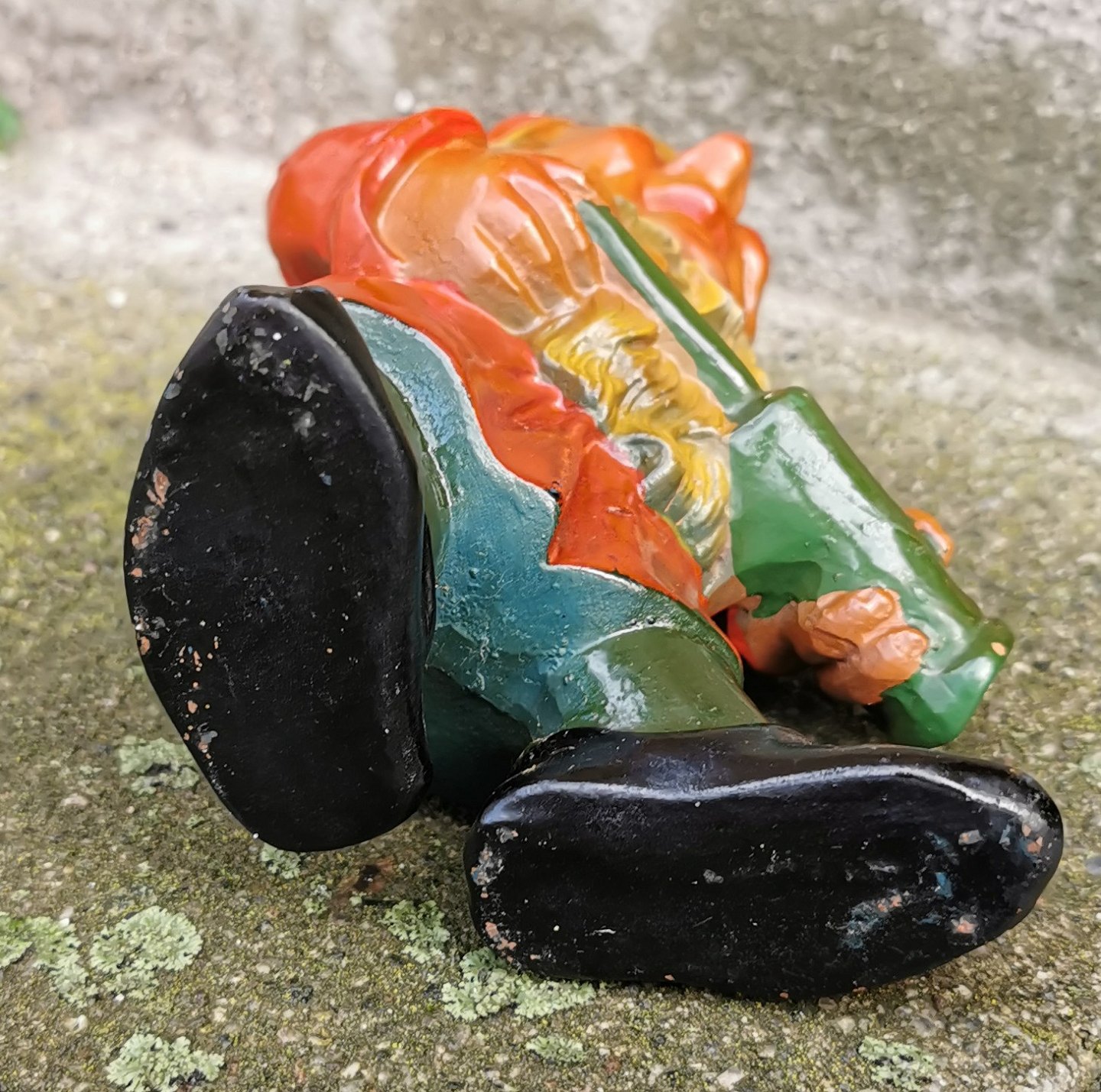 Bemalet nisse i keramik med bollesprøjte med funktion som sparebøsse. Fremstillet omkring 1900. Lidt småskår ved "møntrevnen". Ellers intet at bemærke. H. 16 cm.