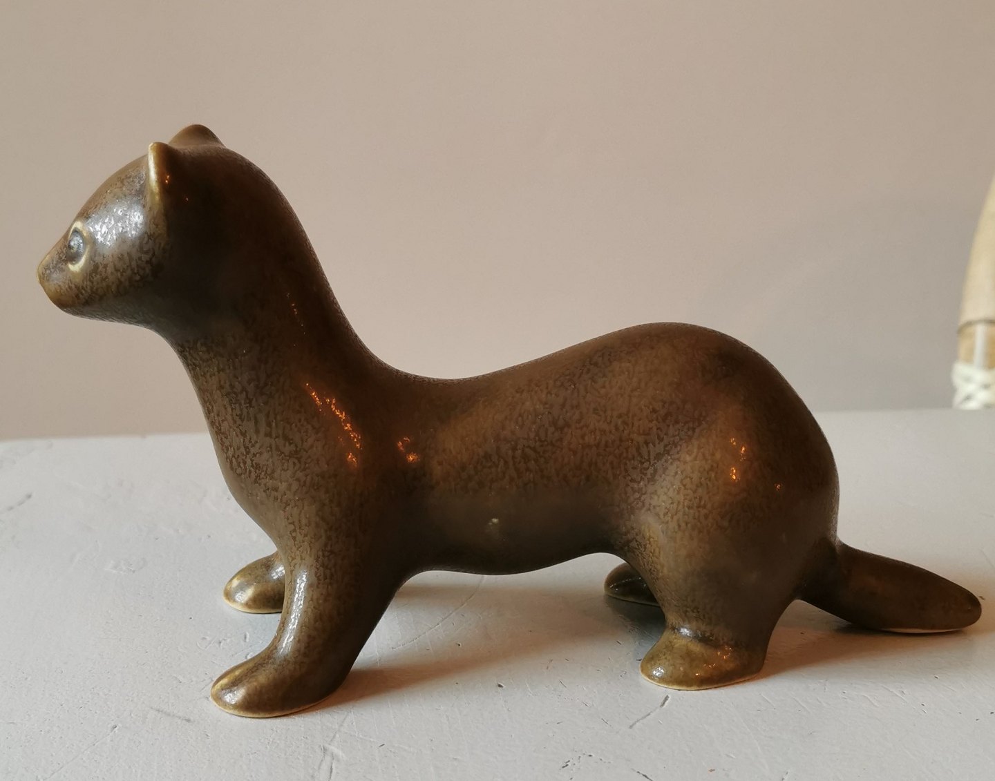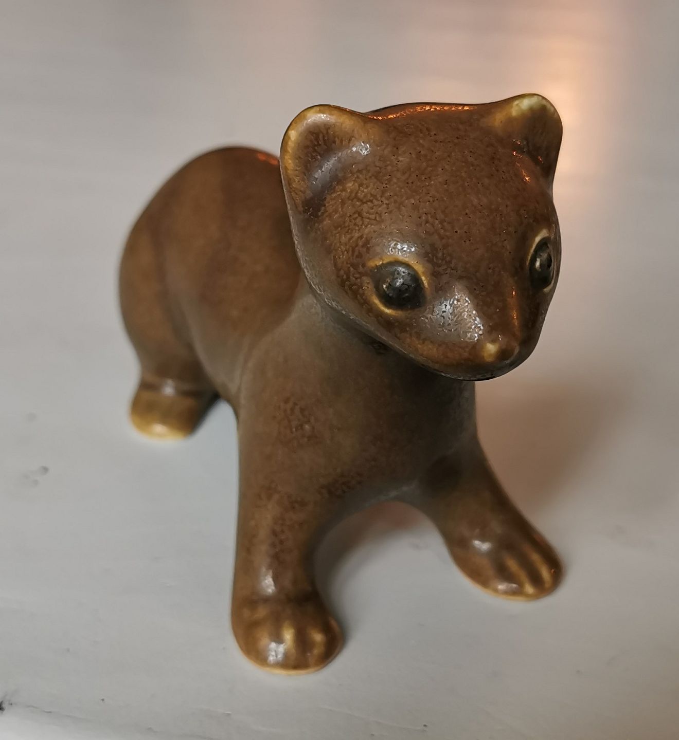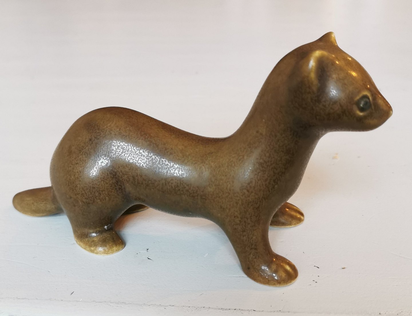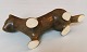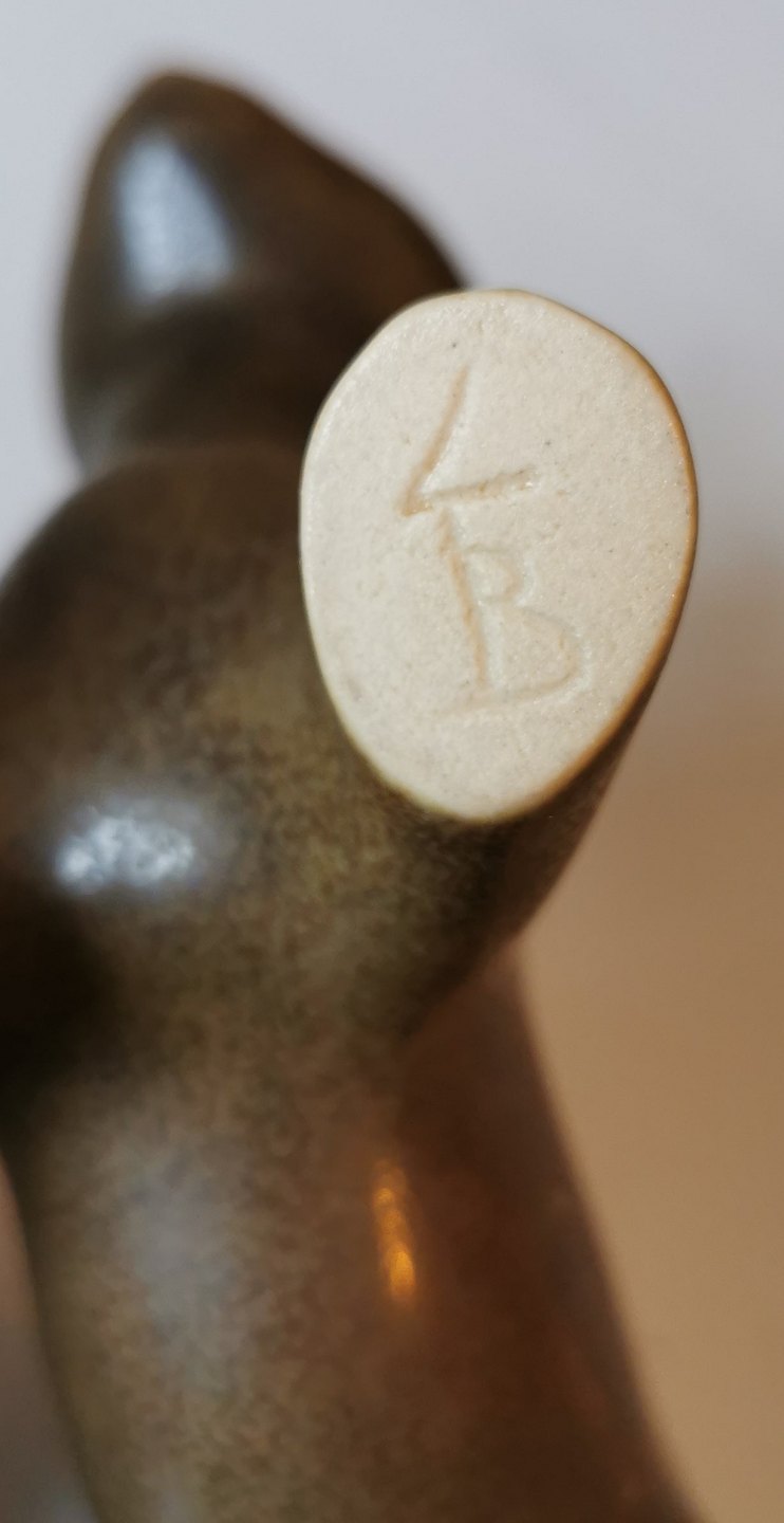 Figur i keramik af Knud Basse, Bornholm. Dækket af brun harepels glasur. I perfekt stand. Signeret KB under venstre forben. H. 11 cm L. 19 cm.
