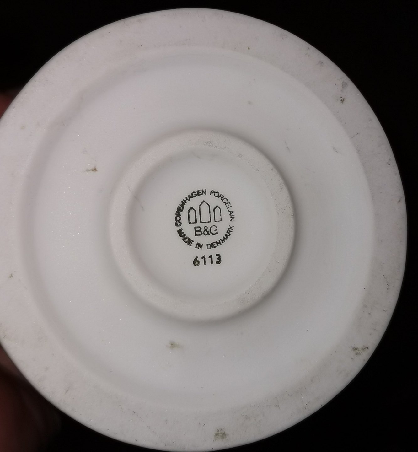 Urtepotteskjuler i porcelæn fra Bing & Grøndahl. Dekoreret med to motiver af Bertel Thorvaldsen (1770-1844). 1. "Psyke nærmer sig med lampen til den sovende Amor". 2. "Amor forlader den sovende Psyches leje". Fabriksmærket på bunden. H. 12 cm