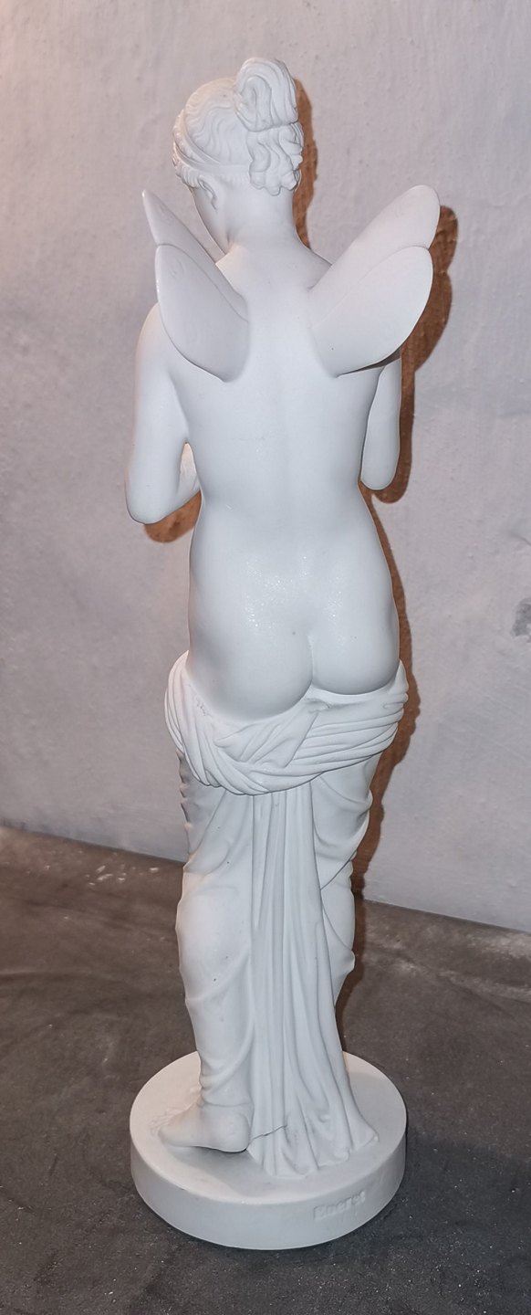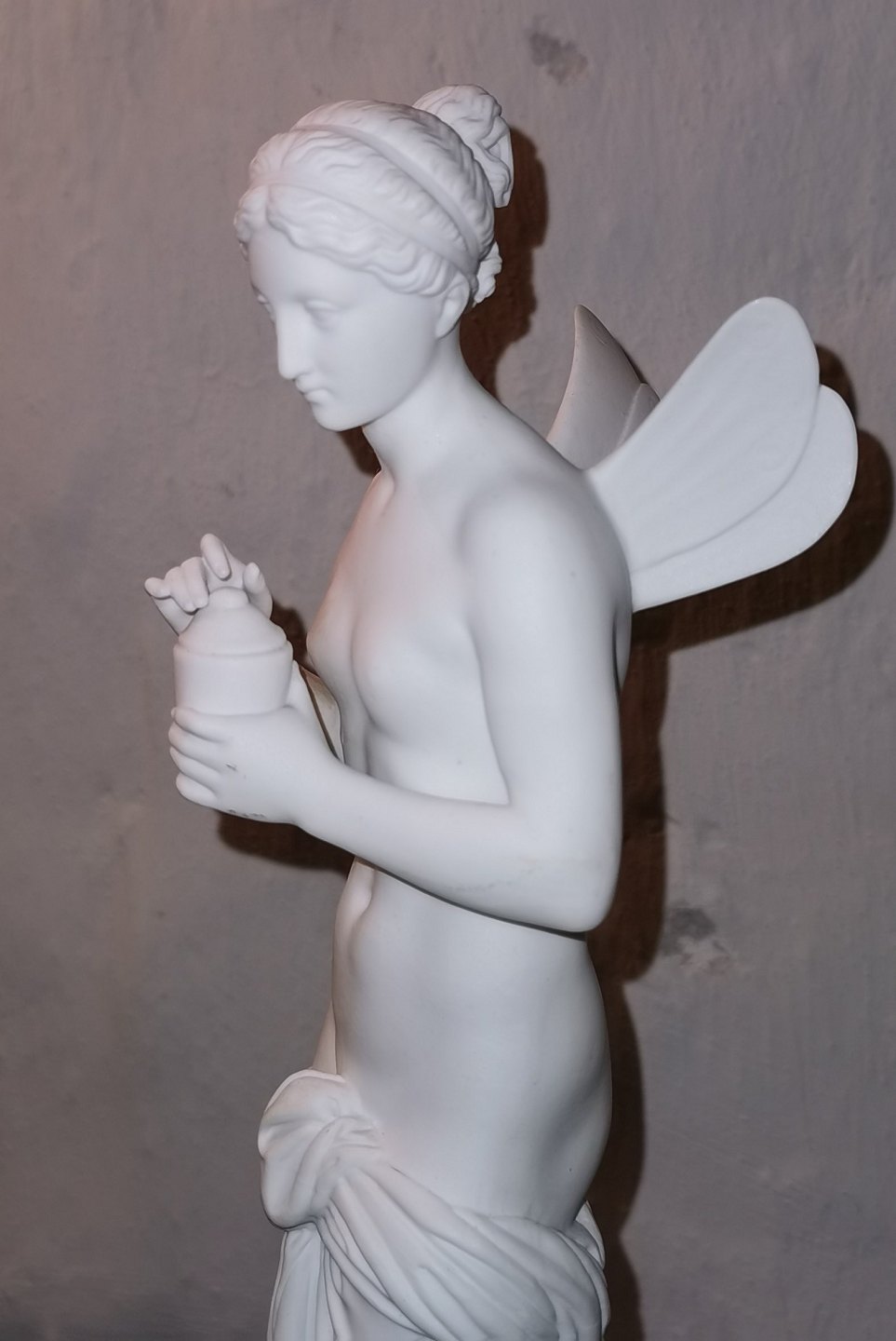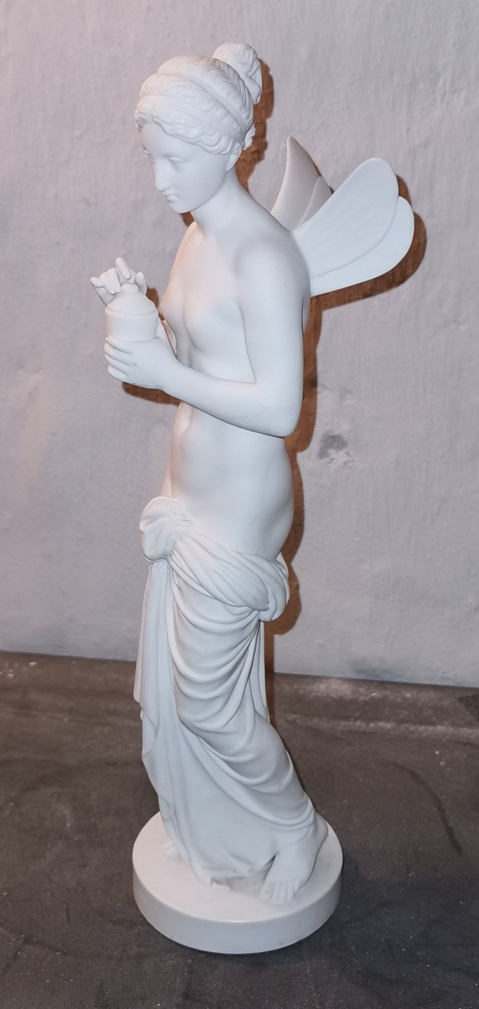 Figur i bisquit porcelæn af Bertel Thorvaldsen (1770-1844) for Royal Copenhagen. Forestillende Psyke med skønhedssalven. Fremstillet i slutningen af 19. århundrede. Fremstår i god stand. Fabriksmærket på bunden. H. 32 cm.