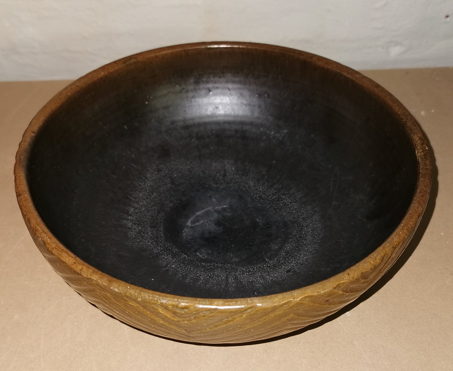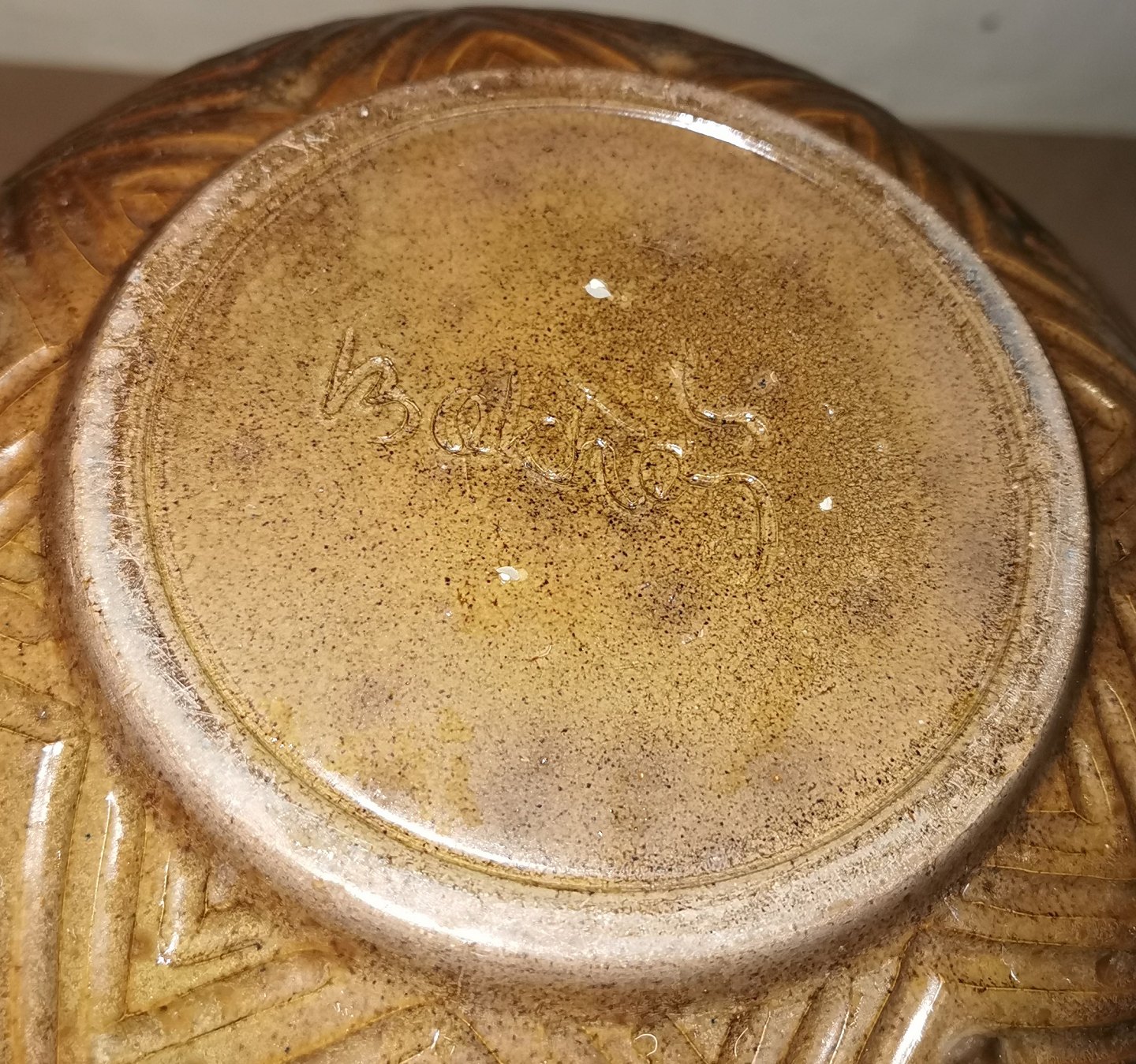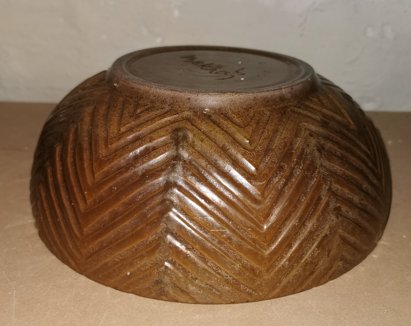 Brun glaseret skål i keramik med sildebensmønster (Axel Salto stil) af Poul Bækhøj (f.1942-). I perfekt stand. Kunstnersignatur på bunden. Mål: H. 9½ cm Ø. 24½ cm.