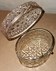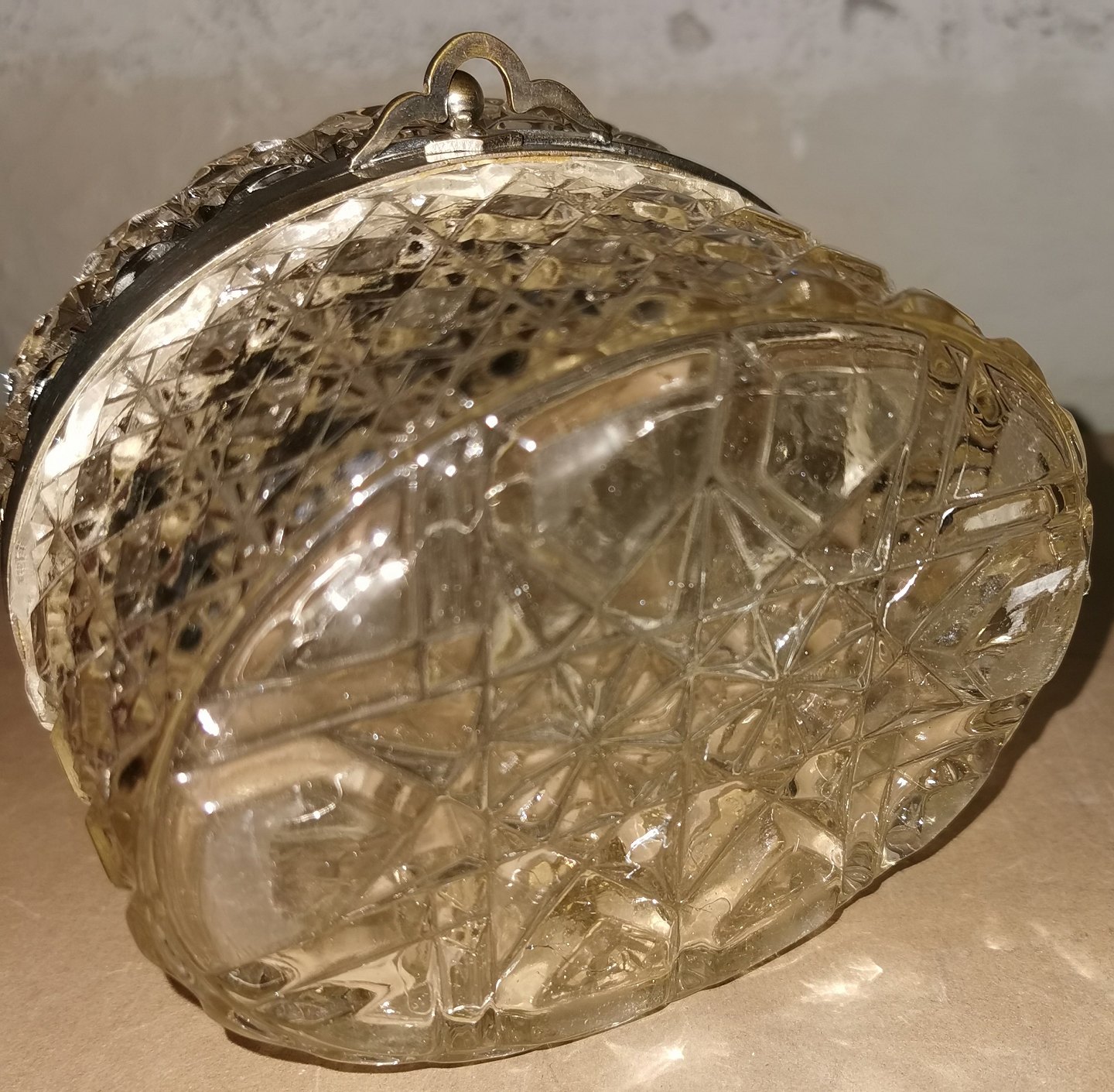 Sukkerskrin i glas: Ovalt sukkerskrin i krystalglas med metalmontering. Produceret omkring 1900. Ingen skader eller reparationer. Mål: H. 9½ cm B. 13 cm L. 15 cm.