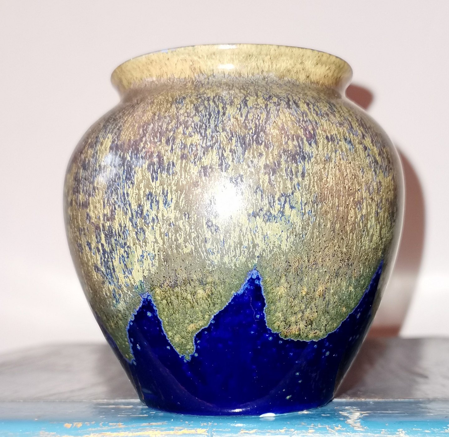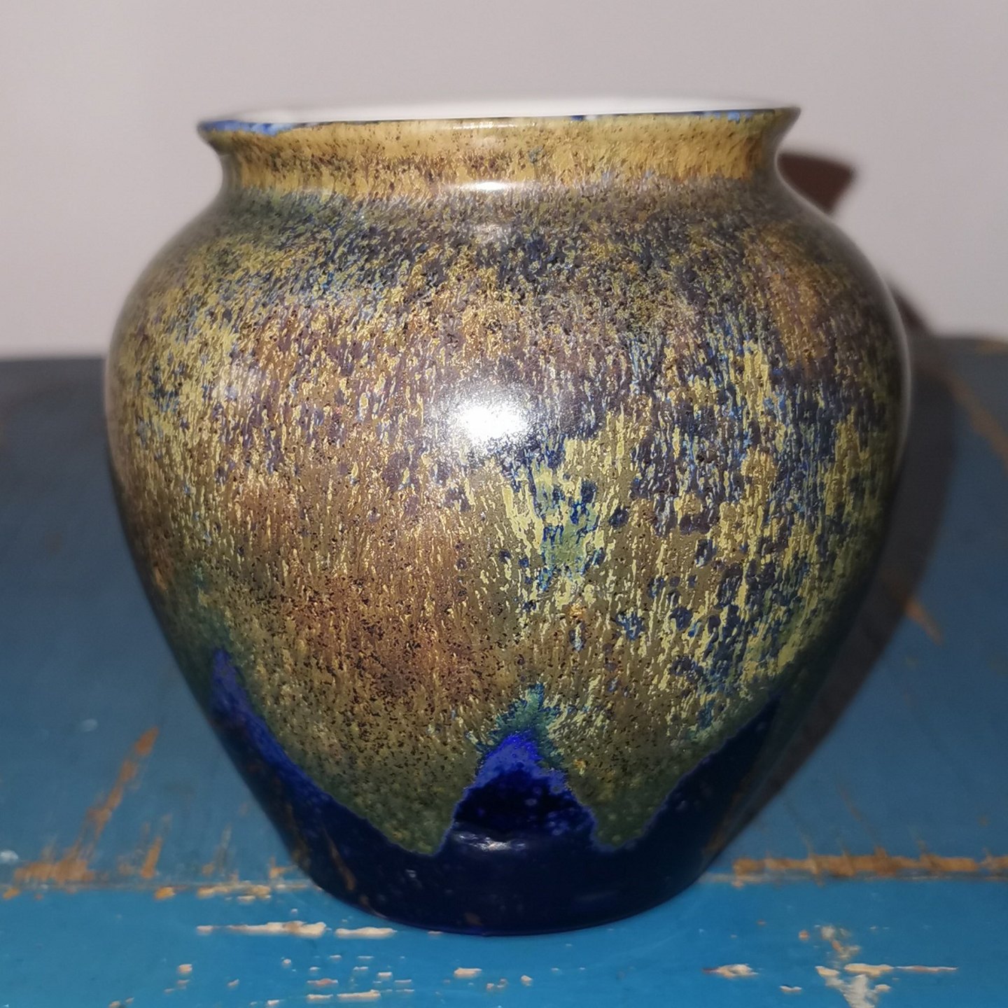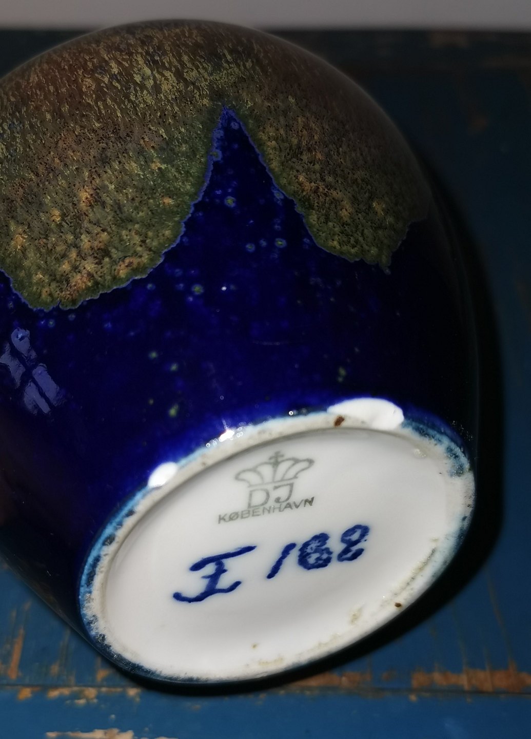 Vase i porcelæn med krystalglasur. C. F. Ludvigsen (1883-1963) for Dahl Jensen. Fabriksmærket samt kunstnersignatur og modelnummer på bunden. Som det fremgår af billederne ses to skår på undersidens kant. Derudover intet at bemærke ! Mål: 11 cm høj.