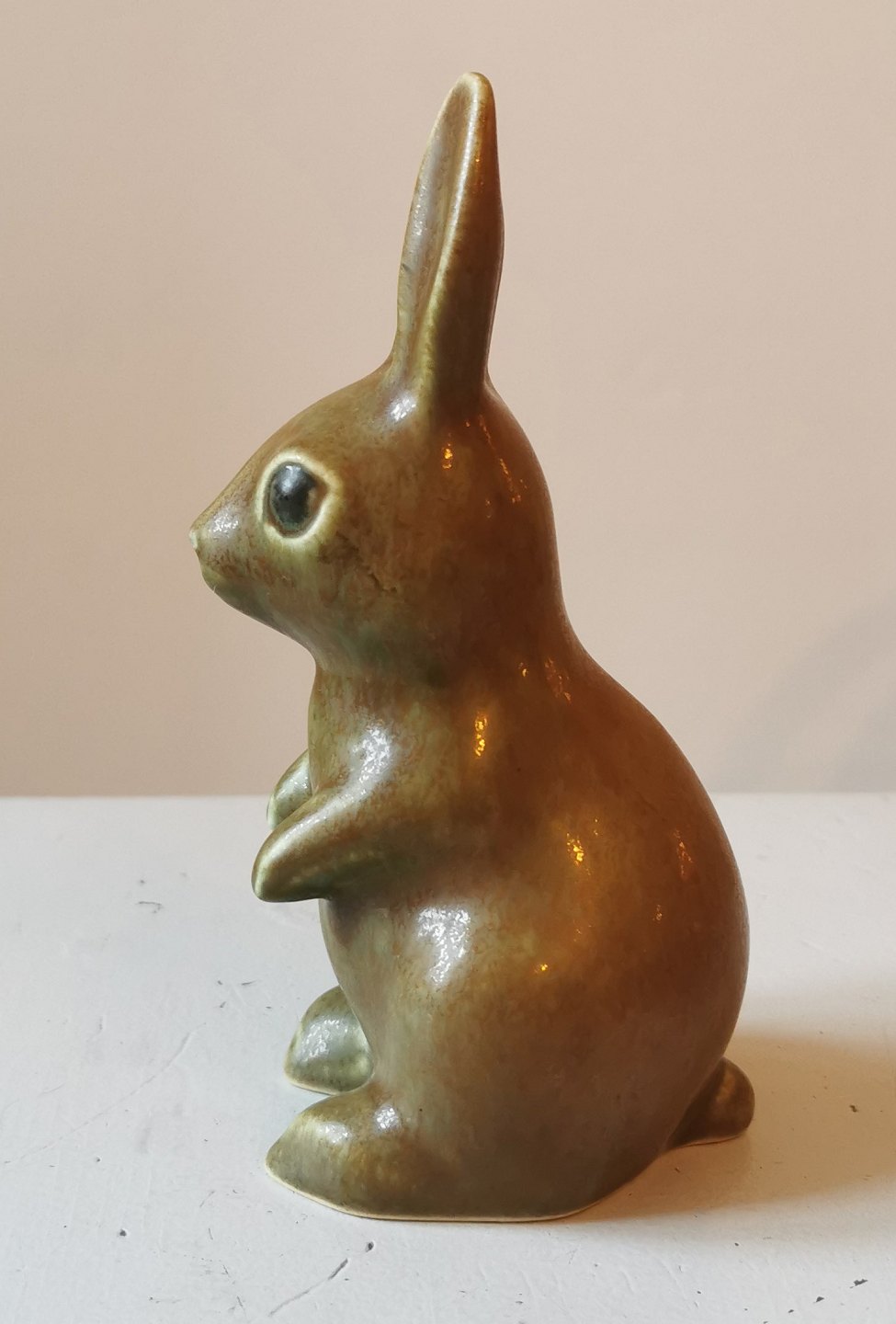 STOR FIGUR i keramik af kanin unge af Knud Basse, Vang, Bornholm. Dækket af en brug harepelsglasur. Fremstår i god stand uden skader eller reparationer. H. 16½ cm. Kunstnersignatur KB på undersiden.