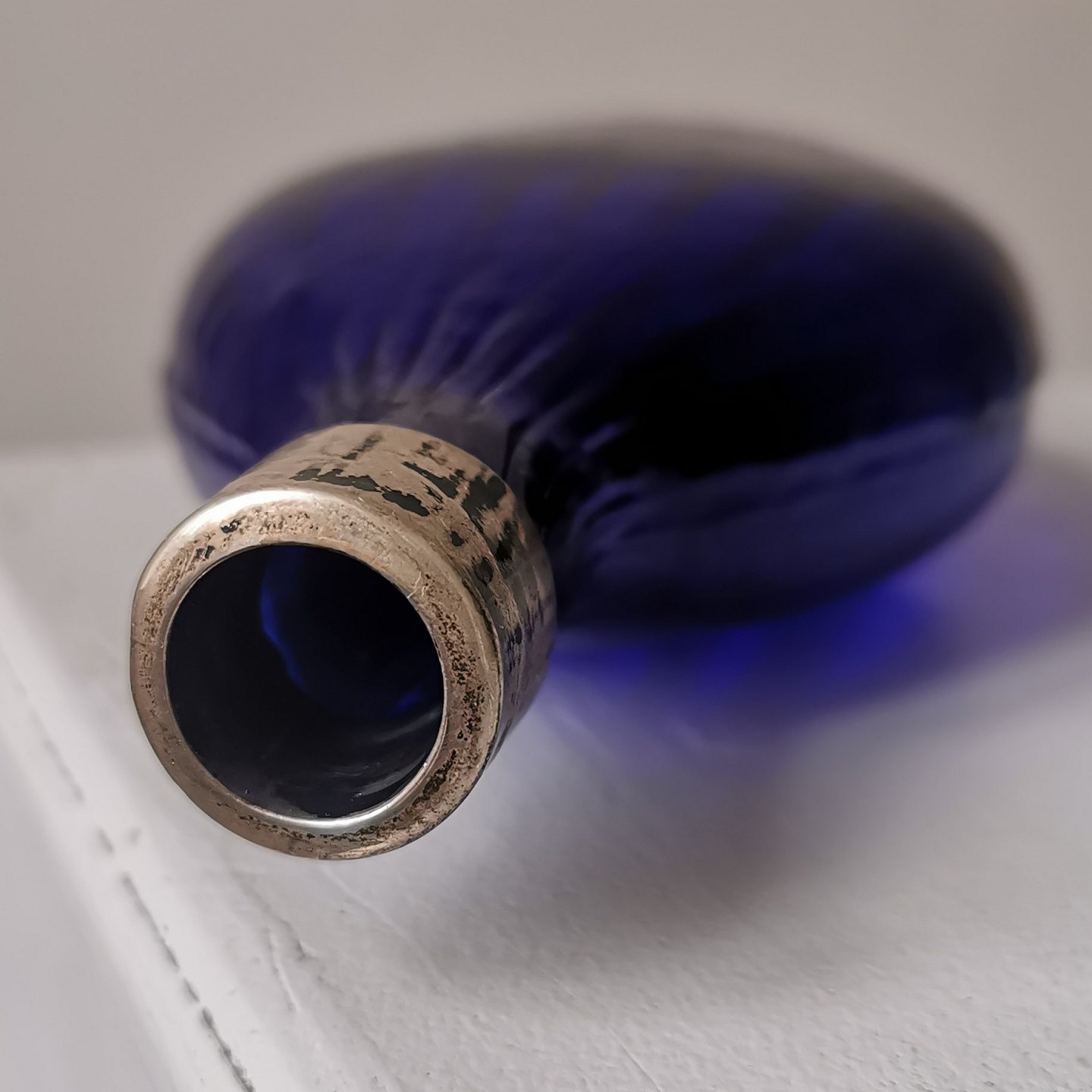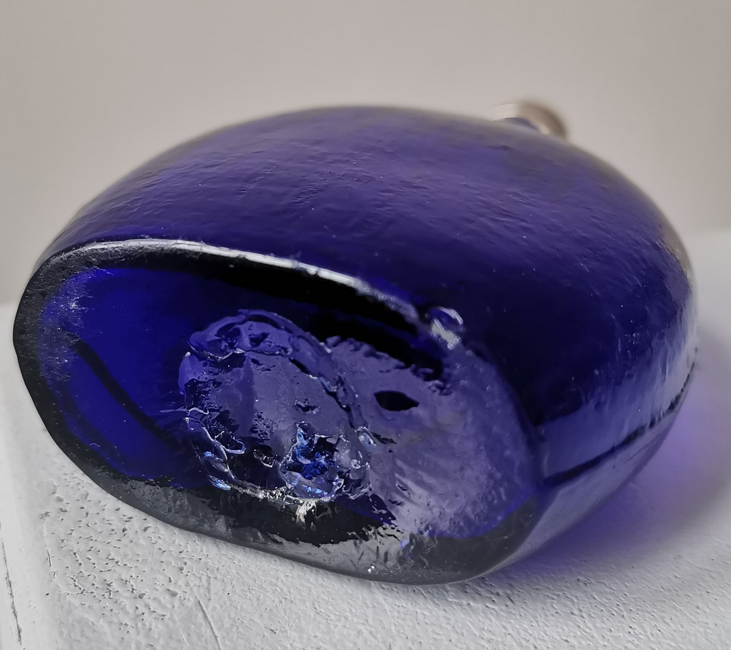 Antik lommelærke: Lommeflaske i blåt glas fra Holmegaard Glasværk anden halvdel af 19. århundrede. Monteret sølvtop, formodentlig grundet skade. Har endvidere skår på bundens kant. H. 15½ cm.