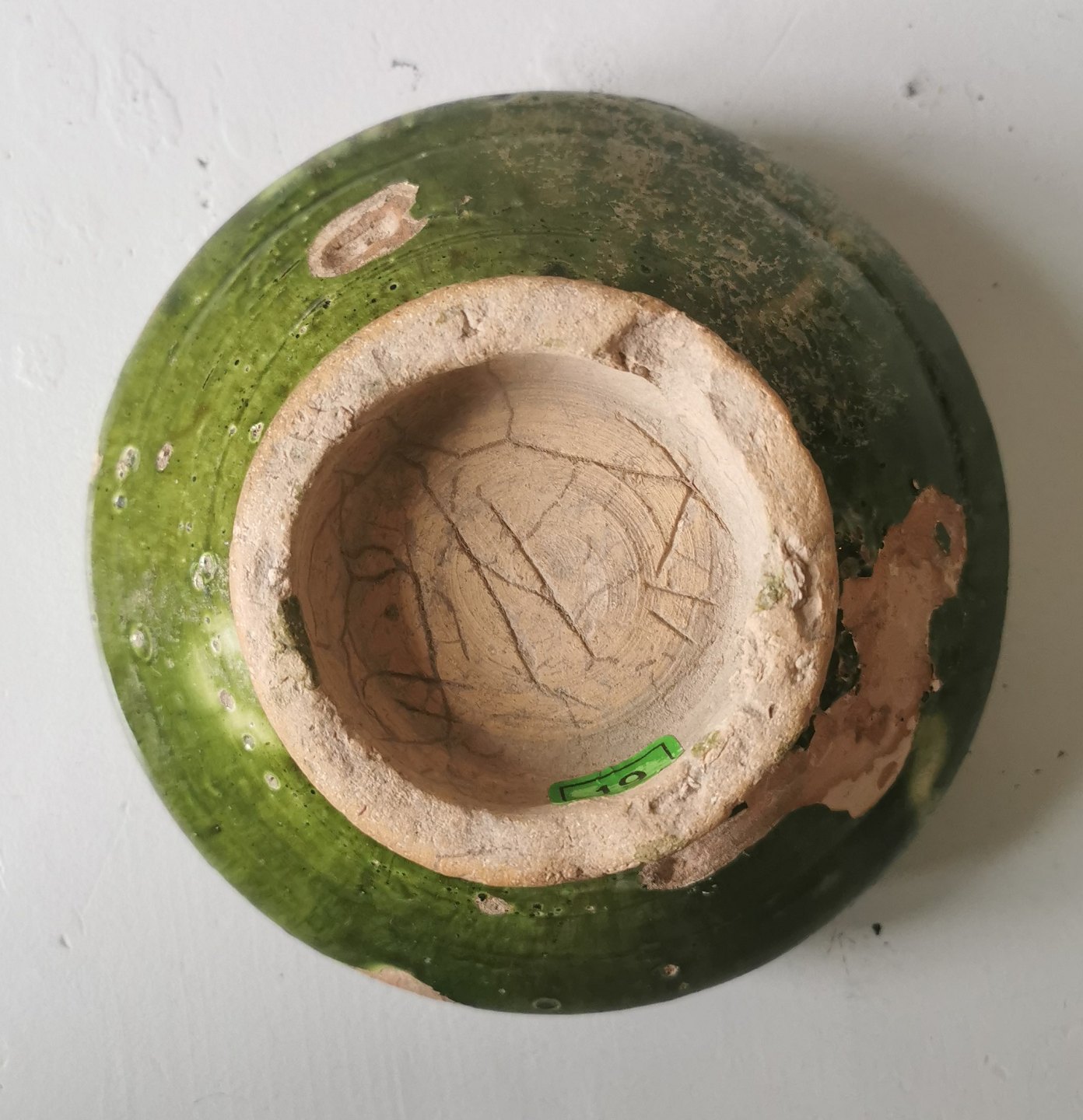 Charmerende skål i lertøj med indridset dekoration af fugl i bunden af skålen. Tillige glaseret. Delvist afskalninger af glasuren som billederne viser. Endvidere "slag" eller skår på siden. Formoder den i hvertfald er fremstillet i 19. århundrede måske endda noget tidligere. H. 9½ cm top diameter på 15 cm
