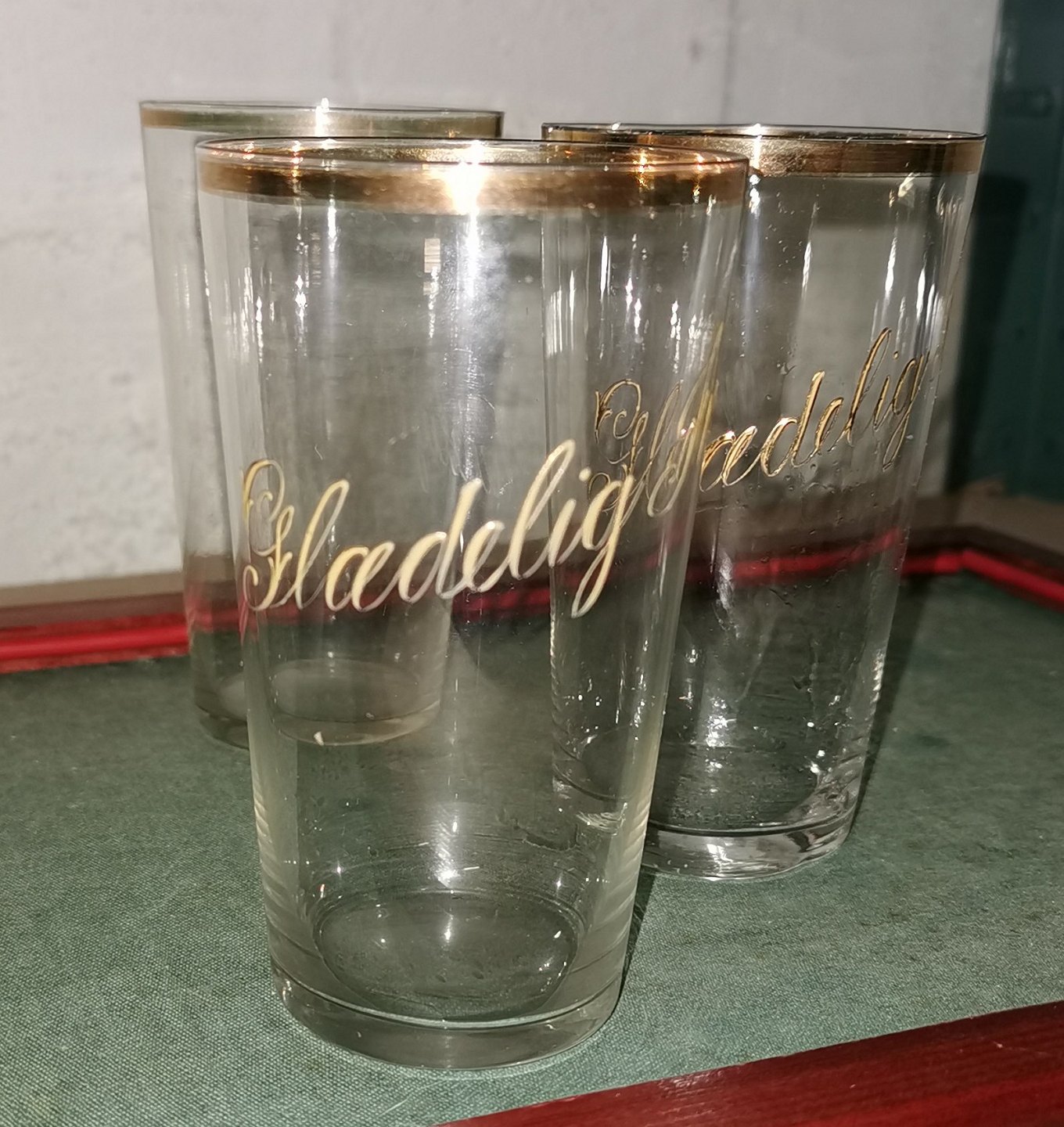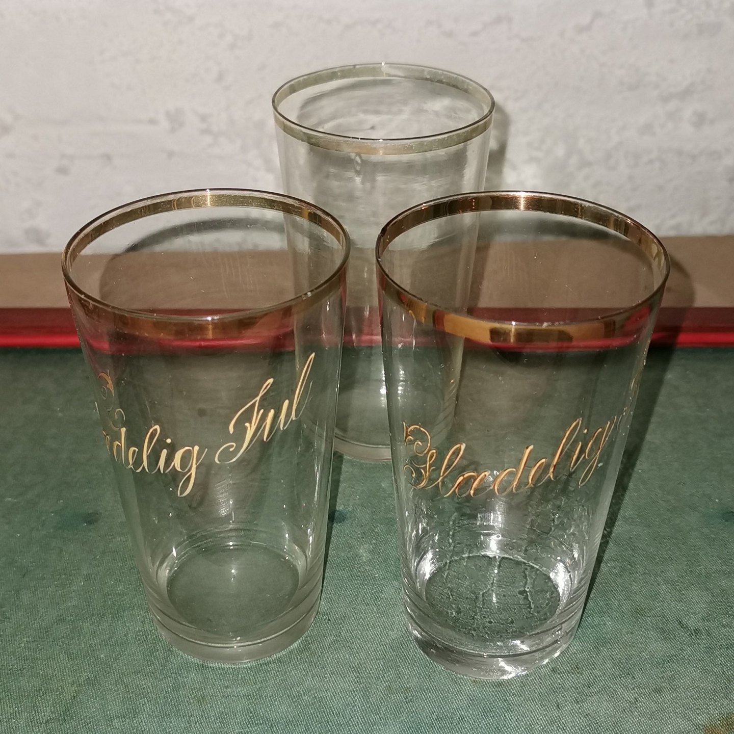 Tre glas fra Fyens Glasværk. To med julehilsen "Glædelig Jul" i emalje. Alle tre i god stand uden skader eller reparationer. H. 12 cm.