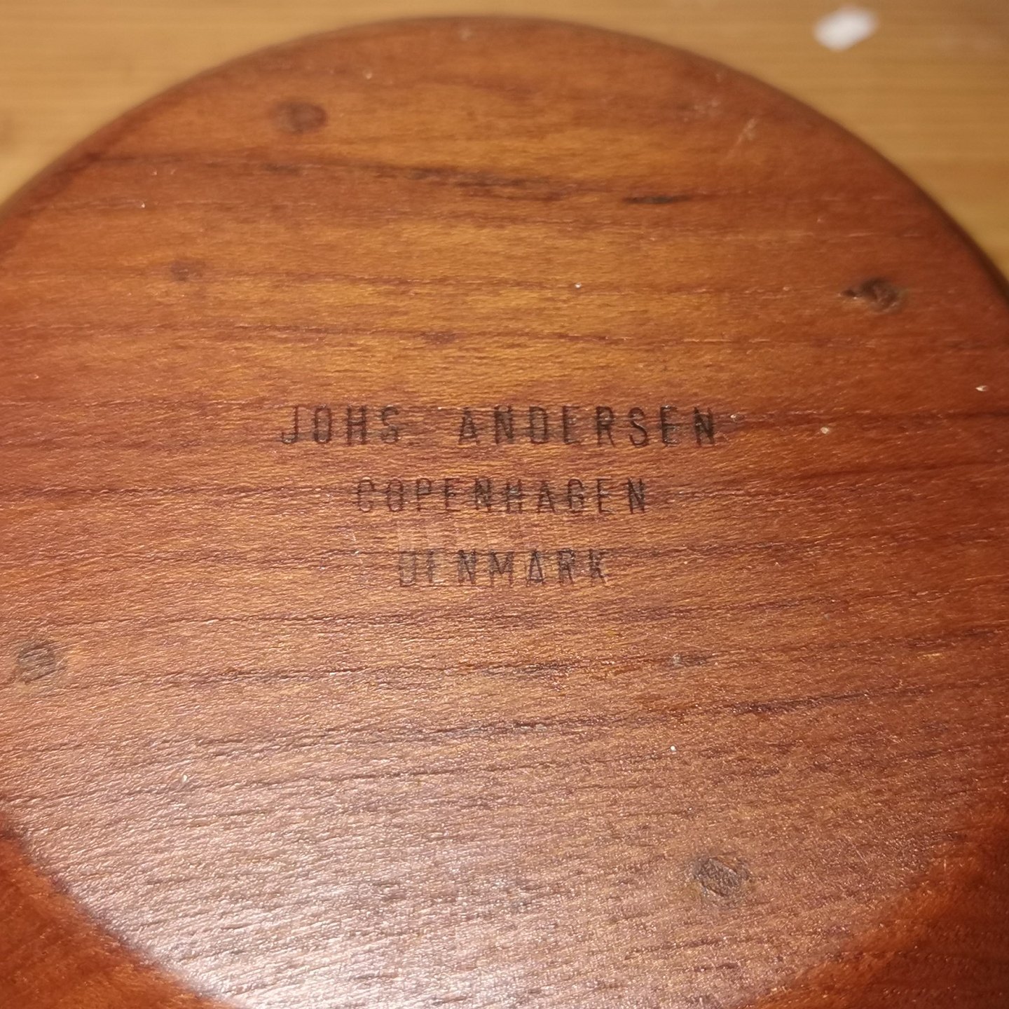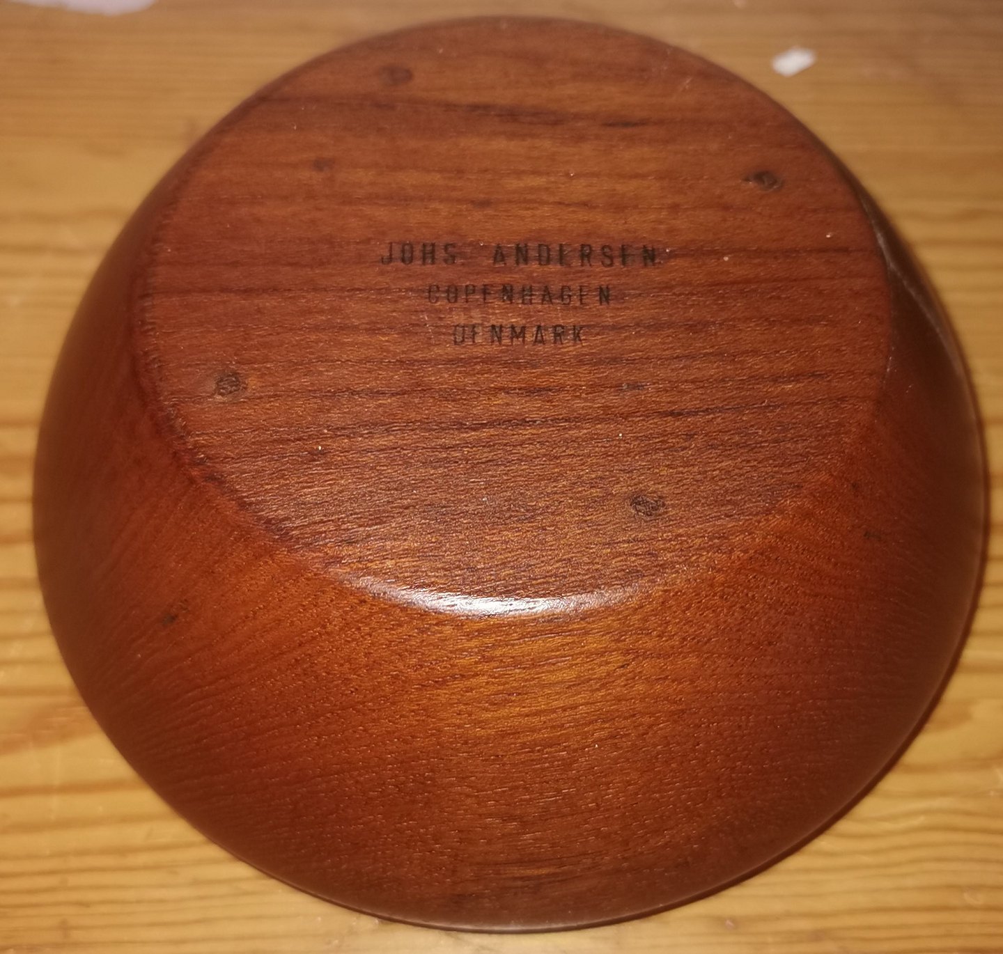 Teak skål designet af møbelarkitekt Johannes Andersen. Fremstår i god stand uden skader eller reparationer. På bunden stemplet: JOHS. ANDERSEN COPENHAGEN DENMARK. Mål: H. 7½ cm. Åbningens diameter er 15½ cm.