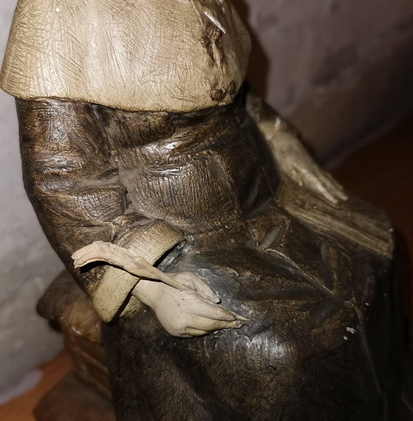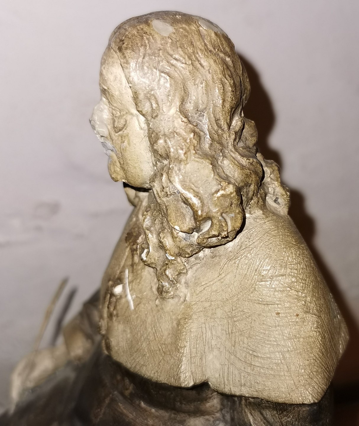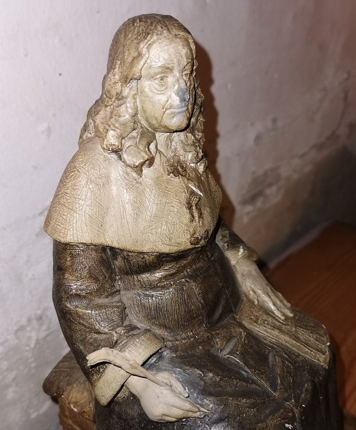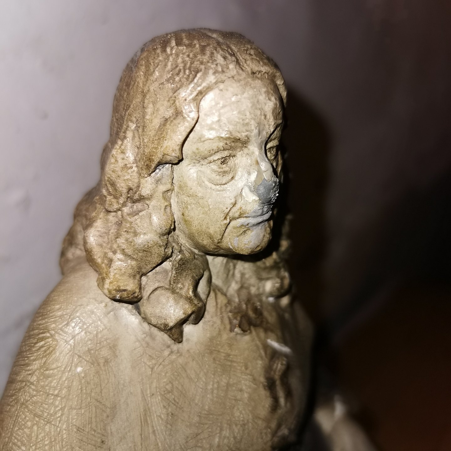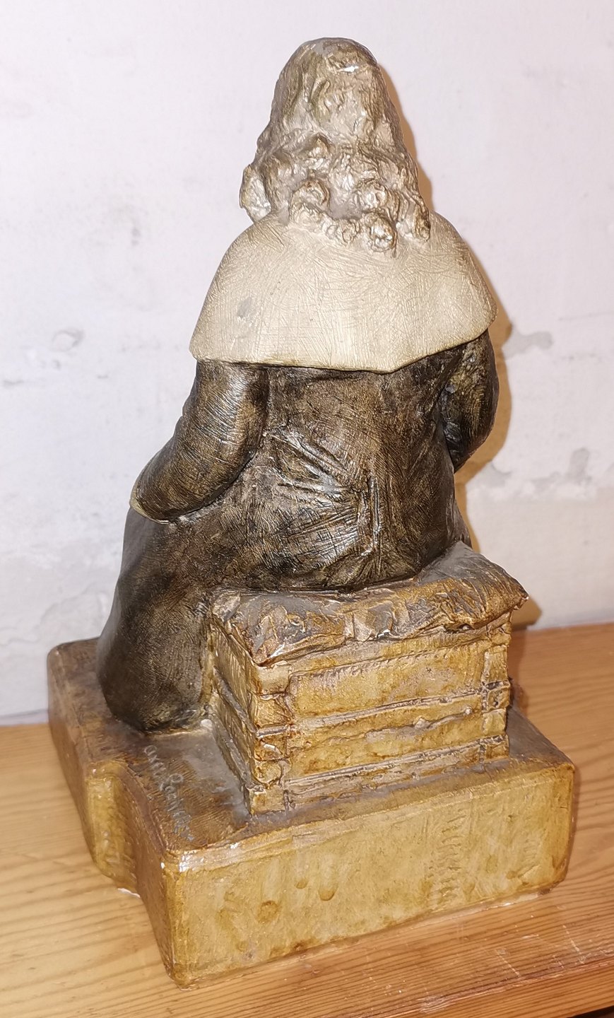 Figur i bemalet gips forestillende Leonora Christina i Blåtårn (på Københavns Slot, hvor Christiansborg nu ligger), med fjerpen i højre hånden, hvor hun skriver Jammersminde. Tilskrives Axel Locher (1879-1941), der bl.a. kendes for at have skabt en serie af lignende figurer fra Holbergs komedier. Figuren har defekt på næsen og på kanten af papirerne hun sidder med i venstre hånd. Ikke signeret ! Figuren er 30 cm høj og basen måler 18 x 18 cm.