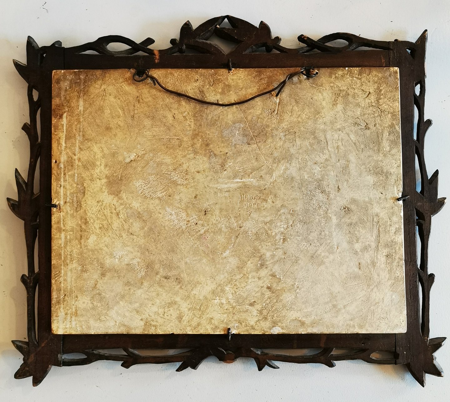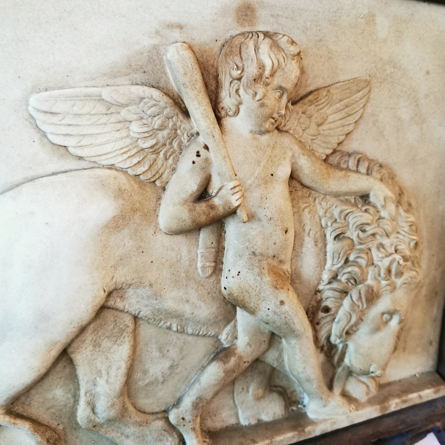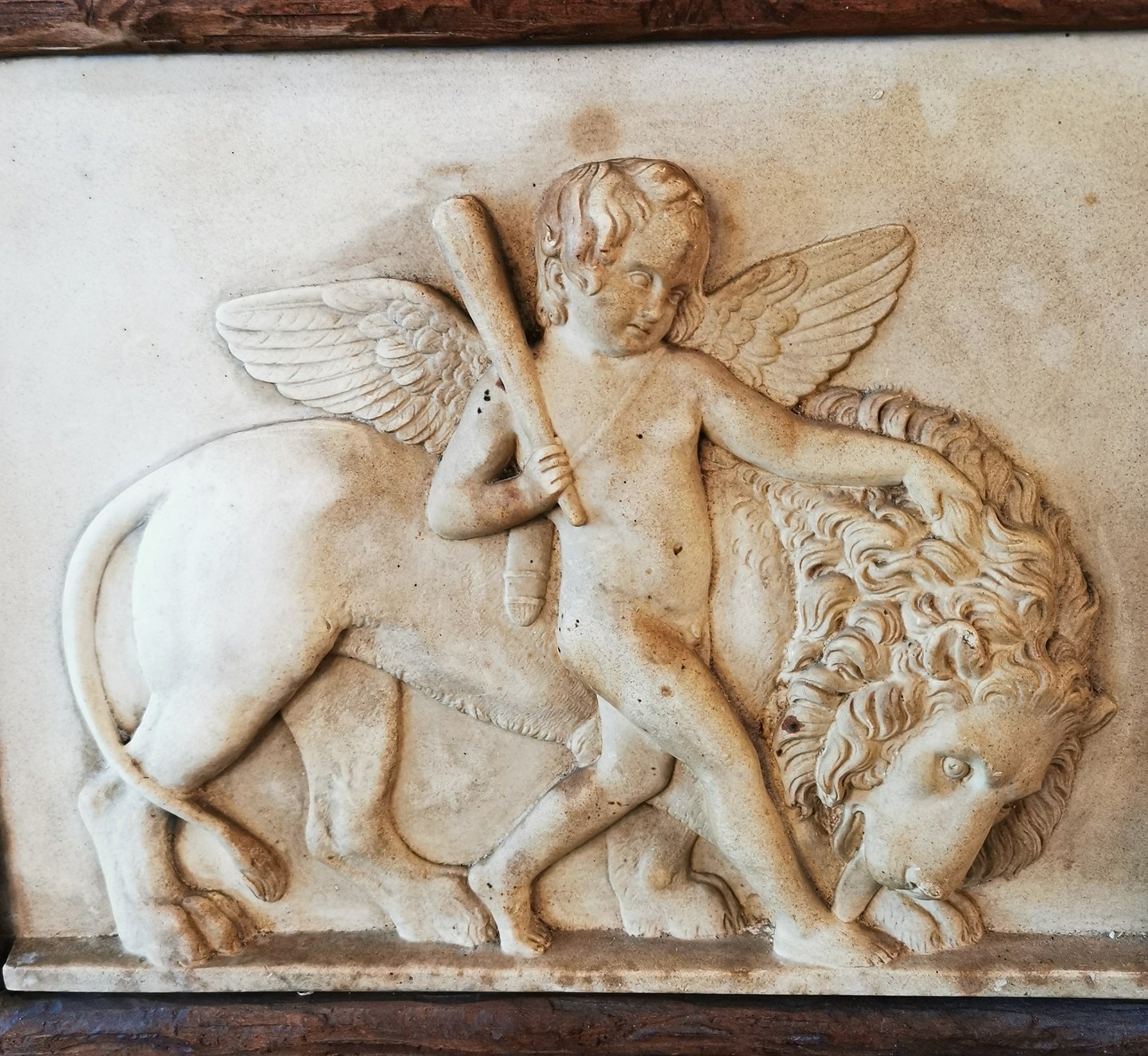 Relief "Amor på jorden" Rom 1828 af Bertel Thorvaldsen (1770-1844). "Amor viser sin magt over jorden ved et solidt tag i løvens manke med den ene hånd og med Herkules´kølle i den anden", Thorvaldsens museum. Udført i patineret gips på den danske billedhugger Hans Christian Brix´s værksted omkring 1900. Fremstår i god stand. indrammet i håndlavet ramme af træ i bladværk. Stemplet på bagsiden med H. C. Brix Eneret. Mål: 25½ x 33½ cm.
