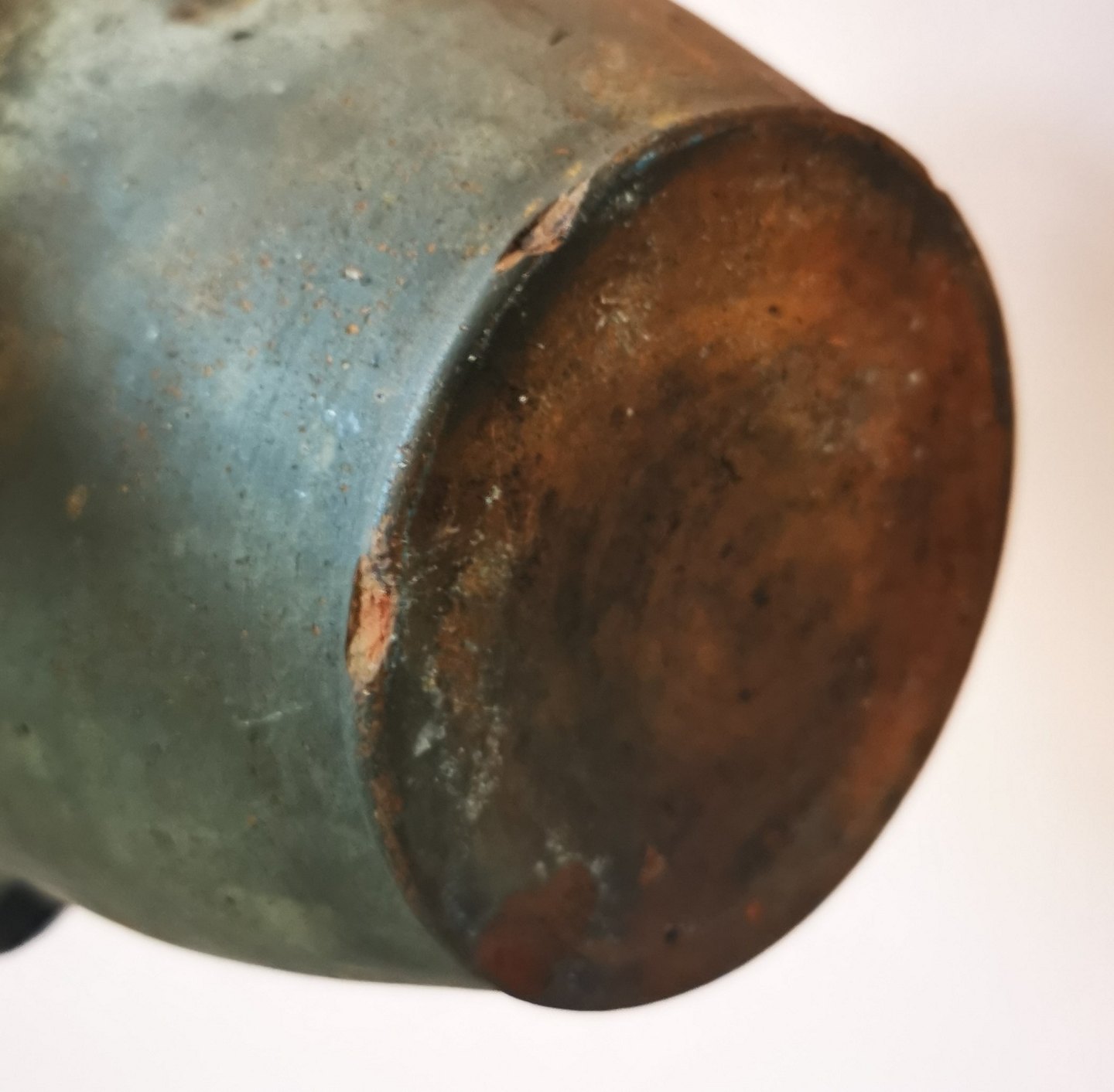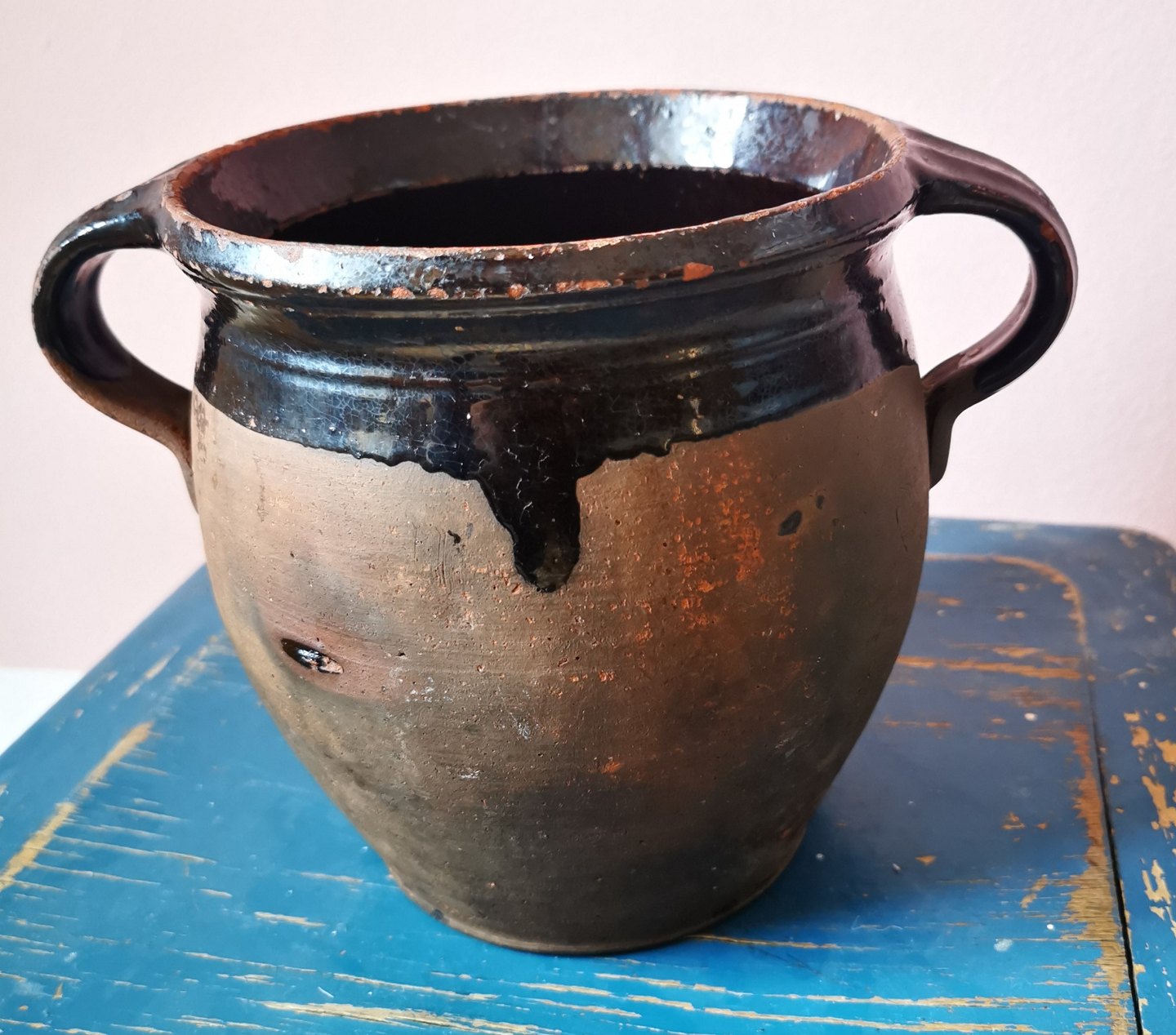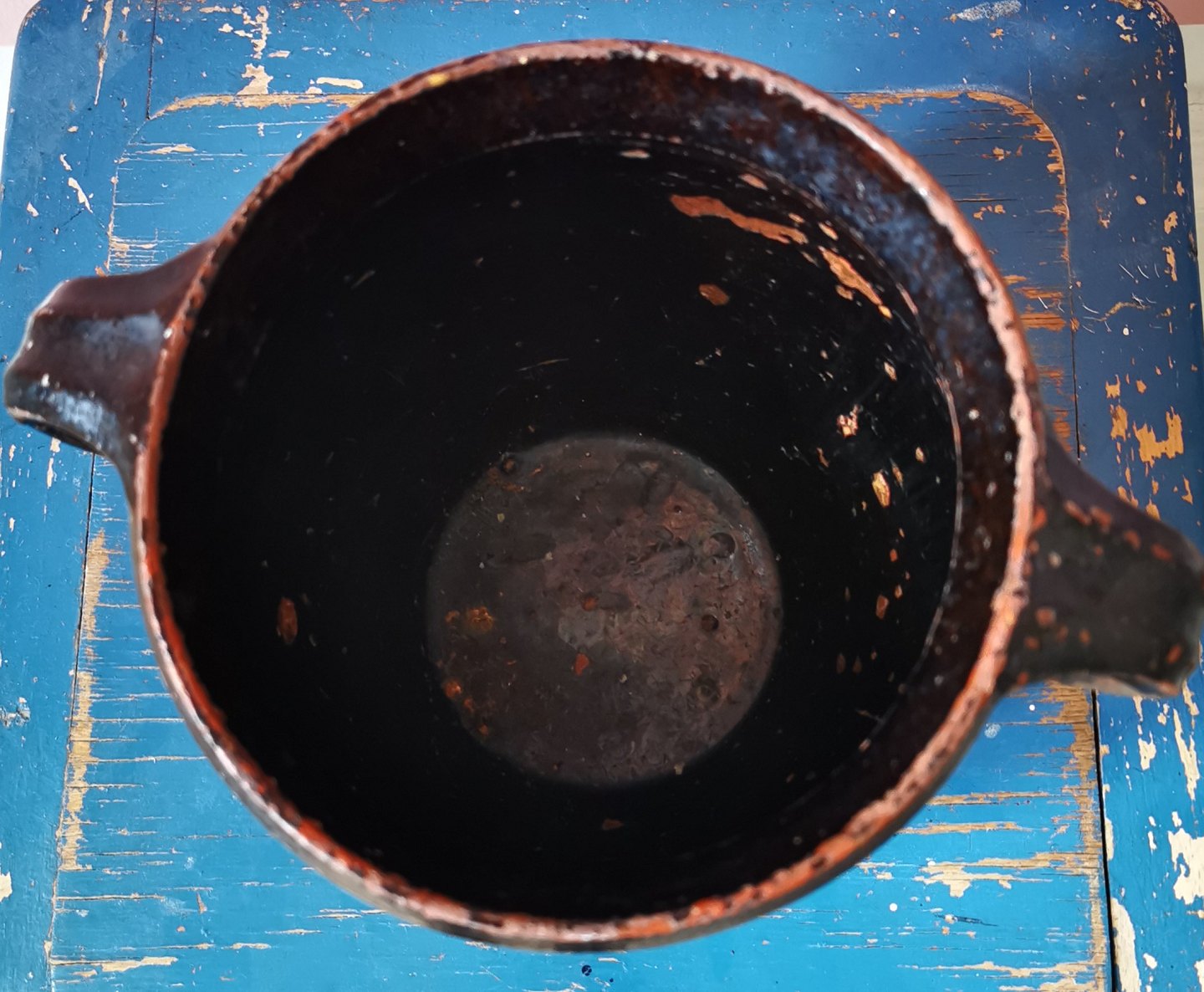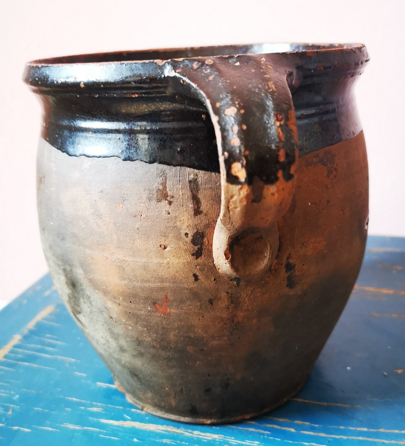Delvist glaseret krukke med hanke. Almindeligt brugsslid på både inderside og yderside. Mindre skår på undersiden (se foto). Fremstillet i 19. århundrede. H. 17 cm.