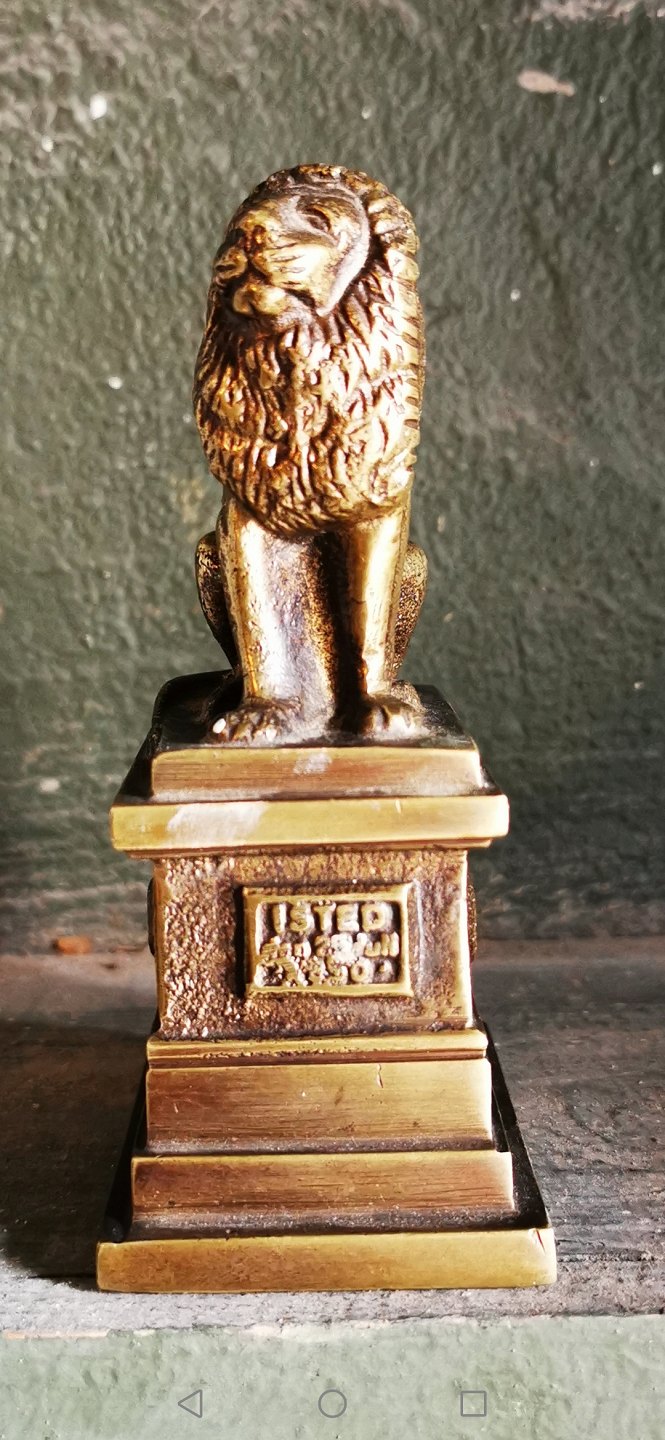 Mindre (tung) figur af Istedløven i broze. Udført af billedhugeren H. W. Bisssen 1859-60 til minde om slaget ved Isted Hede i 1850. Fremstår i god stand. Formodes produceret omkring 1900. Mål: H. 13½ cm basen mål er 5½ x 7½ cm,