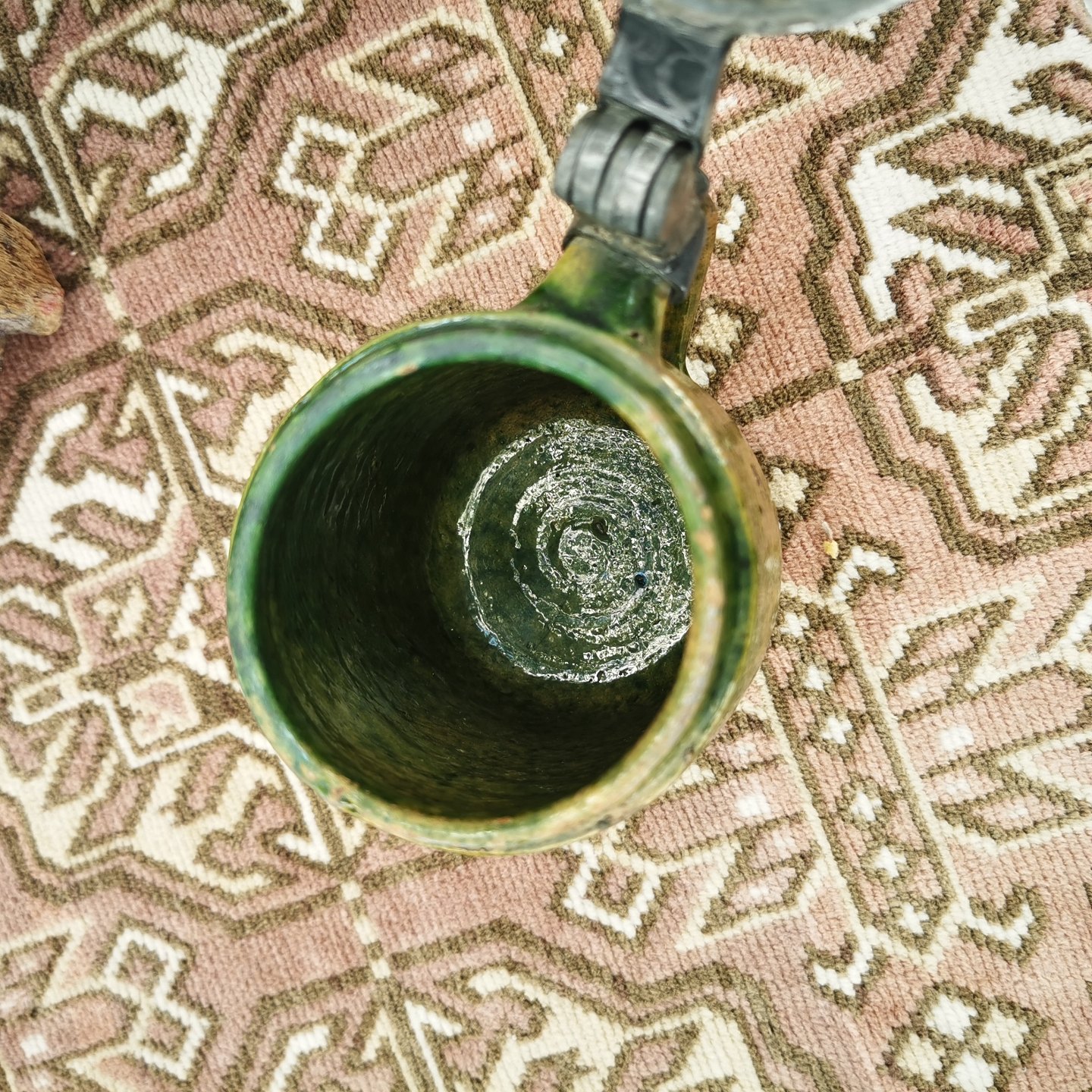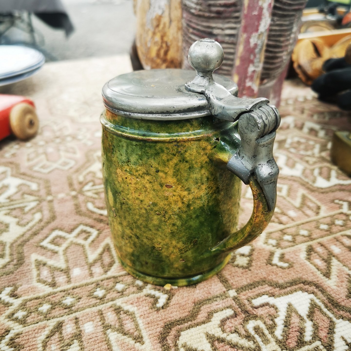 Keramik krus i Grøn glasur med låg i tin. I god stand. Fremstillet omkring 1850