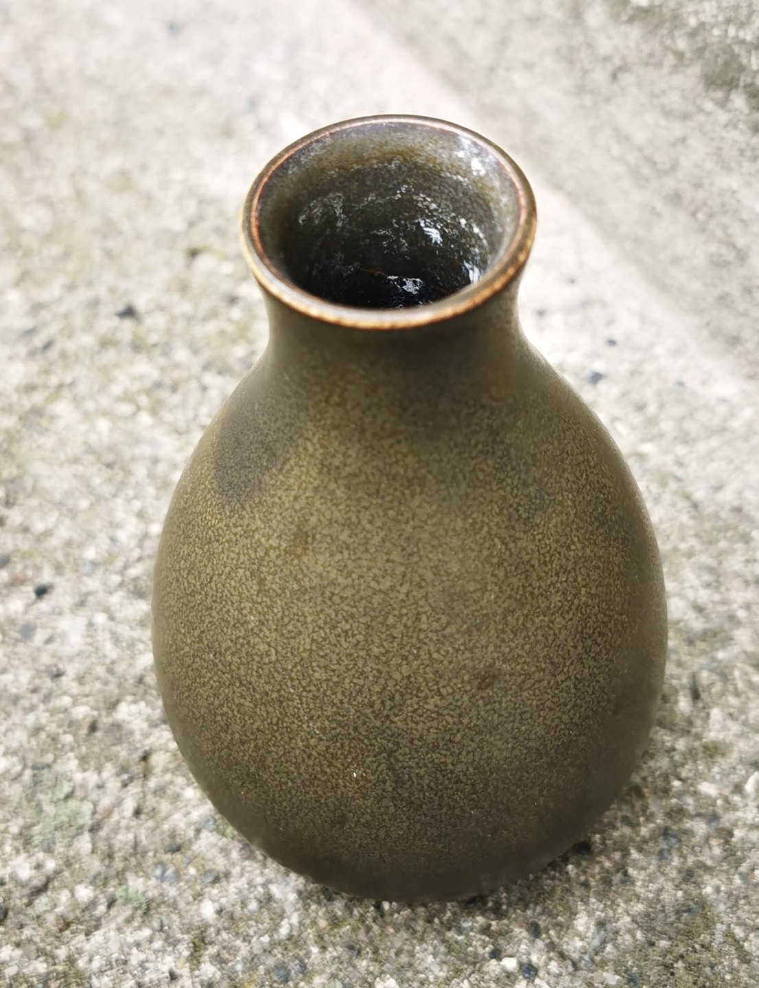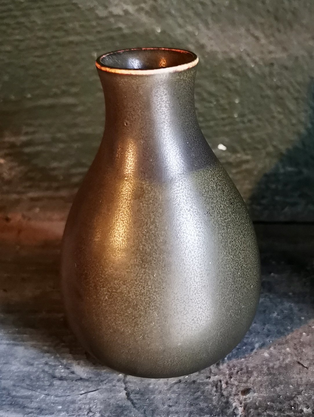 Stentøjsvase fra Eslau i Taastrup, Danmark, af Jens Harald Quistgaard (1919-2008). IHQ kender mest til sit arbejde med teaktræ og møbeldesign. Vasen er dækket både i -og udvendigt af delvist brun -og grønlig glasur. Ingen skader eller reparationer. I god stand. Lidt brugsspor indvendigt. Fabriksmærker i bunden sammen med kunstnersignatur IHQ. Vasen er 10½ cm høj.
