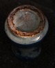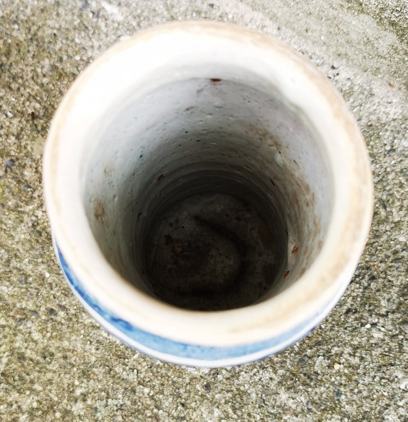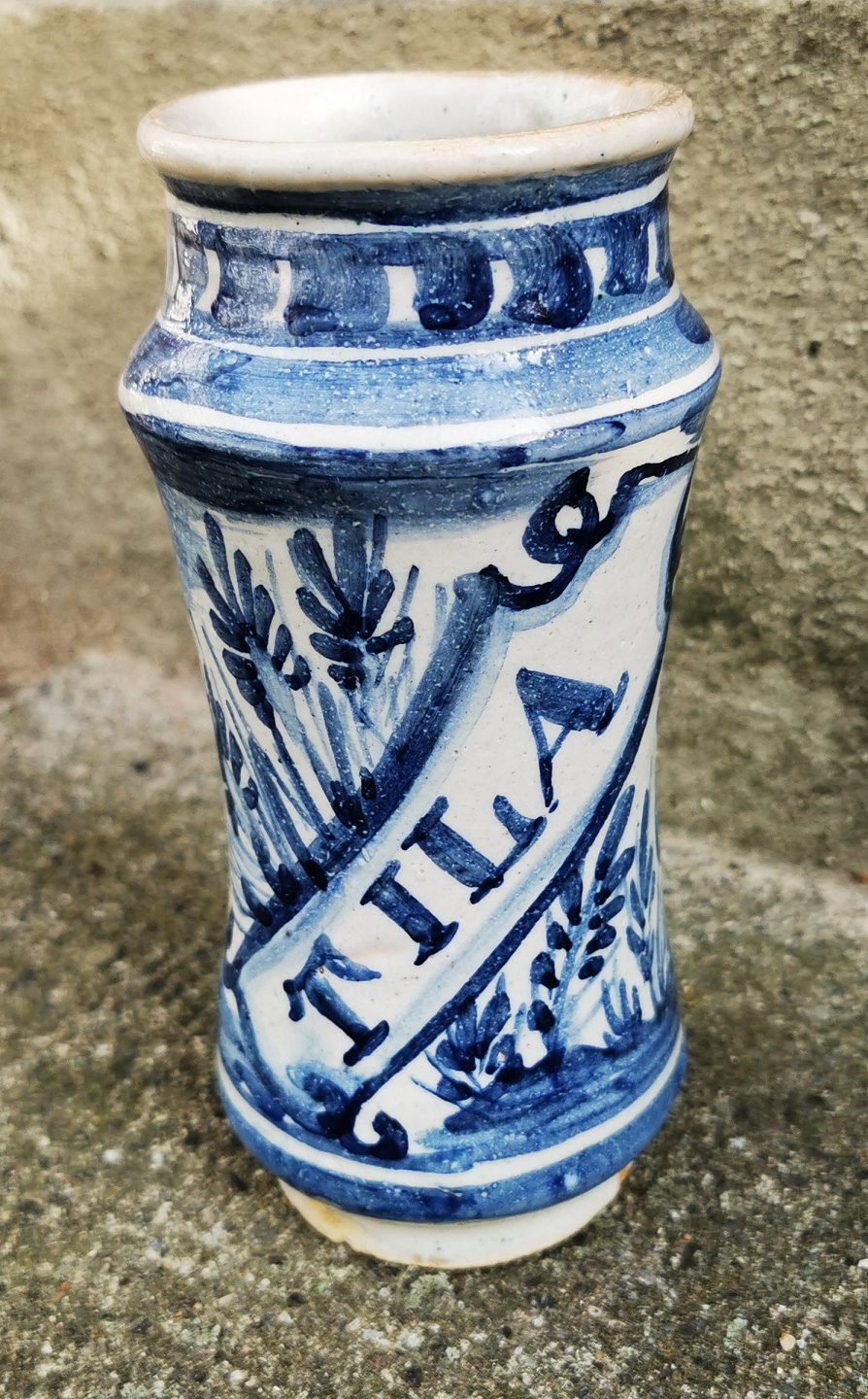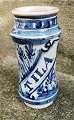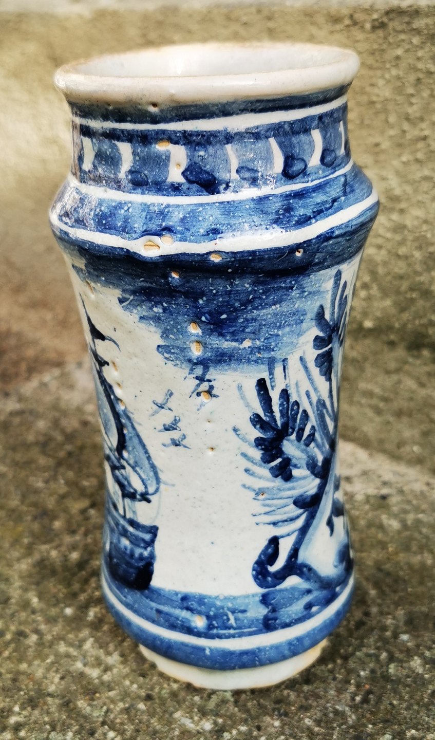 Spansk Albarello hvidglaseret krukke i fajance med blåt tekst samt motiv af spansk galleon sejlskib fra 18. århundrede. Fremstår i god stand uden skader eller reparationer. Almindeligt brugsslid. H. 16½ cm høj