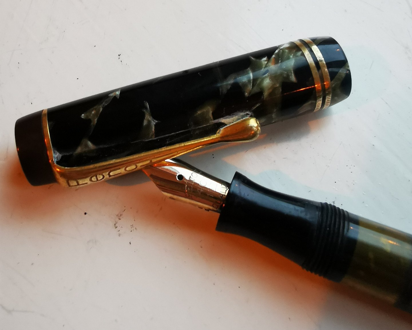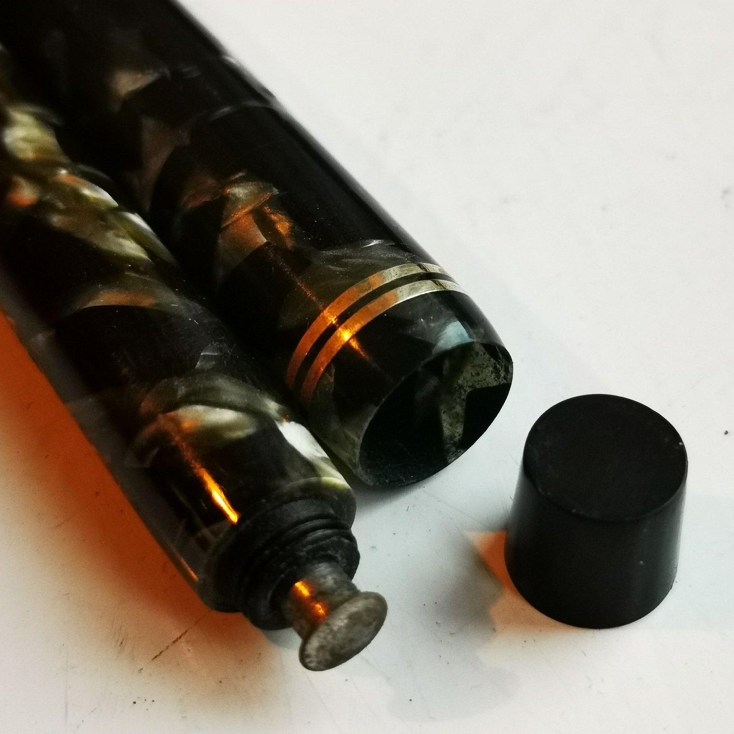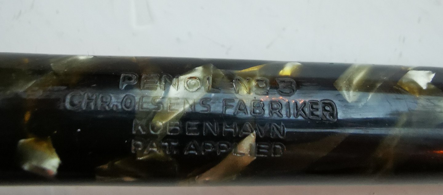 Grøn marmoreret Penol no. 3 fyldepen. Tekst på fyldepennen: PENOL NO. 3. CHR. OLSENS FABRIKKER. KØBENHAVN. PAT. APPLIED. Fremstillet i 1940´erne. Fremstår i god stand uden skader eller reparationer. Ny gummisæk skal indsættes før brug. Ved tillæg på kr. 325,00 kan fyldepennen leveres med ny gummisæk. Alle dele original Skribent inclusive 14 karat guld spids. 13,5 cm lang.