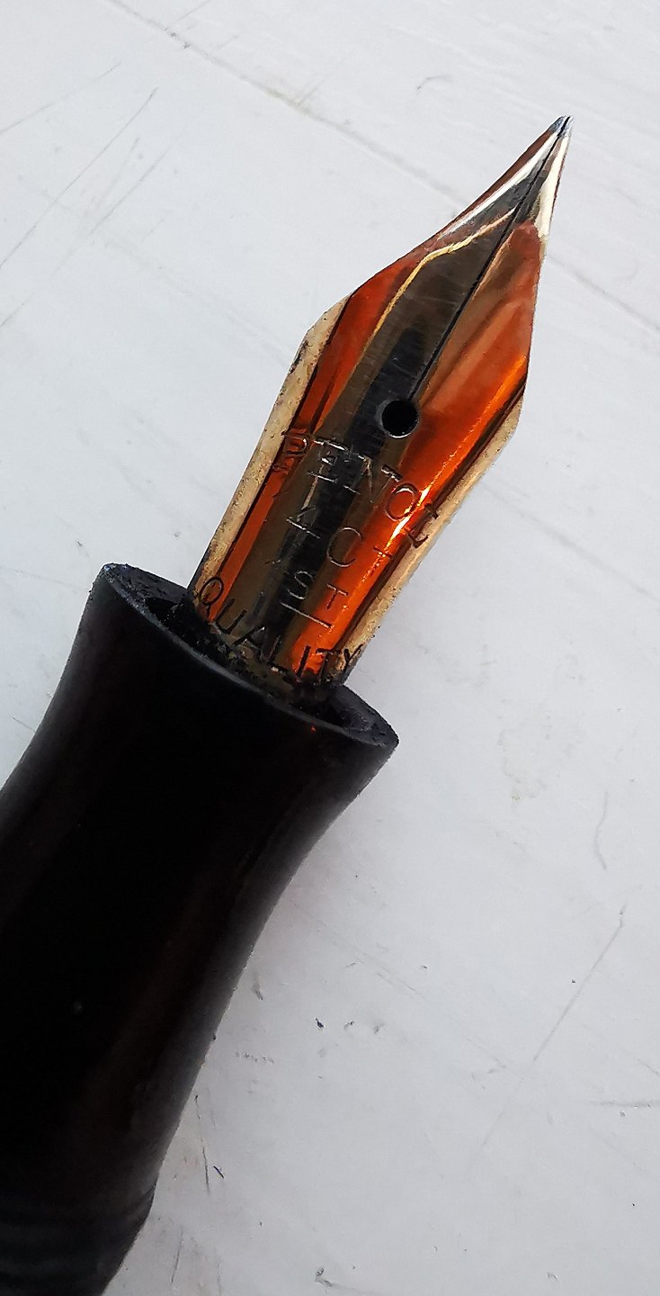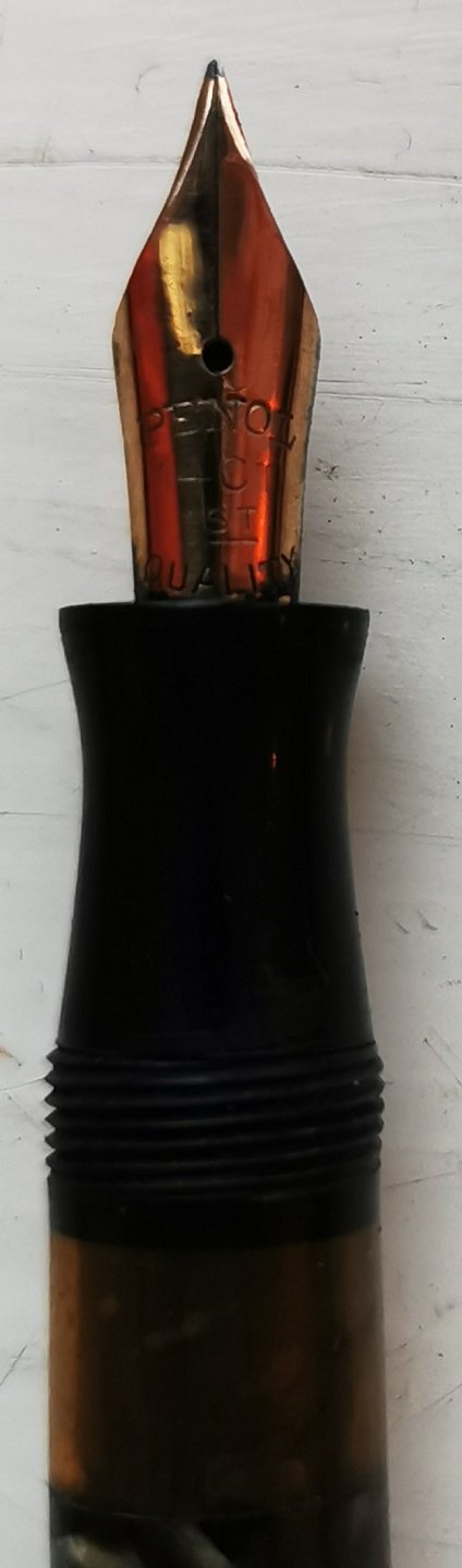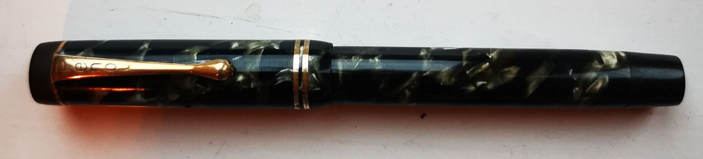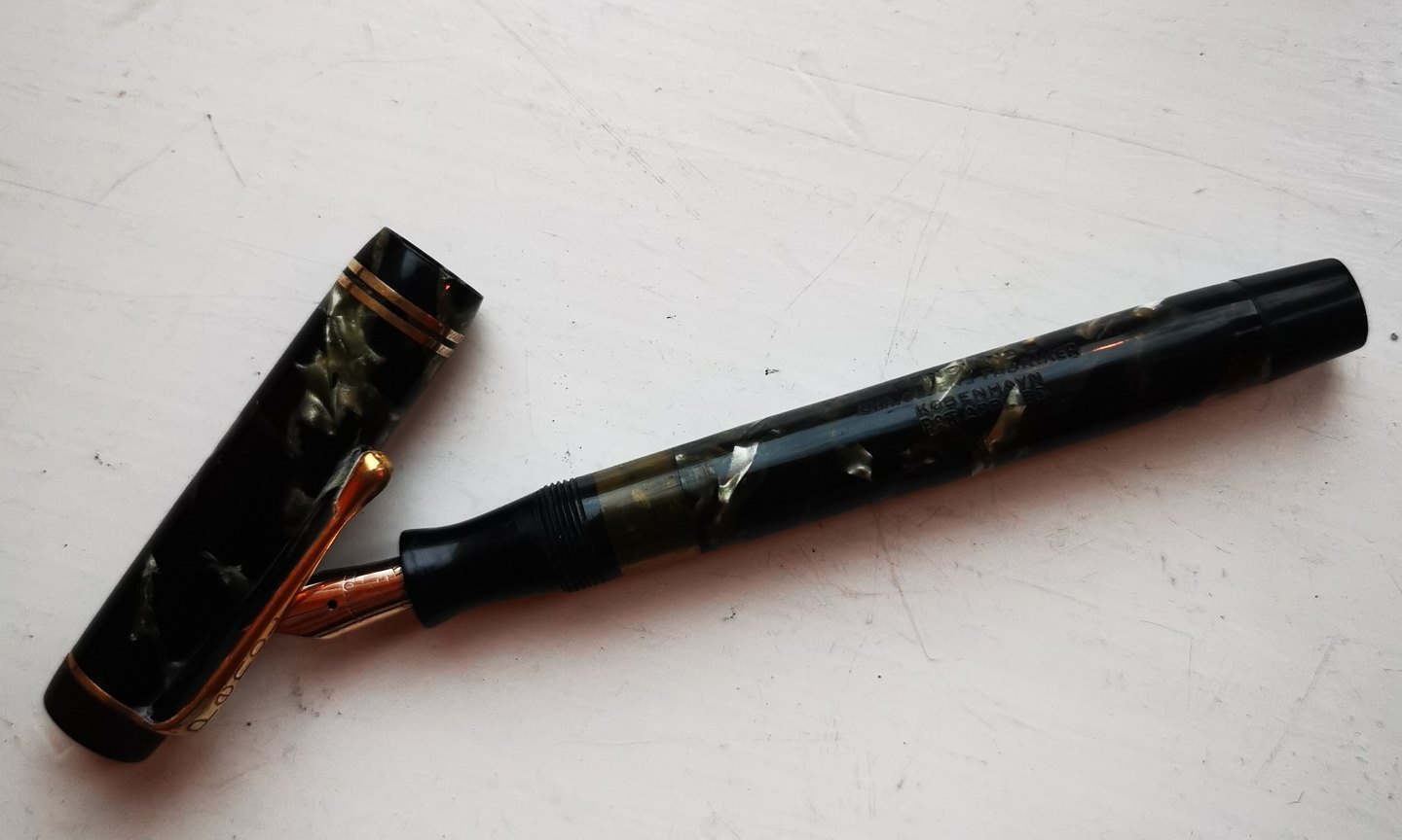 Grøn marmoreret Penol no. 3 fyldepen. Tekst på fyldepennen: PENOL NO. 3. CHR. OLSENS FABRIKKER. KØBENHAVN. PAT. APPLIED. Fremstillet i 1940´erne. Fremstår i god stand uden skader eller reparationer. Ny gummisæk skal indsættes før brug. Ved tillæg på kr. 325,00 kan fyldepennen leveres med ny gummisæk. Alle dele original Skribent inclusive 14 karat guld spids. 13,5 cm lang.