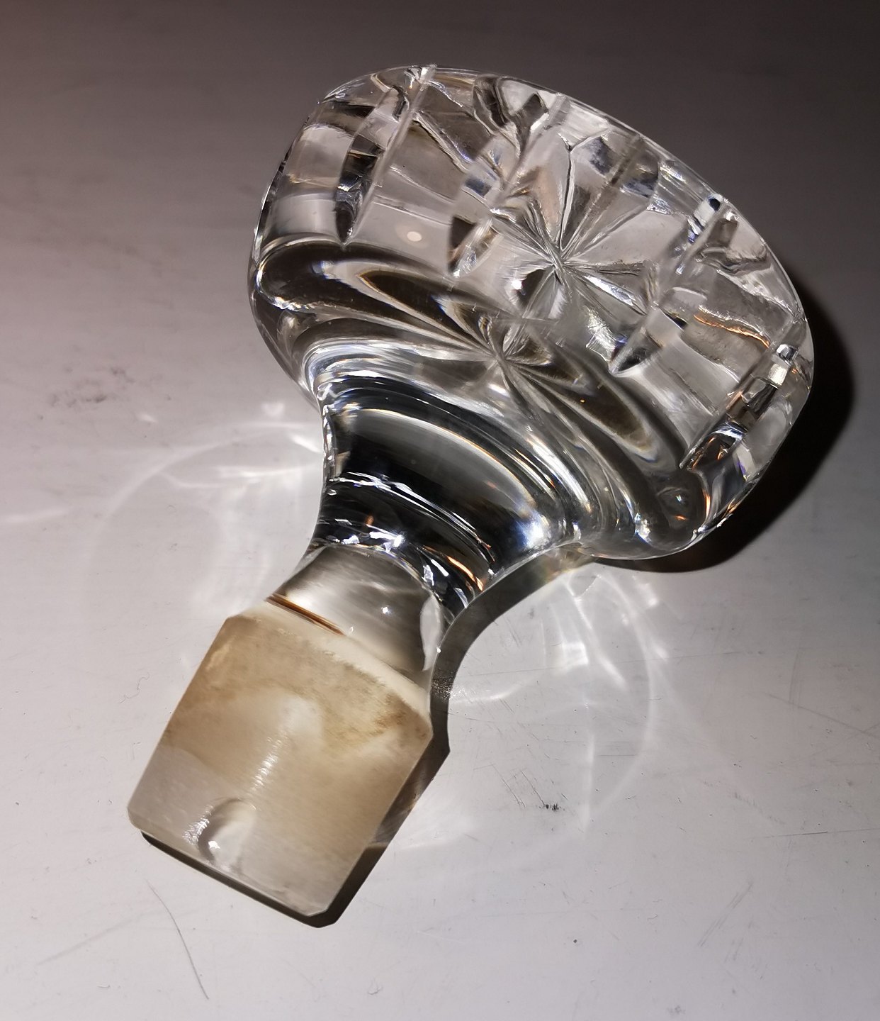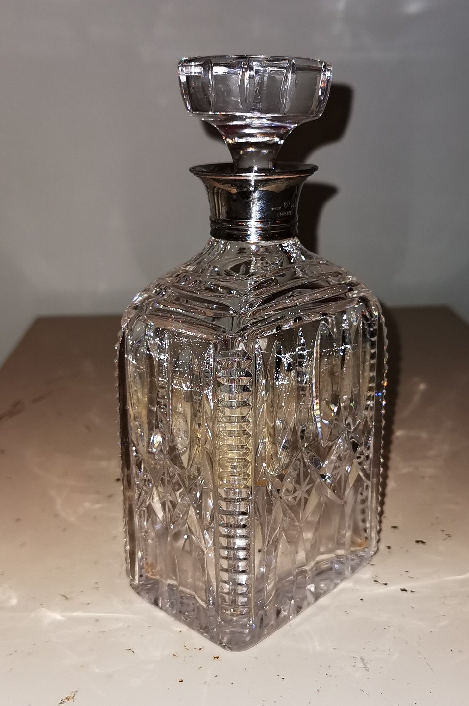 Firkantet Whisky karaffel i krystal glas med sølvmontering i form af 925S Sterling sølvkrave om halsen. Sølvet produceret og monteret i Danmark. Fremstår i god stand bortset fra et lille skår på bunden af proppen (se foto). Ellers i perfekt stand uden reparationer. Mål: 21 cm høj. Bunden måler 7½ x 9 cm.