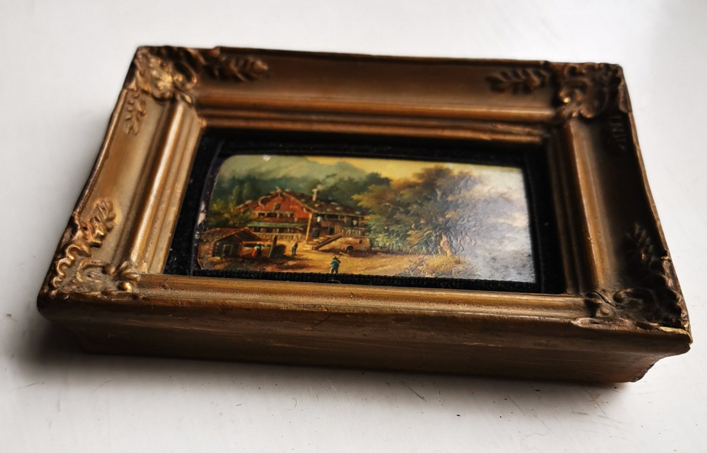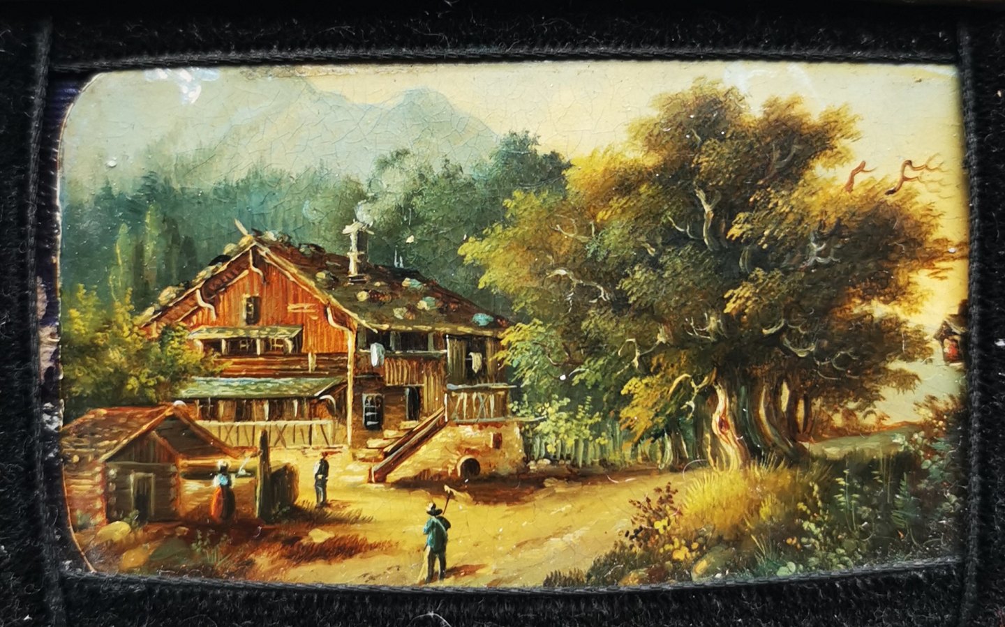 Miniature maleri fra 19. århundrede. Motiv med hus og personer og stort træ. I baggrunden et bjerg. Formodes at være fra det sydlige Tyskland eller Østrig. I god stand uden skader eller reparationer. Ingen signatur. Mål incl. rammen: 9 x 12 cm.