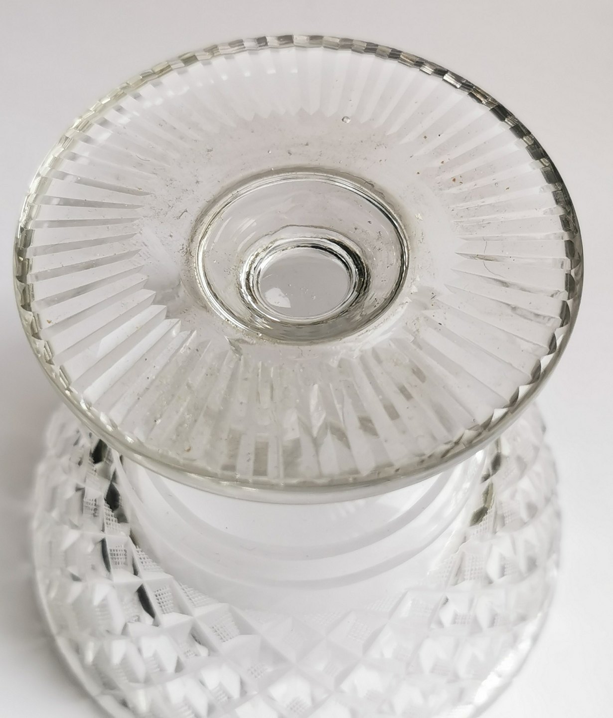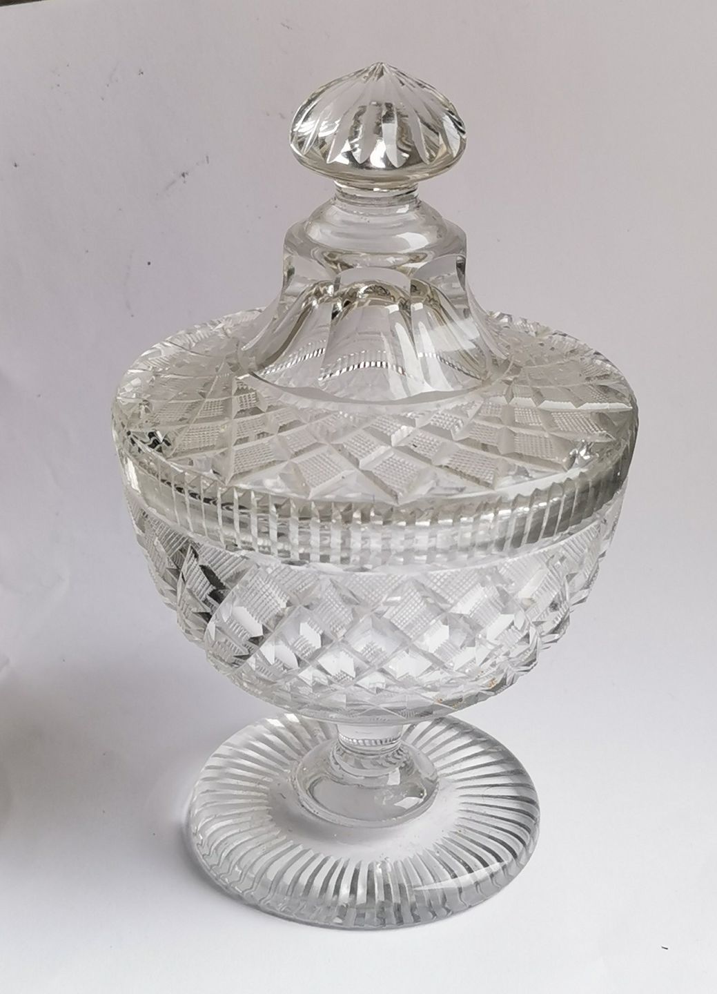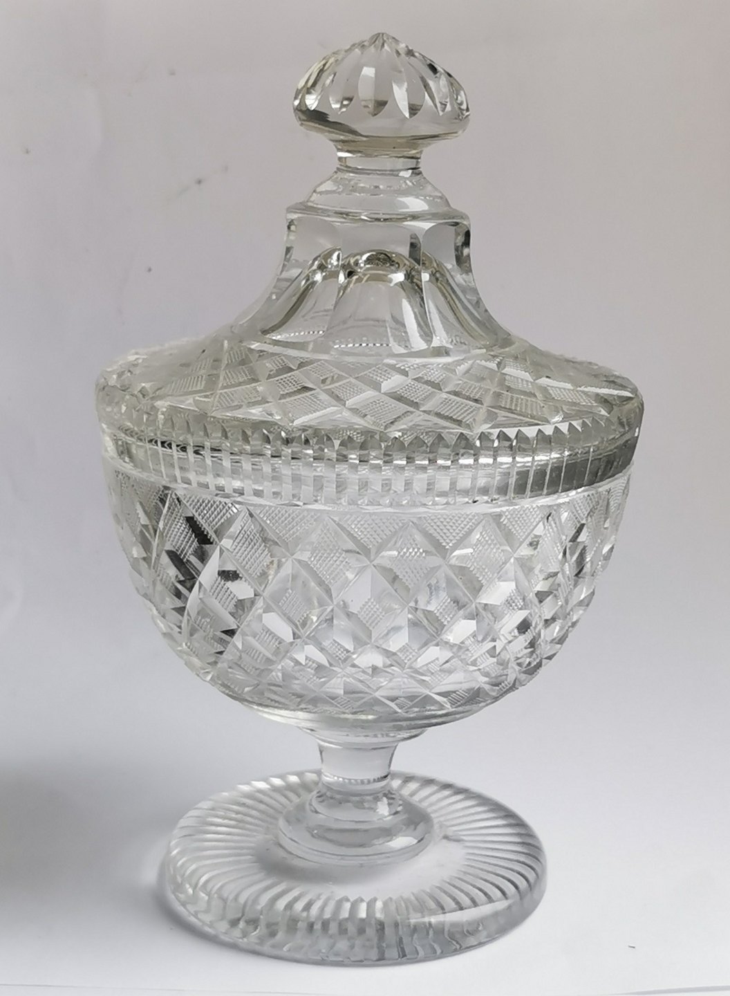 Skål på fod i krystal med låg. Fremstår i perfekt stand uden skader eller reparationer. Fremstillet omkring 1900-1920. Formodes fremstillet i Storbritanien - England eller Irland. H. 16½ cm (6.49 inches).