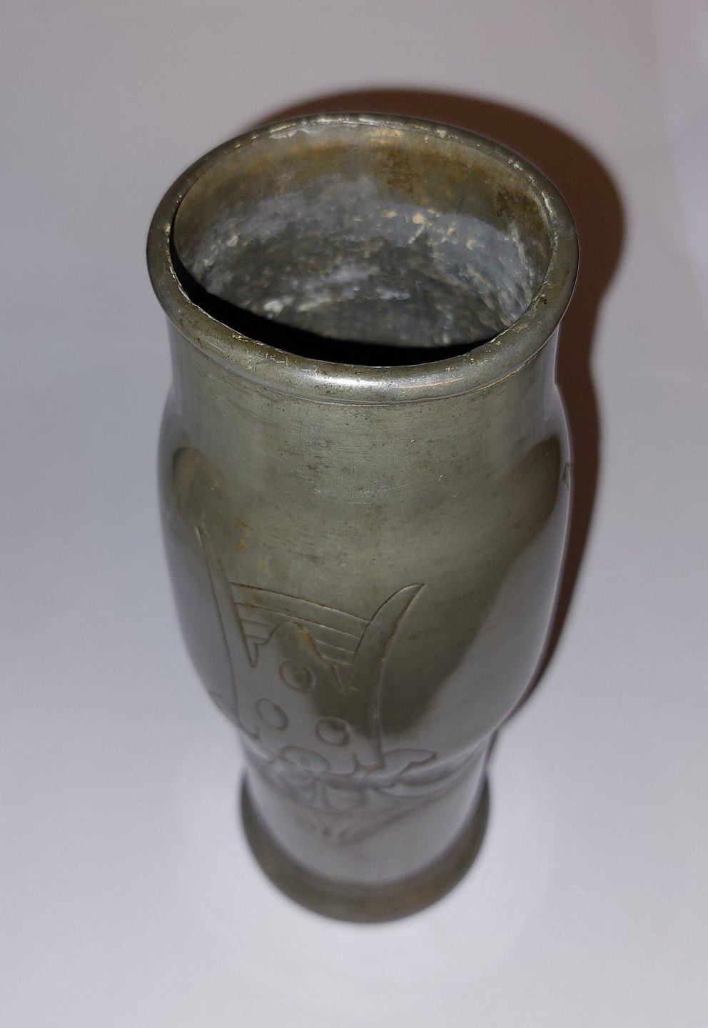 Vase i tin med skønvirkedekoration fra Mogens Ballin´s værksted i begyndelsen af 20. århundrede. Fremstår i god stand. Lidt brugsspor indvendigt. Fabriksmærket på bunden med MB samt modelnummer. H. 20 cm (7.87 inches).