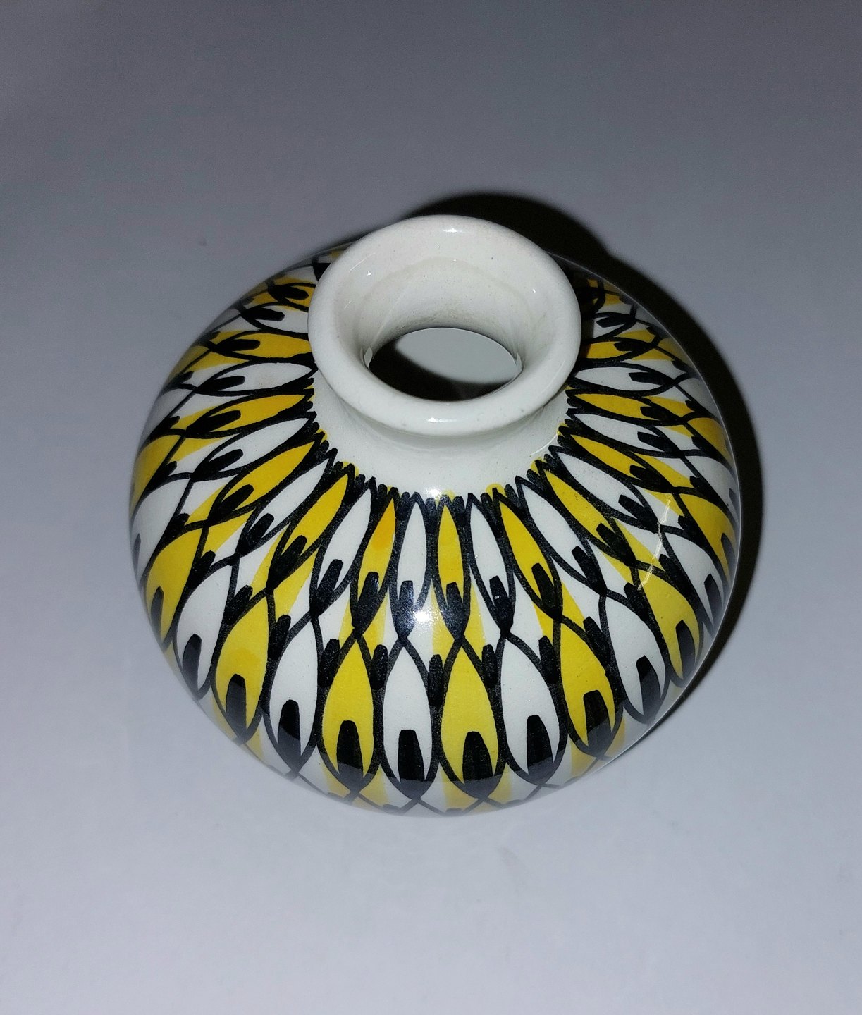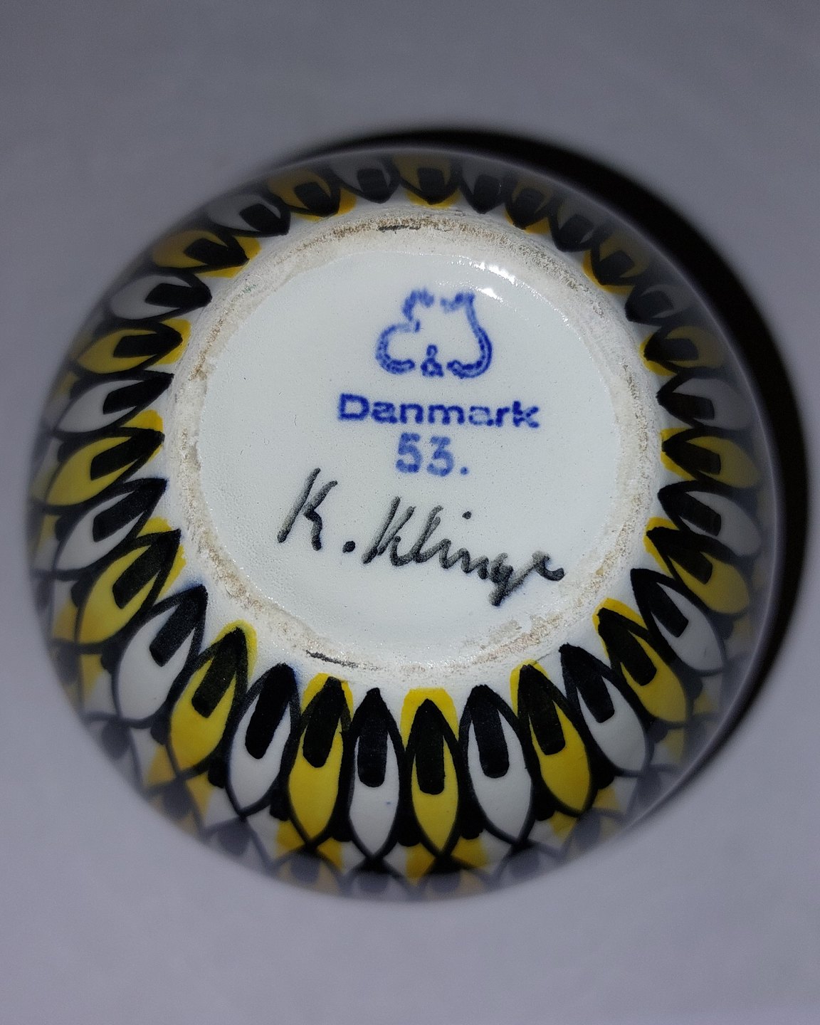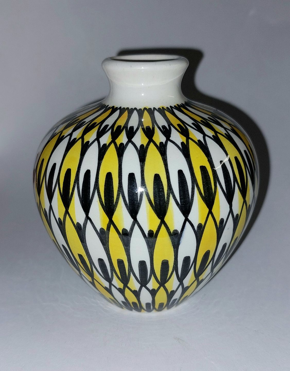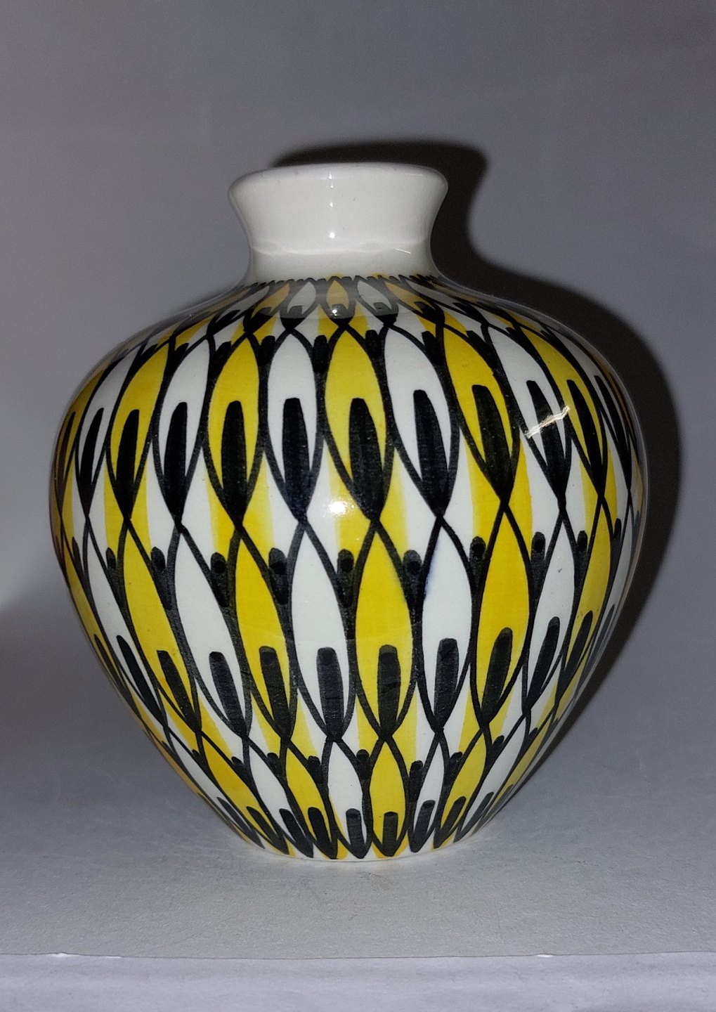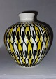 Vase i keramik af Kai Klinge for E&J (Eva & Johannes Andersen) keramik, Danmark ca. 1960. Sort og gult mønster på hvid bund. Fremstår i perfekt stand. Ingen skader eller reparationer. Fabriksmærket på bunden sammen med kunstnersignatur. H. 10,5 cm (4.13 inches).