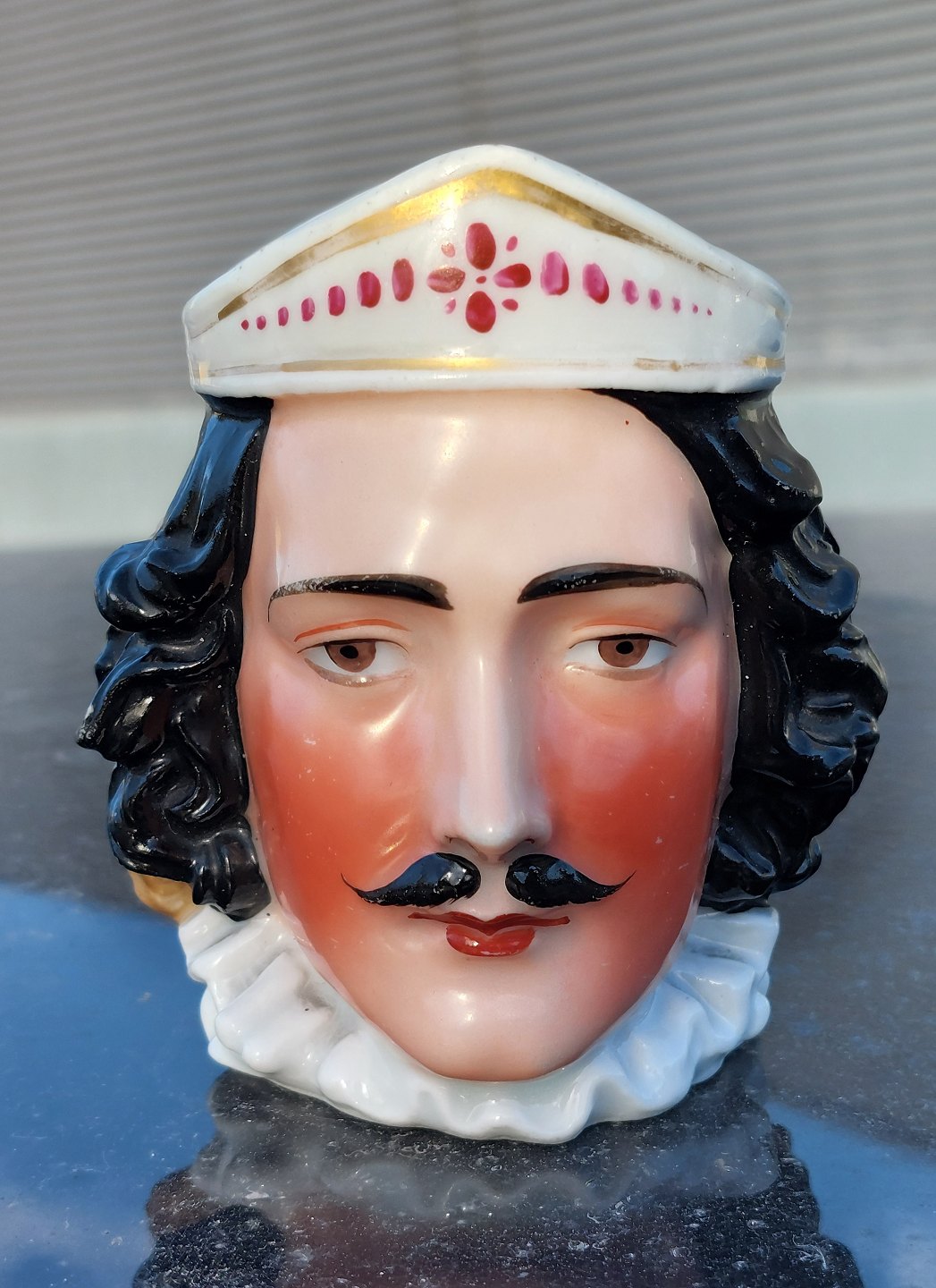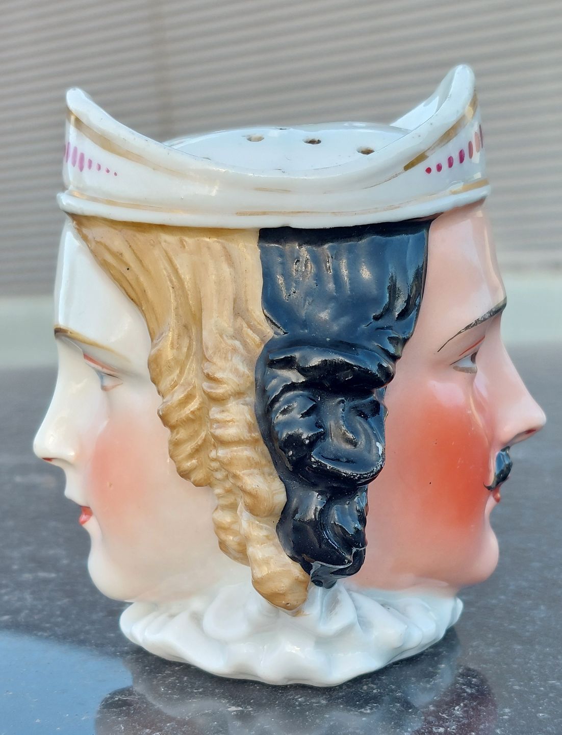 Figurativ strødåse i porcelæn med motiv af ansigterne af en Konge og hans Dronning. Formodes fremstillet omkring 1840-1860. På bunden er der indstemplet "Prag". I god stand uden skader eller reparationer. H. 9½ cm (3.74 inches).