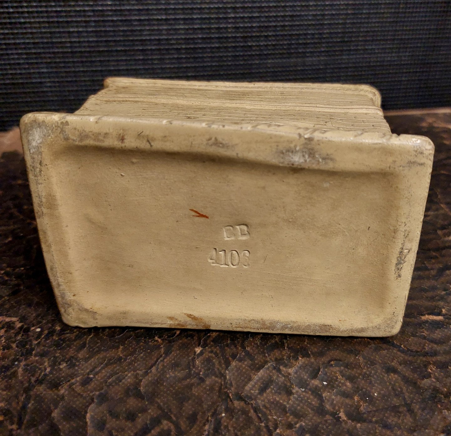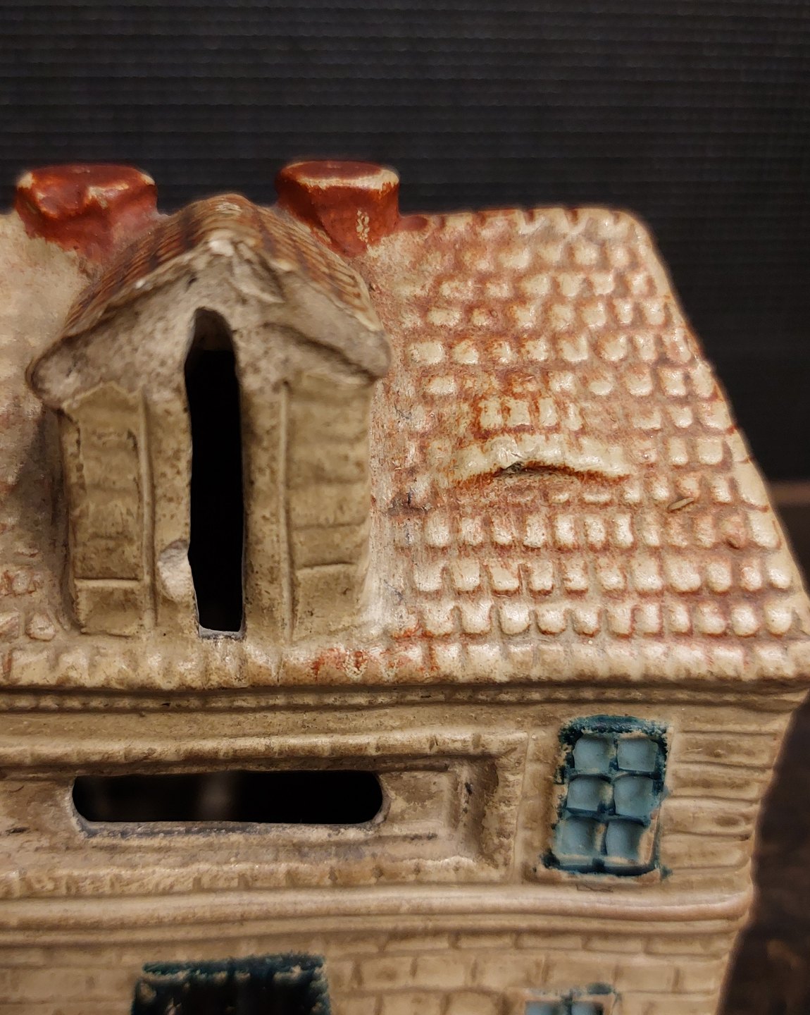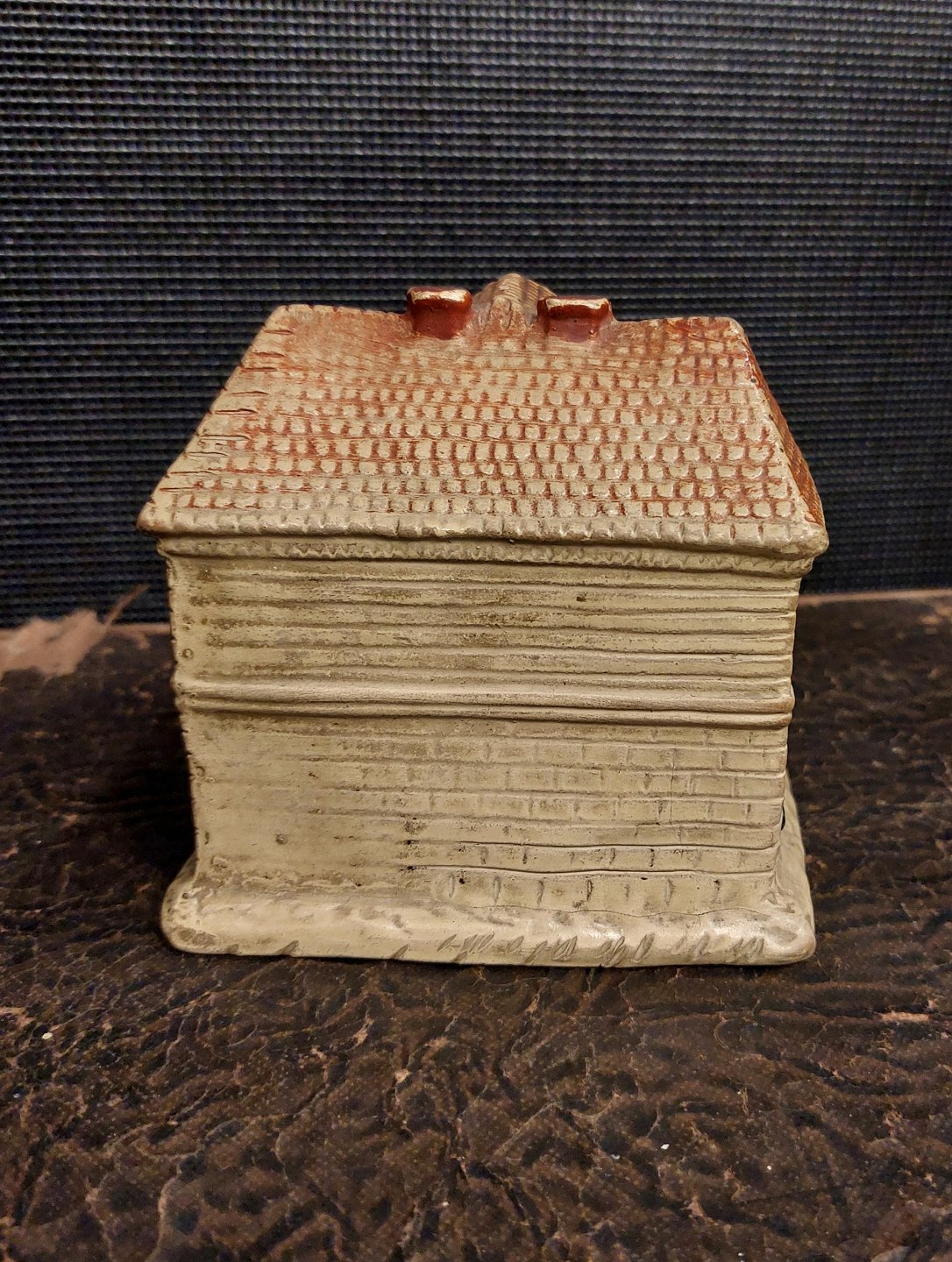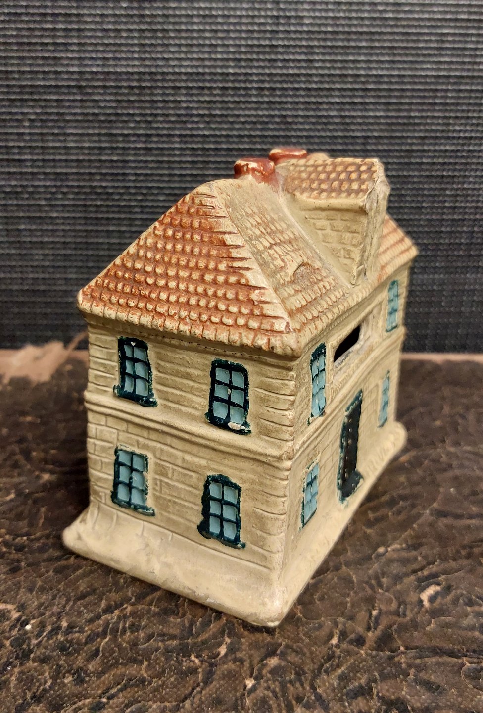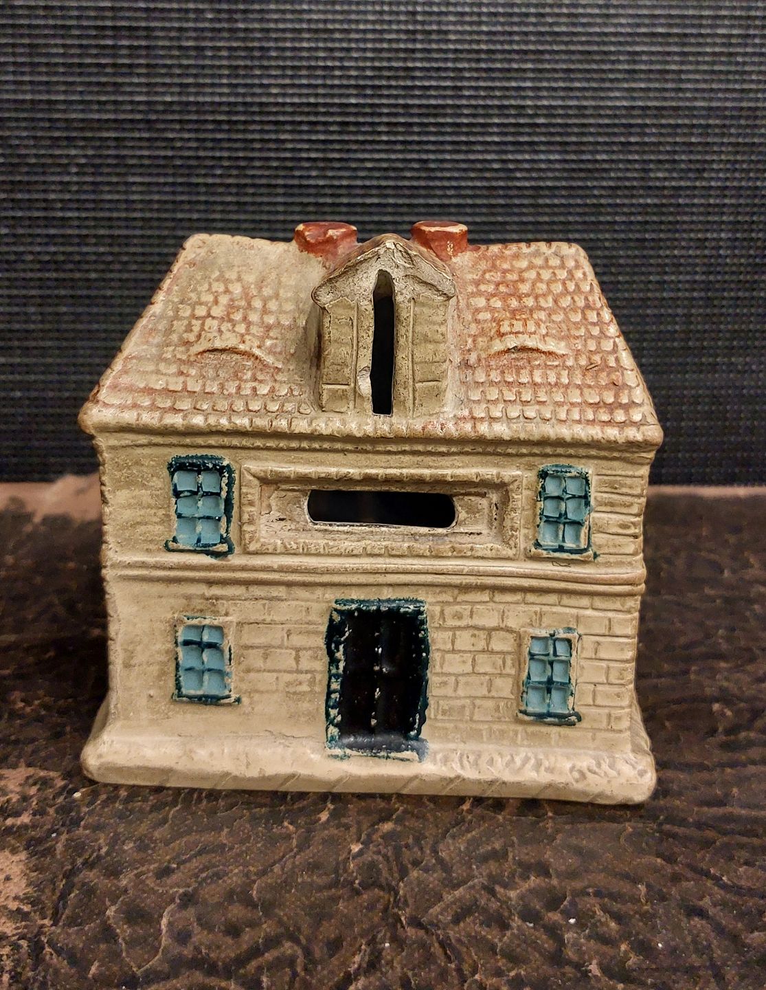 Sparebøsse I keramik i form af et hus. Mindre skår ved vinduet øverst. H. 10,5 cm. Bundenmåler 6,5 x 10,5 cm