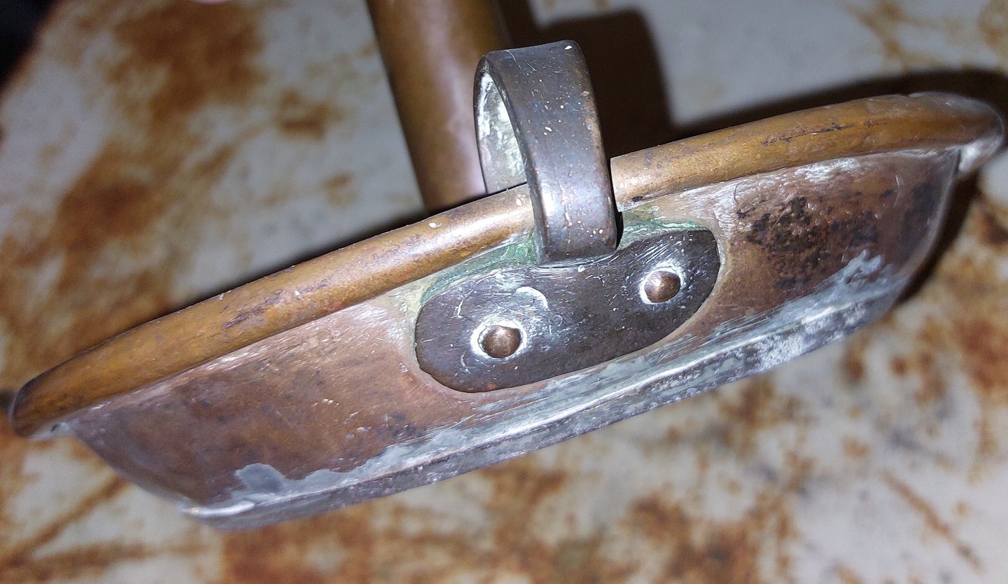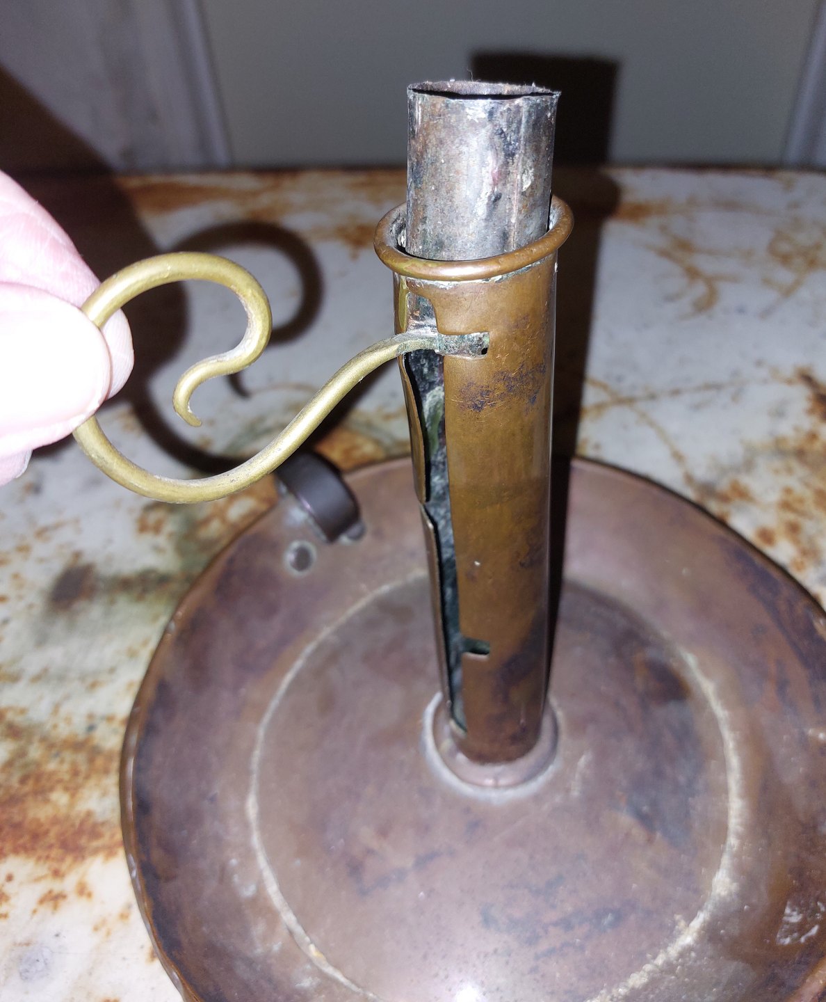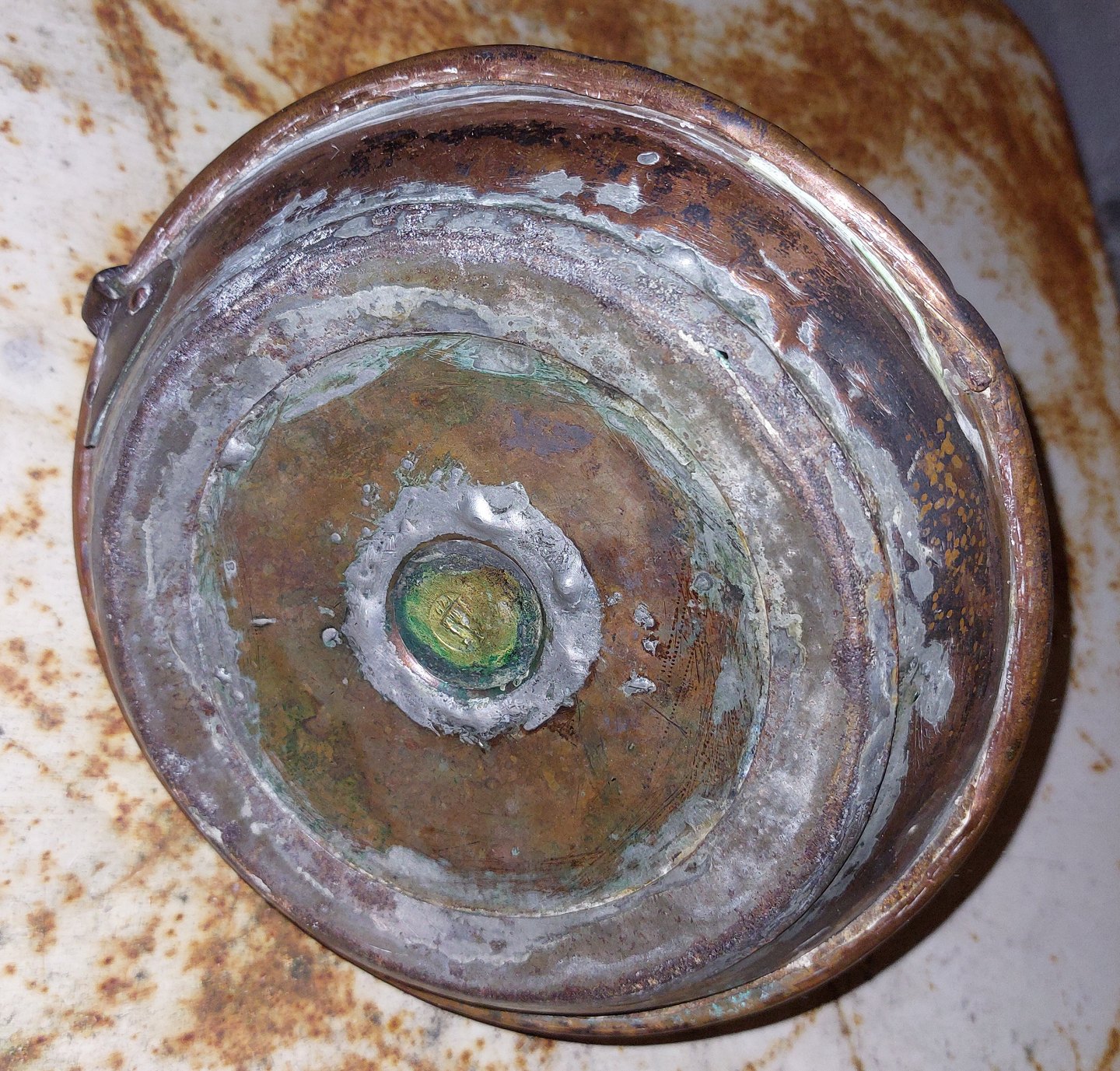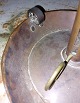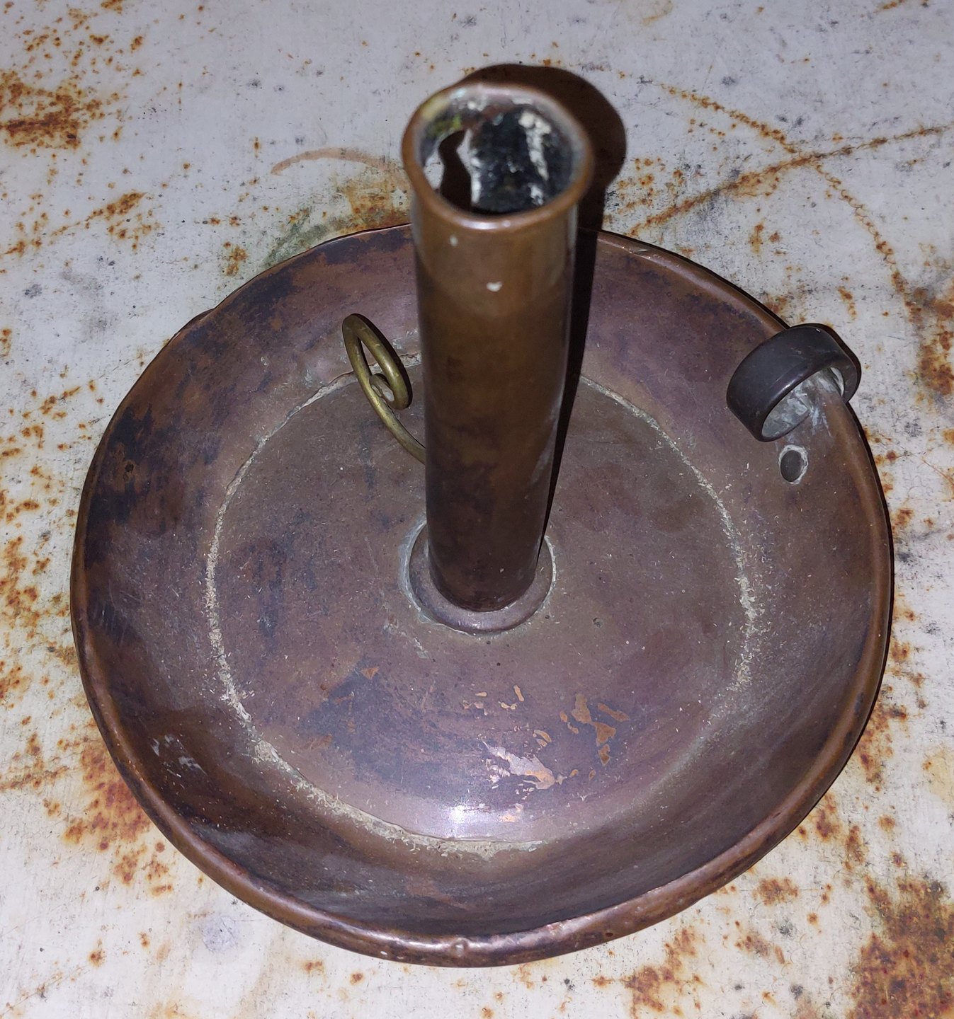 VELPATINERET KAMMERSTAGE: Dansk kammerstage i kobber fra slutningen af 18. århundrede. Brugsspor. Ses ikke på overfladen men på undersiden er det tydeligt at stagen er repareret. Fabriksstemplet på bunden. Mål: H. 17 cm (6.69 inches) skålens diameter er 20½ cm (8.07 inches).