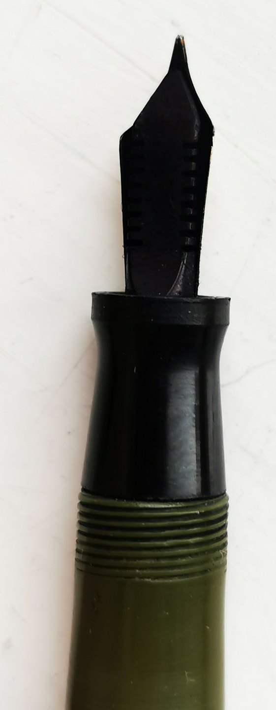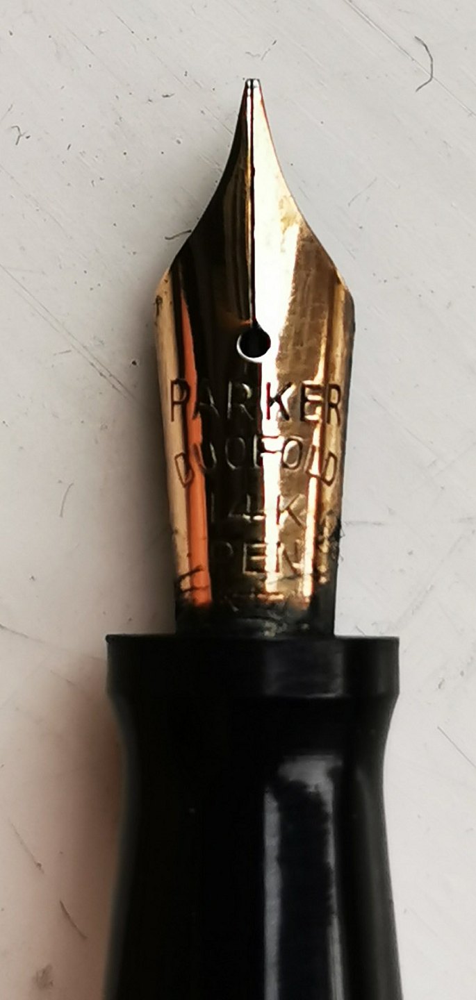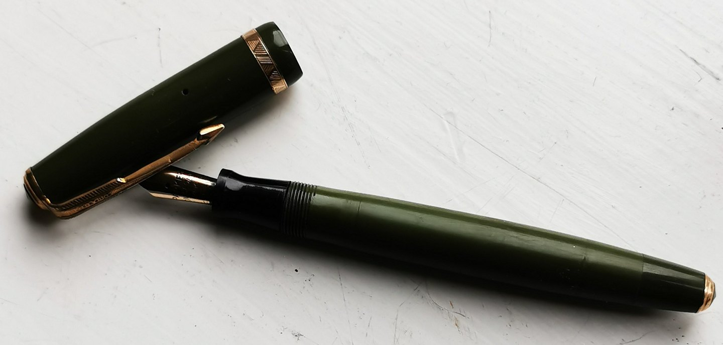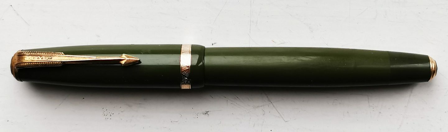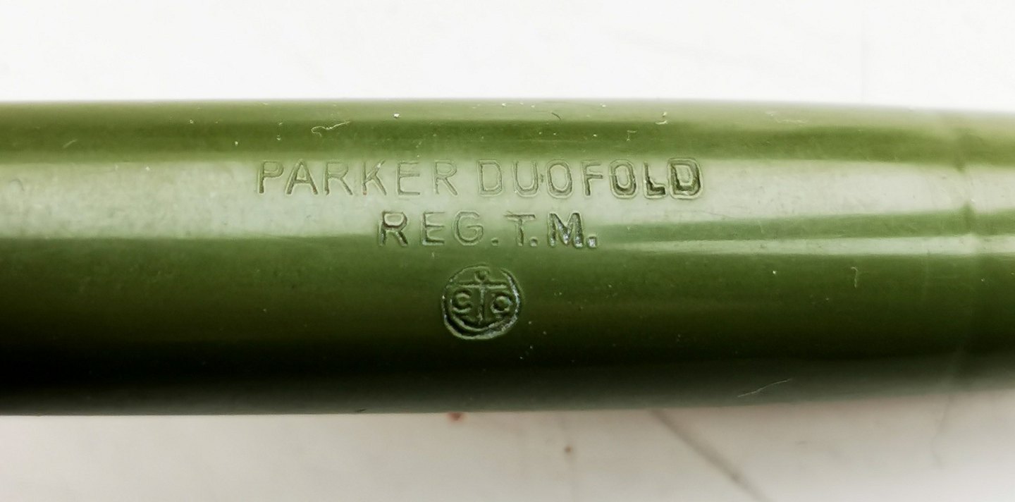 Olivengrøn Parker Duofold Reg. T.M fyldepen fra slutningen af 1940´erne. "Push button" blæk påfylder. Fremstår i god stand. Ingen skader eller reparationer. Alle dele er originale inclusive en 14 karat guld spids. 13½ cm lang (5.31 inches). Virker ikke. Der skal indsættes ny gummisæk hvorefter den fungerer igen. Dette koster ekstra kr. 325,00.