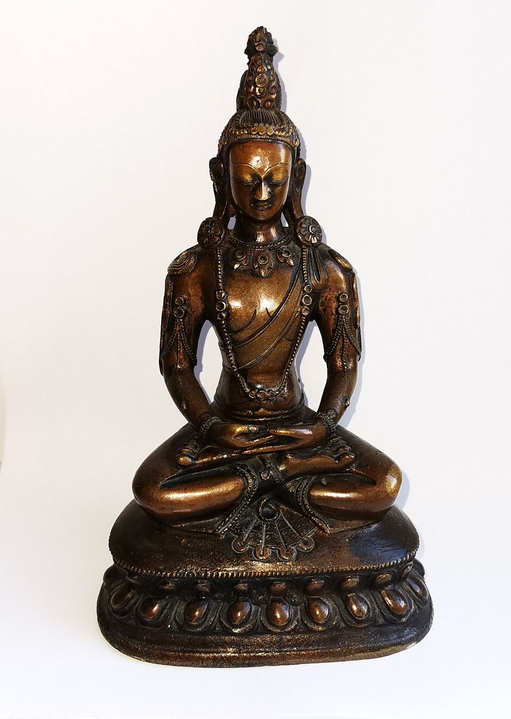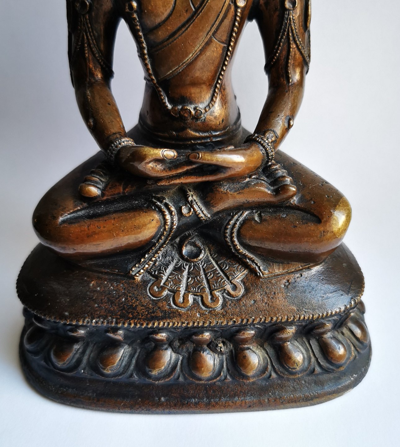 Buddha i bronce. Fremstillet i Thailand. Mange fine små detaljer. Meget fint efterbearbejdning af broncestøbningen. Formodes fremstillet midt i det 20. århundrede. 18 cm høj (7.08 inches).