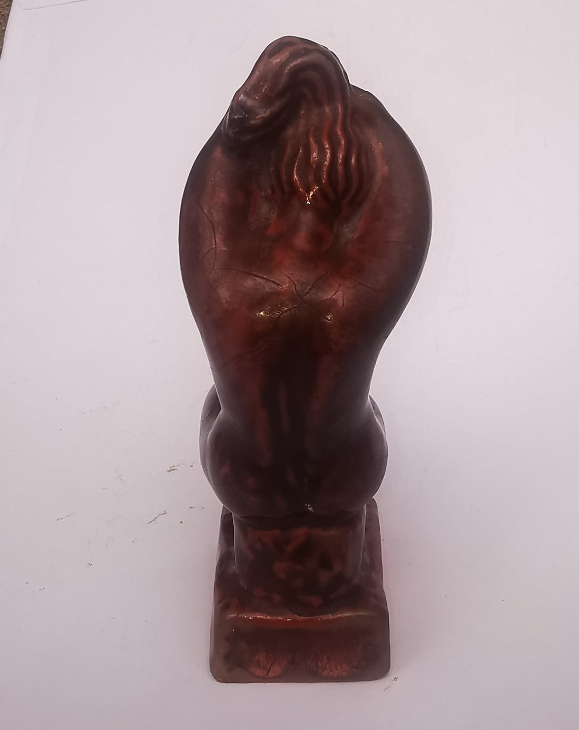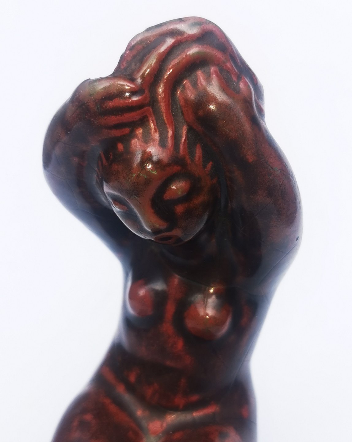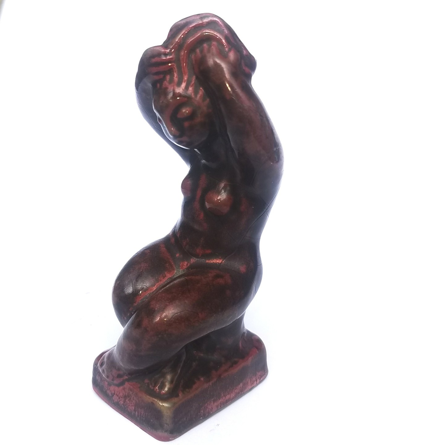 Figur af nøgen kvinde i keramik. Dækket af en rød lustre glasur. Formgivet af Gertrud Kudielka for Lauritz Hjorth, Bornholm. Fremstår i perfekt stand. Fabriksmærket på bunden. H. 13 cm