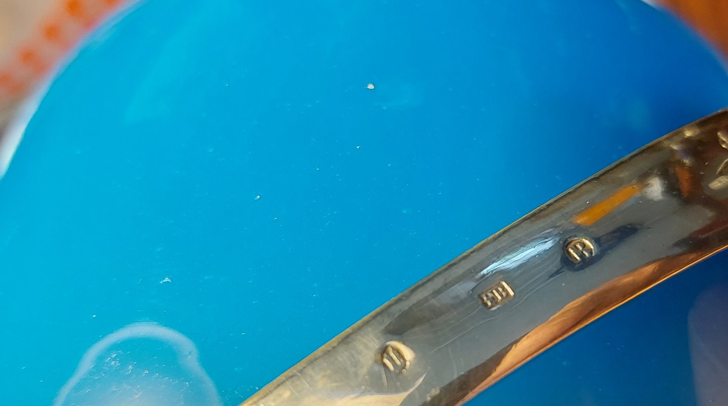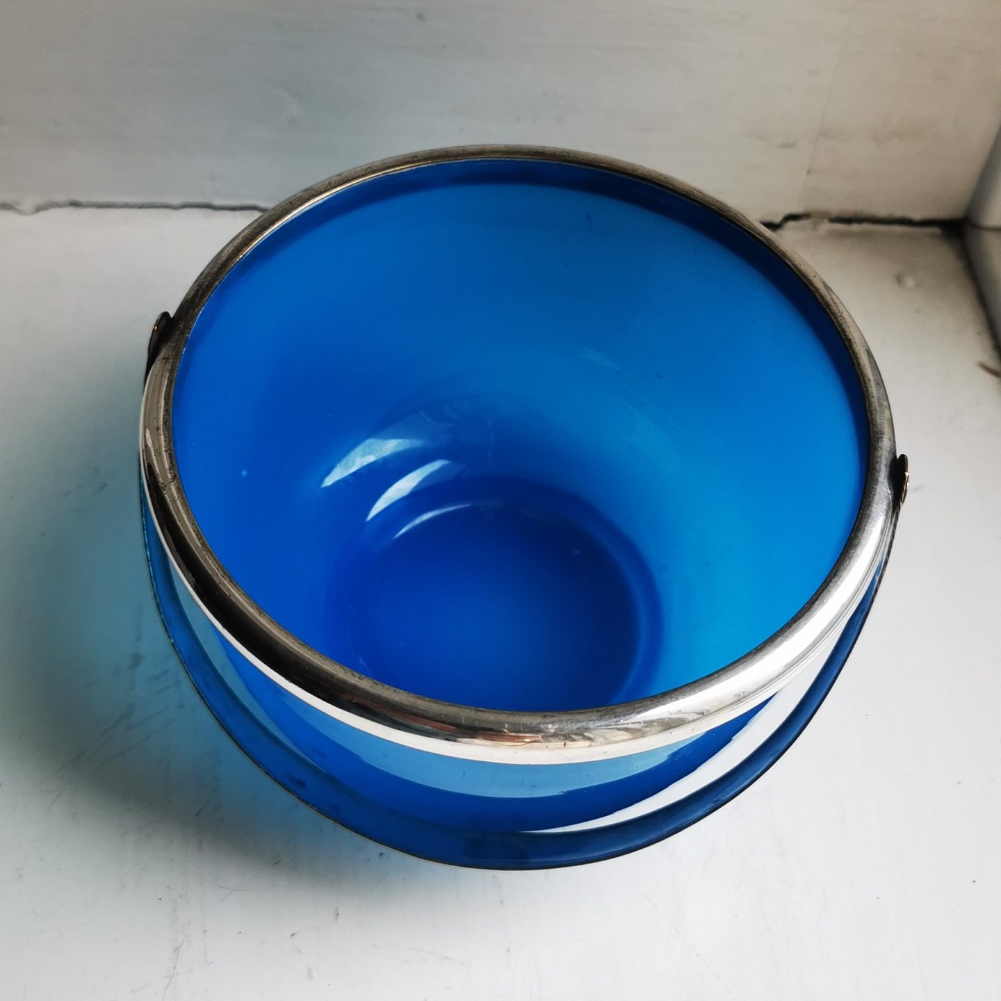Blå sukkerskål med hank i sølvplet. Både glasskålen og hanken i god stand uden særligt brugsspor. Hanken med fine danske stempler. Fremstillet omkring 1900. Mål: H. 7½ cm (2.95 tommer) Ø. 12 cm (4.72 tommer).