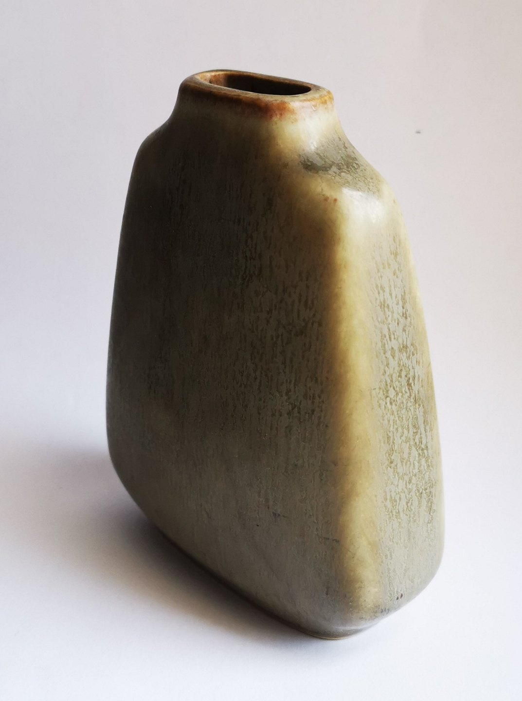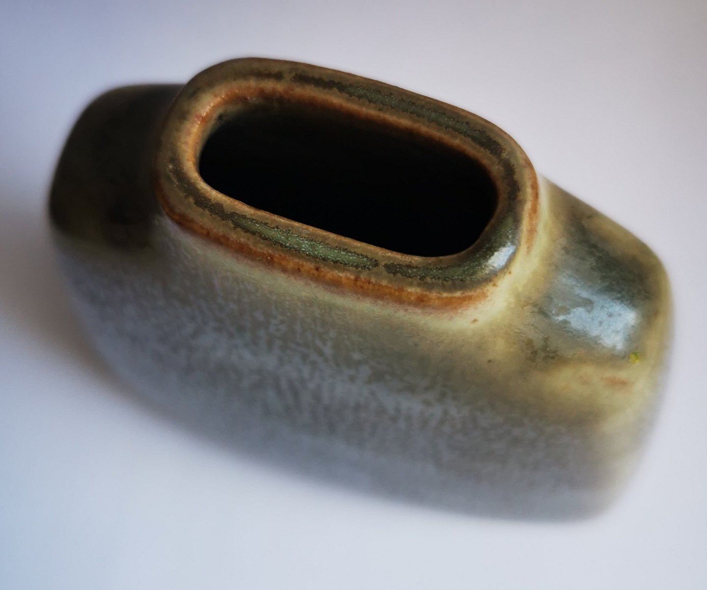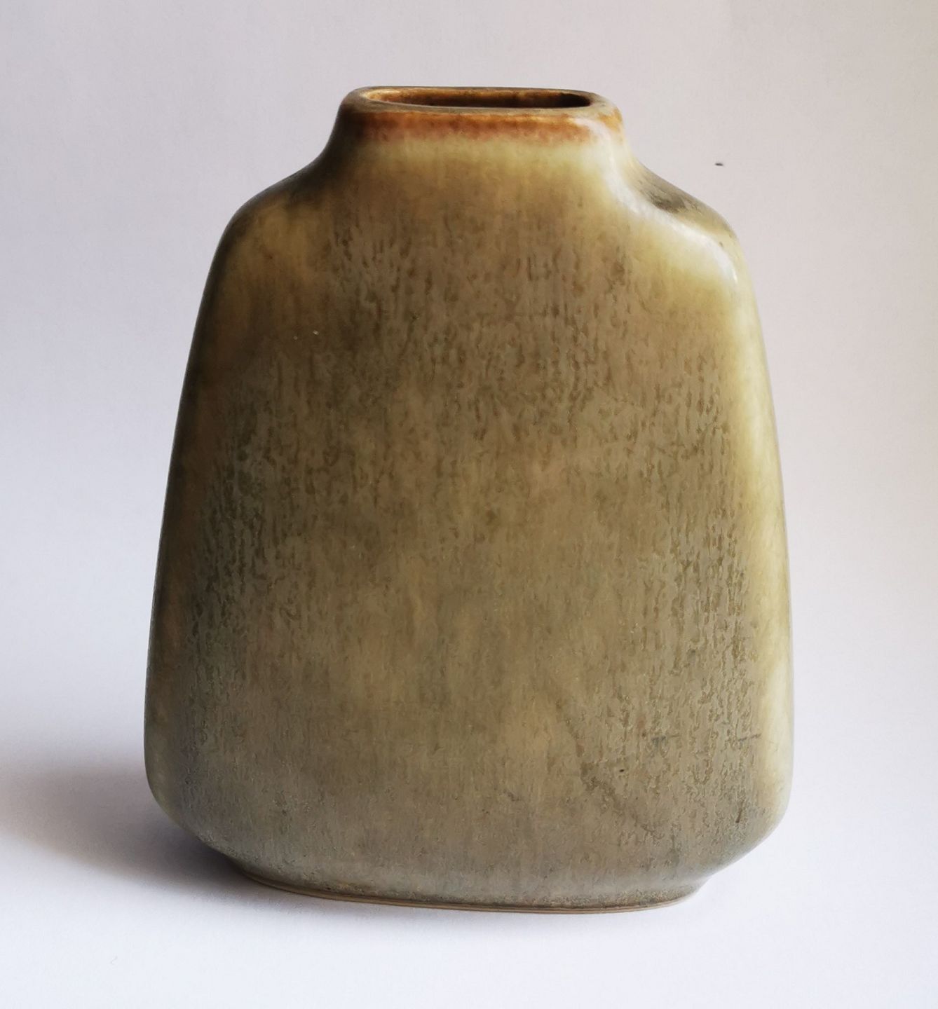 Flad vase i keramik fra Palshus designet af grundlæggeren Per Linnemann-Schmidt (PL-S). Har et meget lille skår på skulderen. Ellers i god stand. Modelnummer 402. Mål: H. 12½ cm (4.92 tommer) L. 10 cm (3.93 tommer) og 3½ cm bred (1.37 tommer).