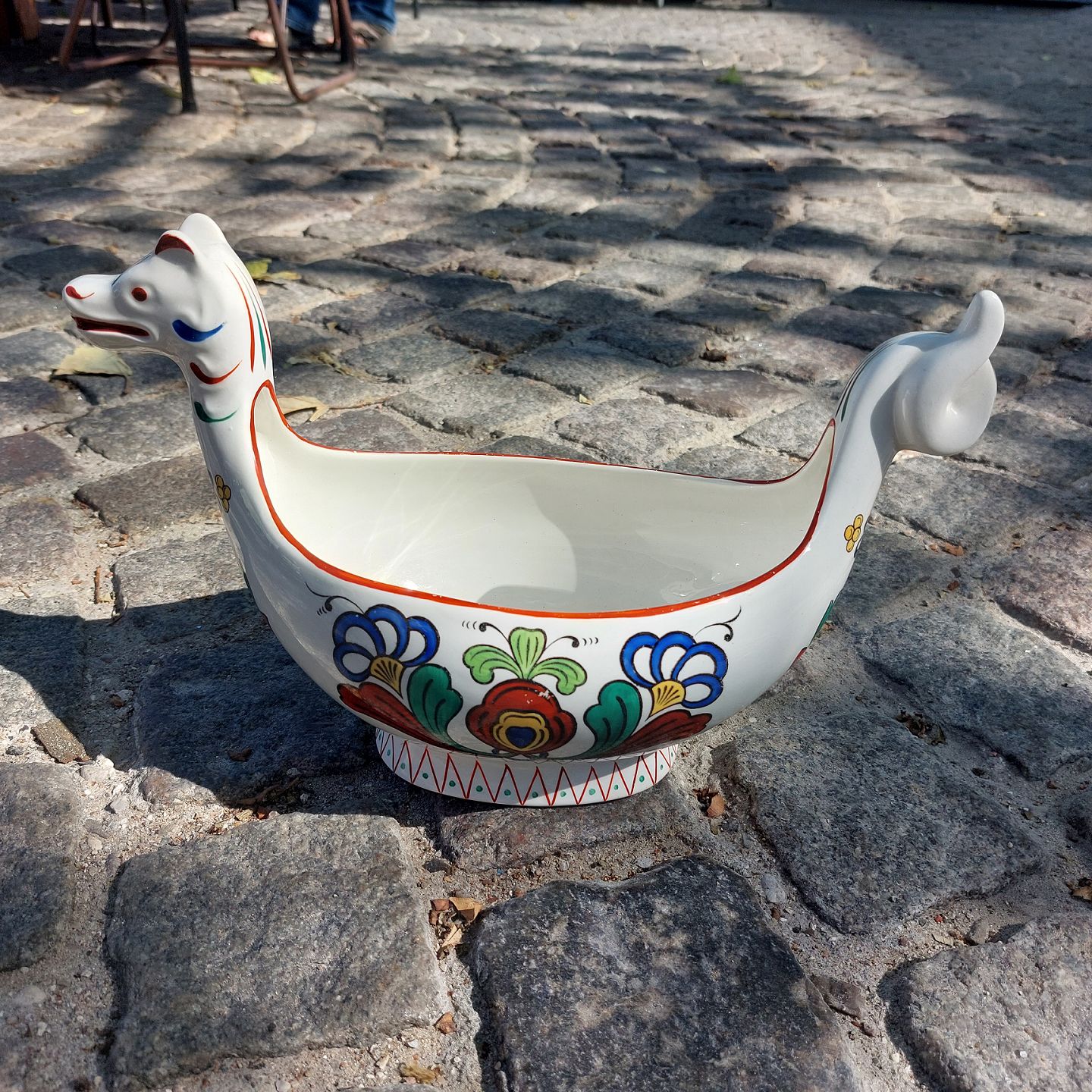 "Ølbolle" eller øl hestehoved drikkeskål fra Egersundfabrikken i Norge. Fremstillet omkring 1940. Hoved og hale som hanke. Bemalet ornamentik på siden. Fabriksmærket på bunden. Fremstår i god stand uden skader eller reparationer. Lignende skåle ses fra en anden norsk fabrik - Porsgrund. Mål: H. 19 cm (7.48 tommer) L. 31 cm (12.20 tommer)