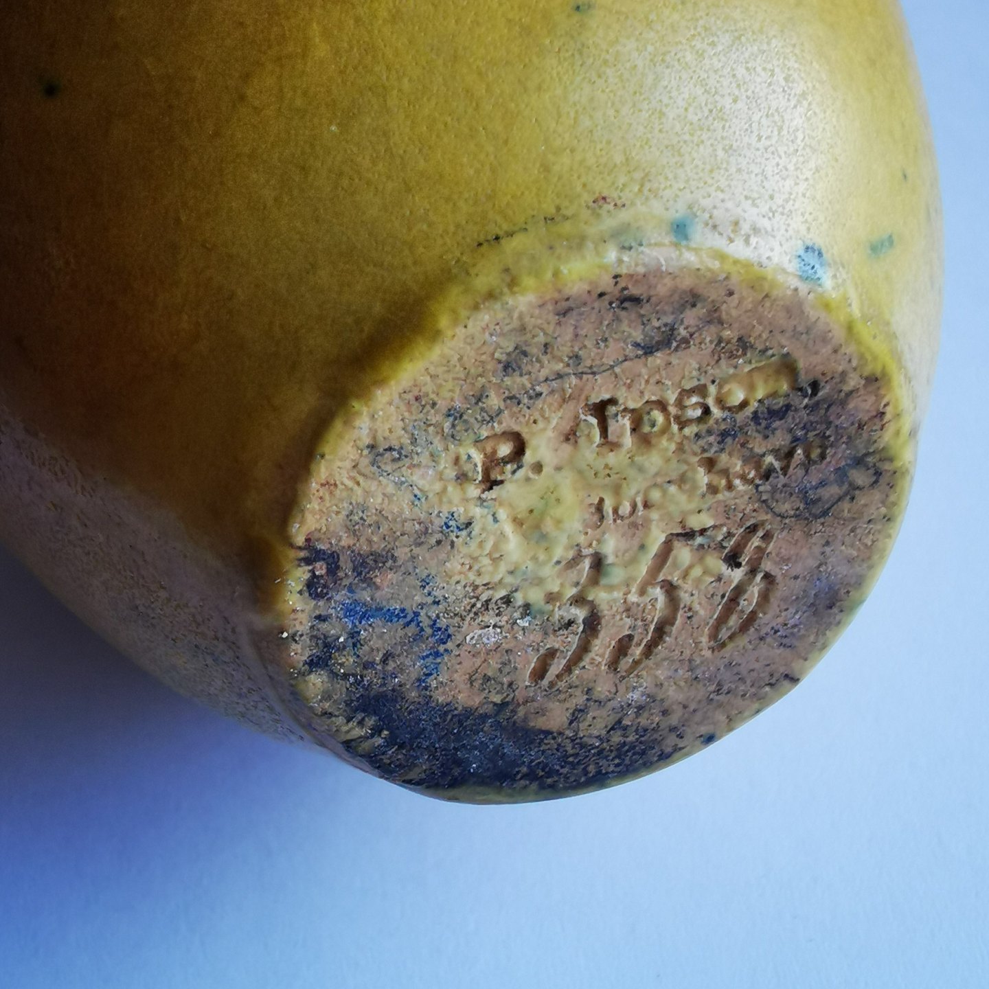 Vase med hanke i skønvirkestil fra P. Ipsen, København ca. 1915. Fremstår i perfekt stand. Ingen skader eller reparationer. Fabriksmærket på bunden sammen med modelnummer H. 14½ cm