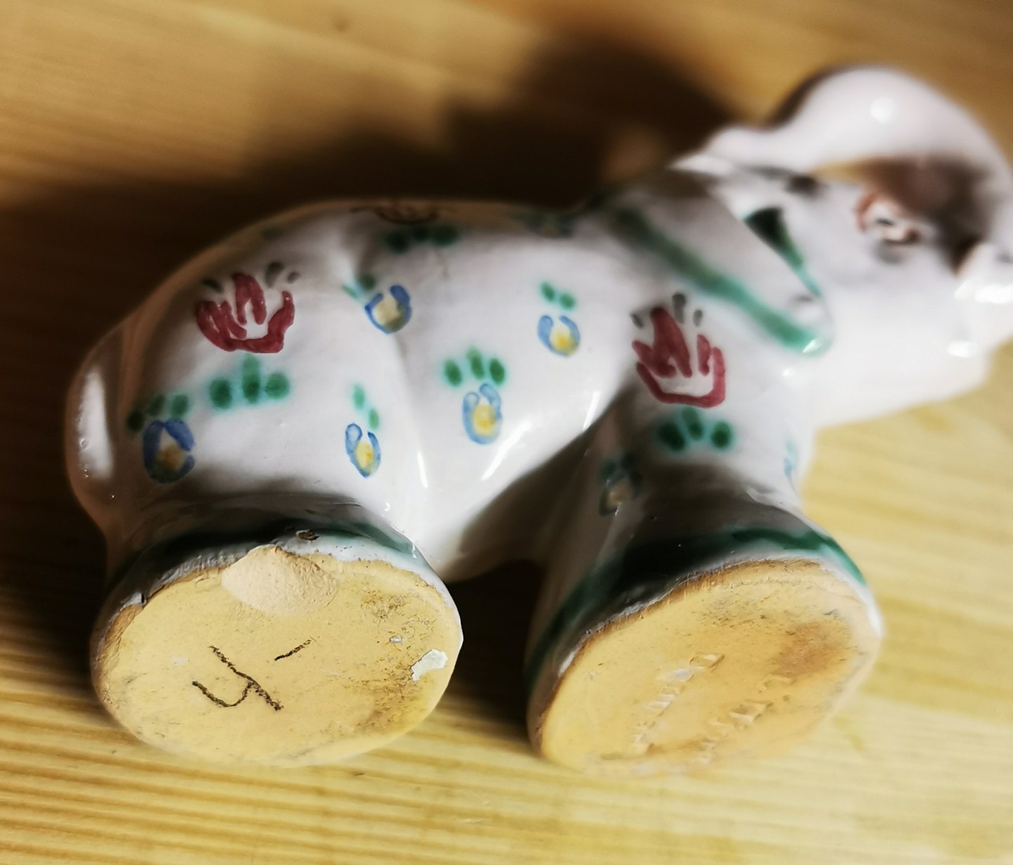 Figur i keramik af elefant fra Lauritz Hjorth, Bornholm. Bemalet med blomster. Har skår på undersiden (se foto). Fabriksmærket på undersiden. Mål: H. 7½ cm L. 9½ cm.