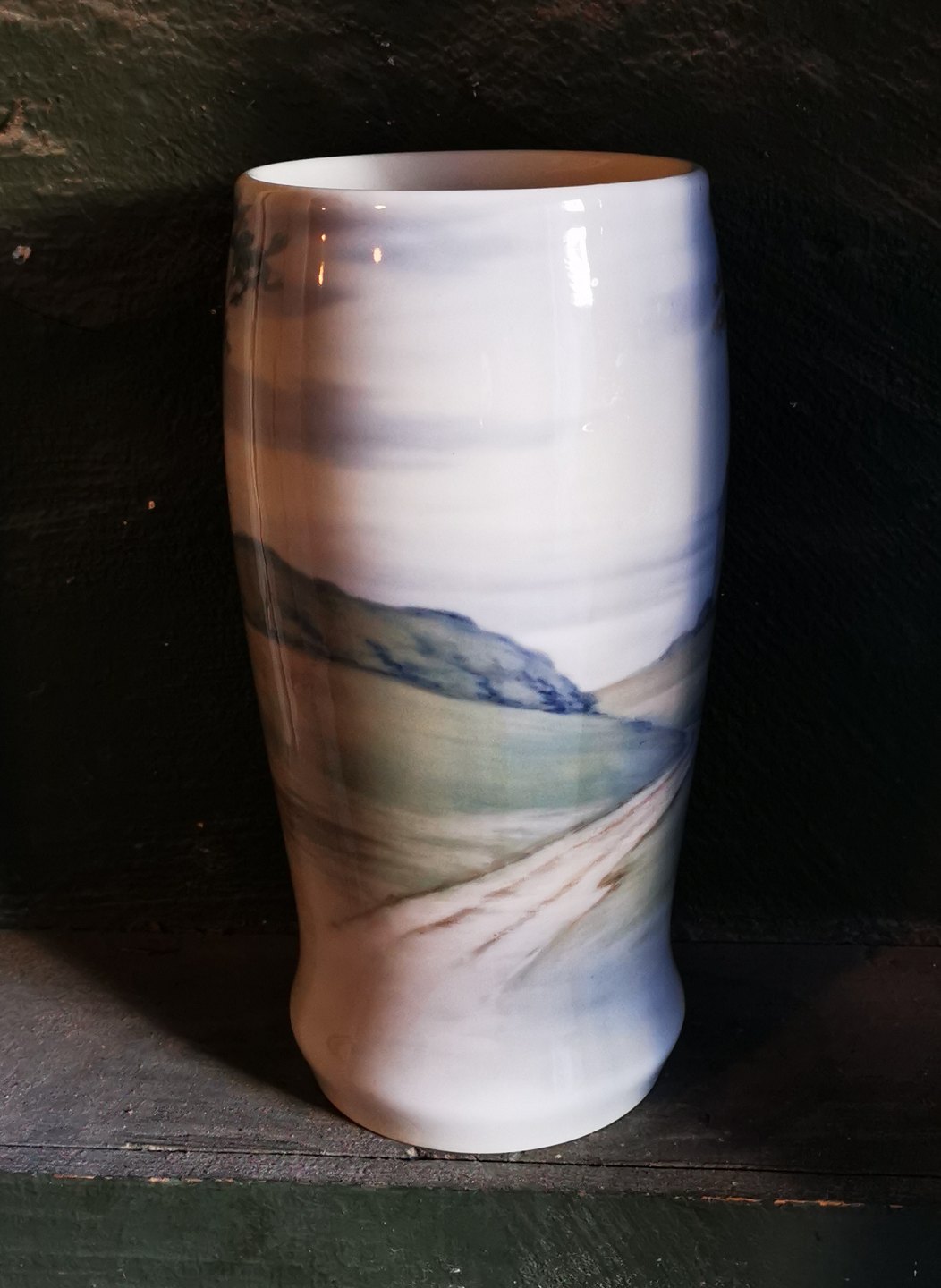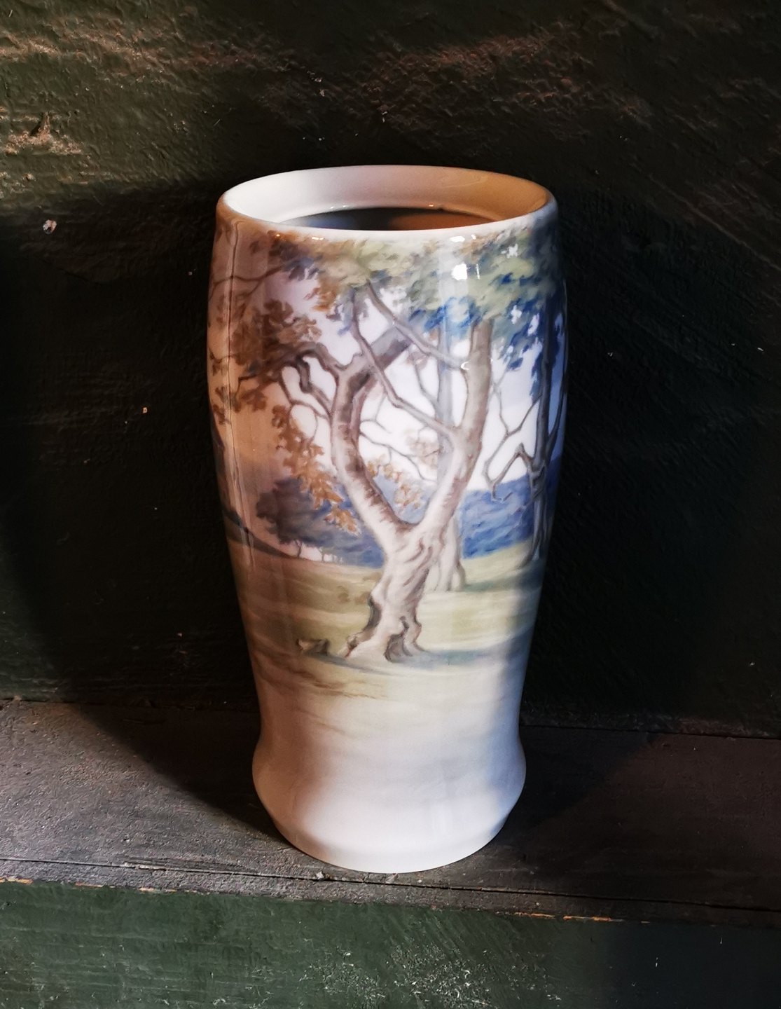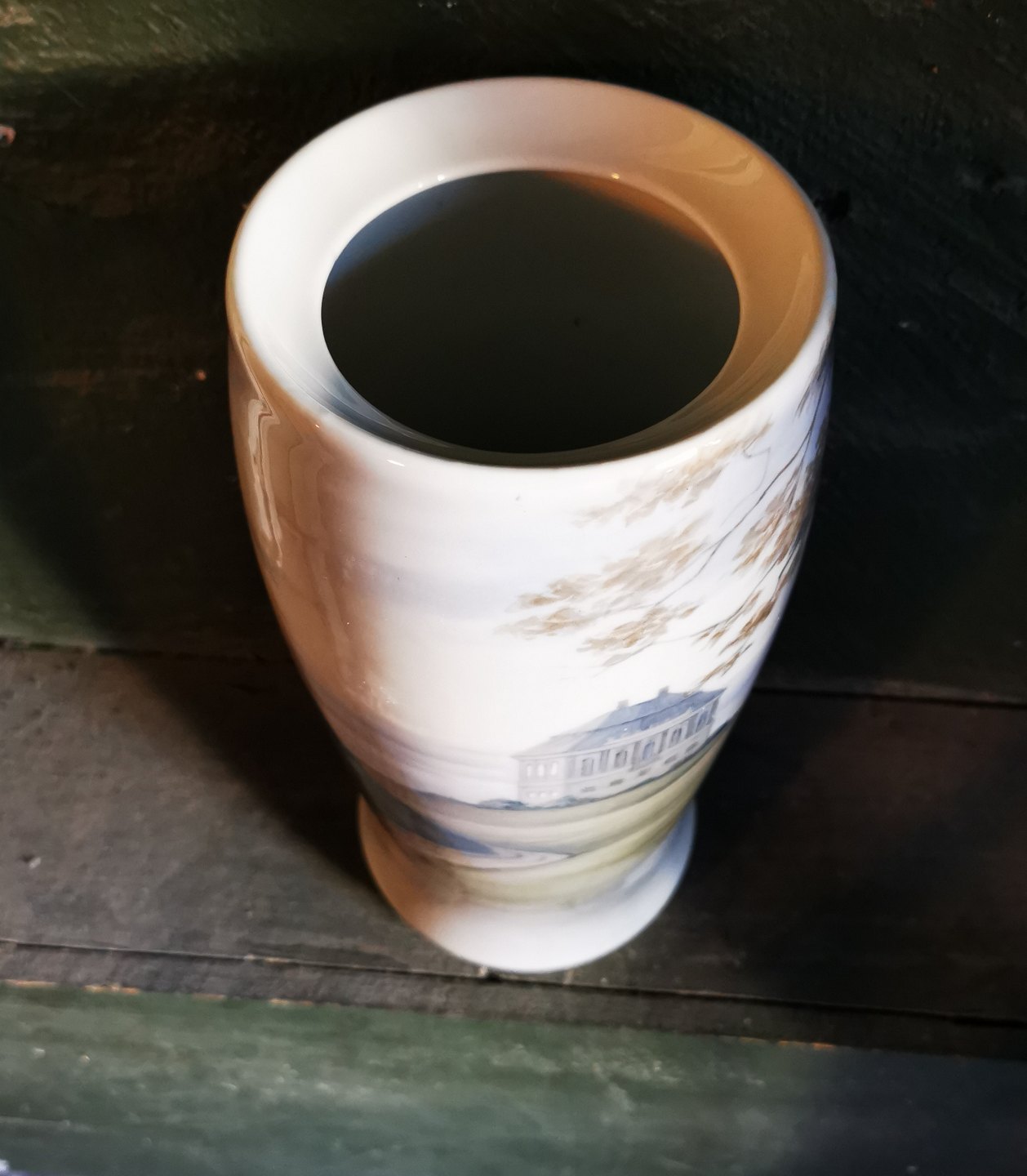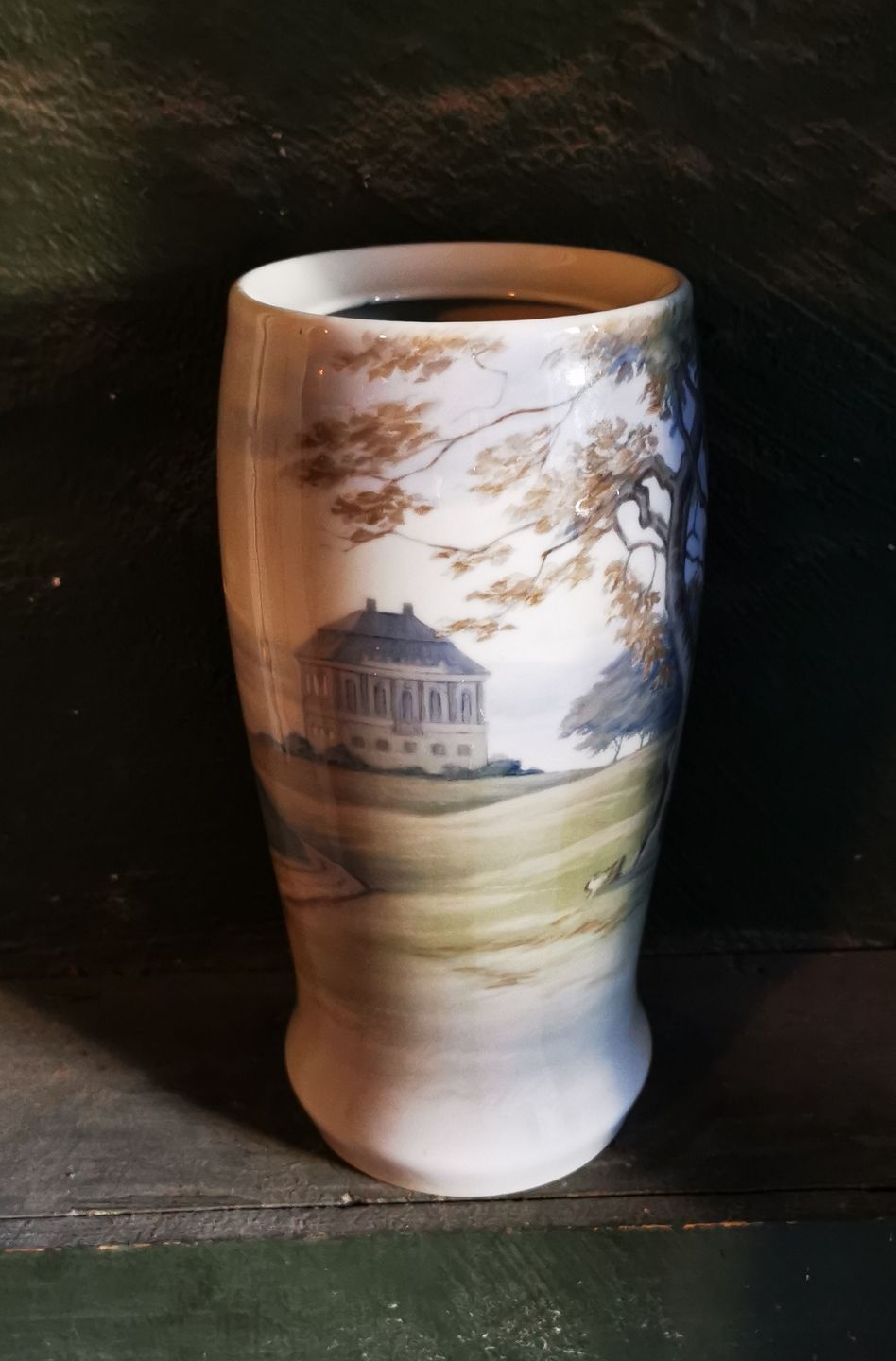Stor vase i porcelæn fra Bing & Grøndahl med motiv med Eremitageslottet i Dyrehaven. Dekoreret af Margrethe Hyldahl (1881-1963), der arbejde for B&G fra 1909 og indtil sin død. Vasen fremstår i perfekt stand uden skader eller reparationer. Fabriksmærket på bunden. H. 28 cm høj