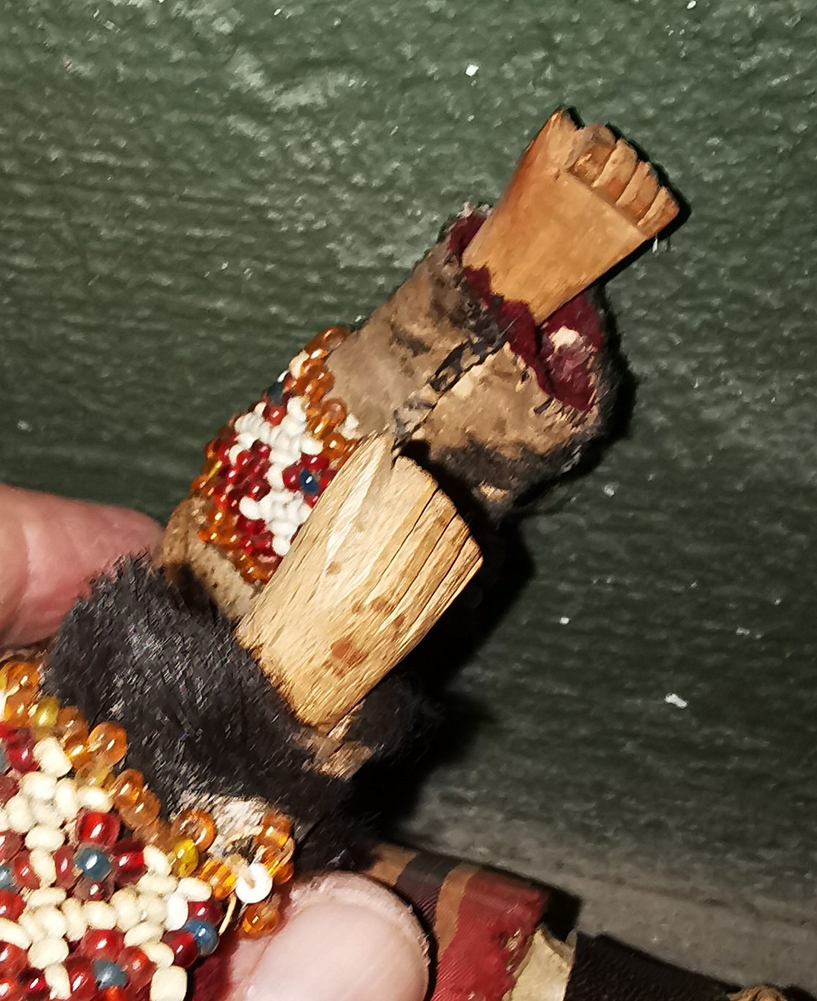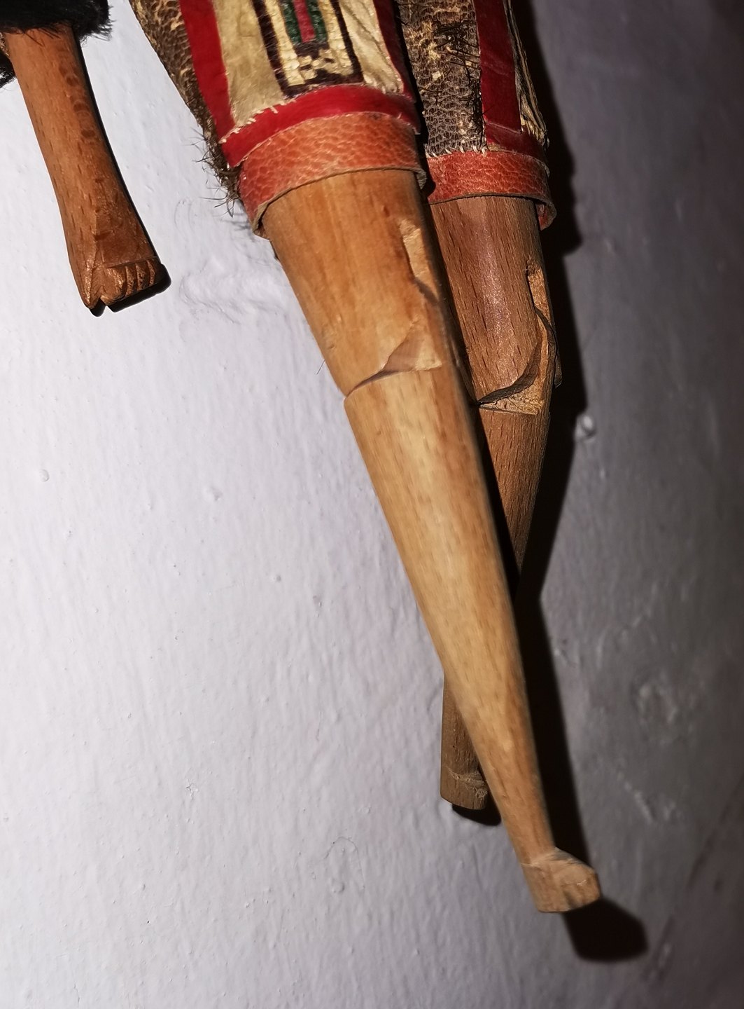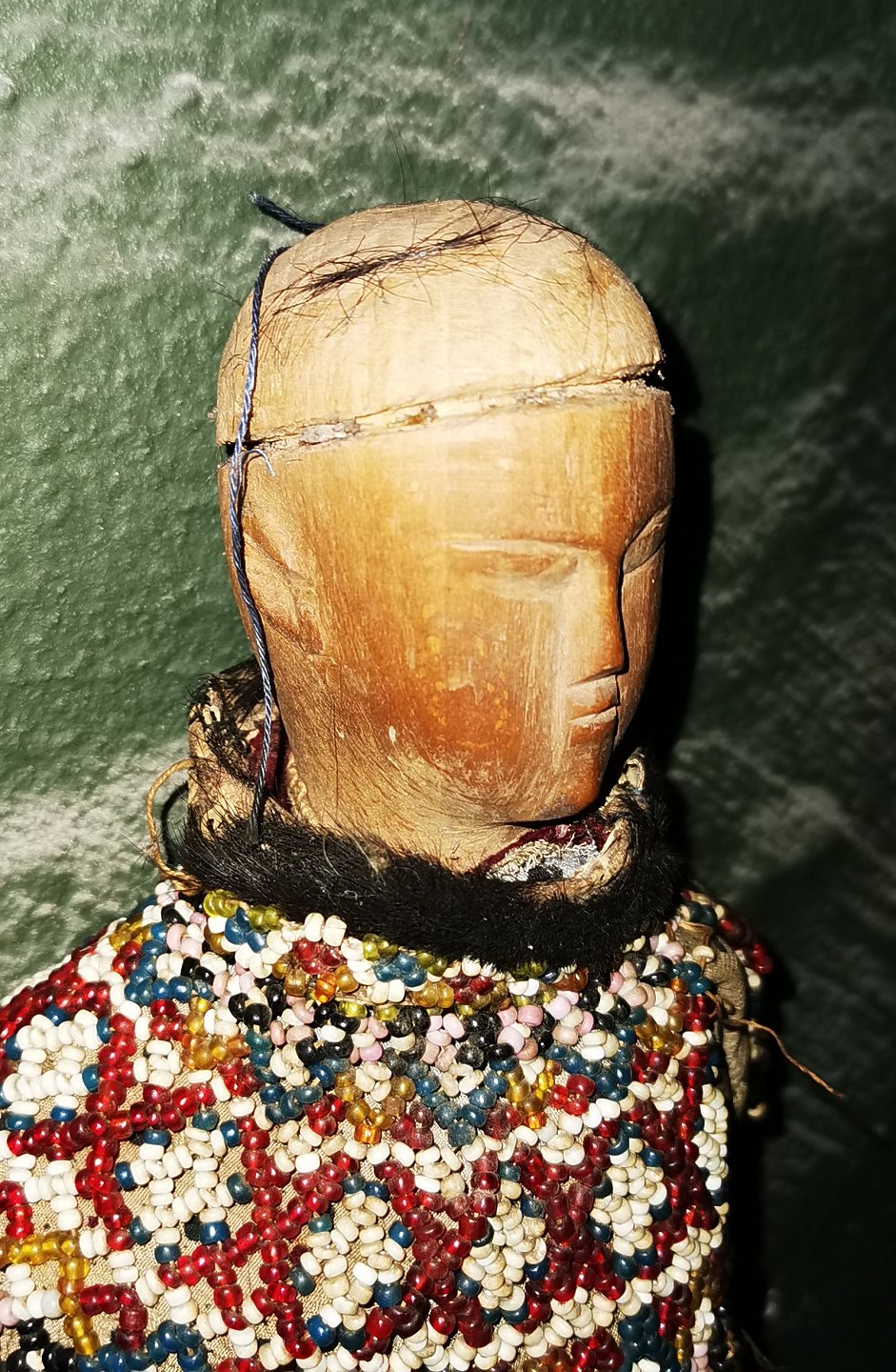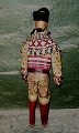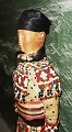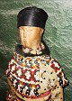 Figur eller dukke i træ. Hele kroppen udført i træ. Benene kan bøjes. Små hænder og små fødder. Grønlandsk kvinde i nationaldragt. Fremstillet omkring 1930. Ingen skader eller reparationer på dukken. Klædedragt med defekter. H. 40 cm