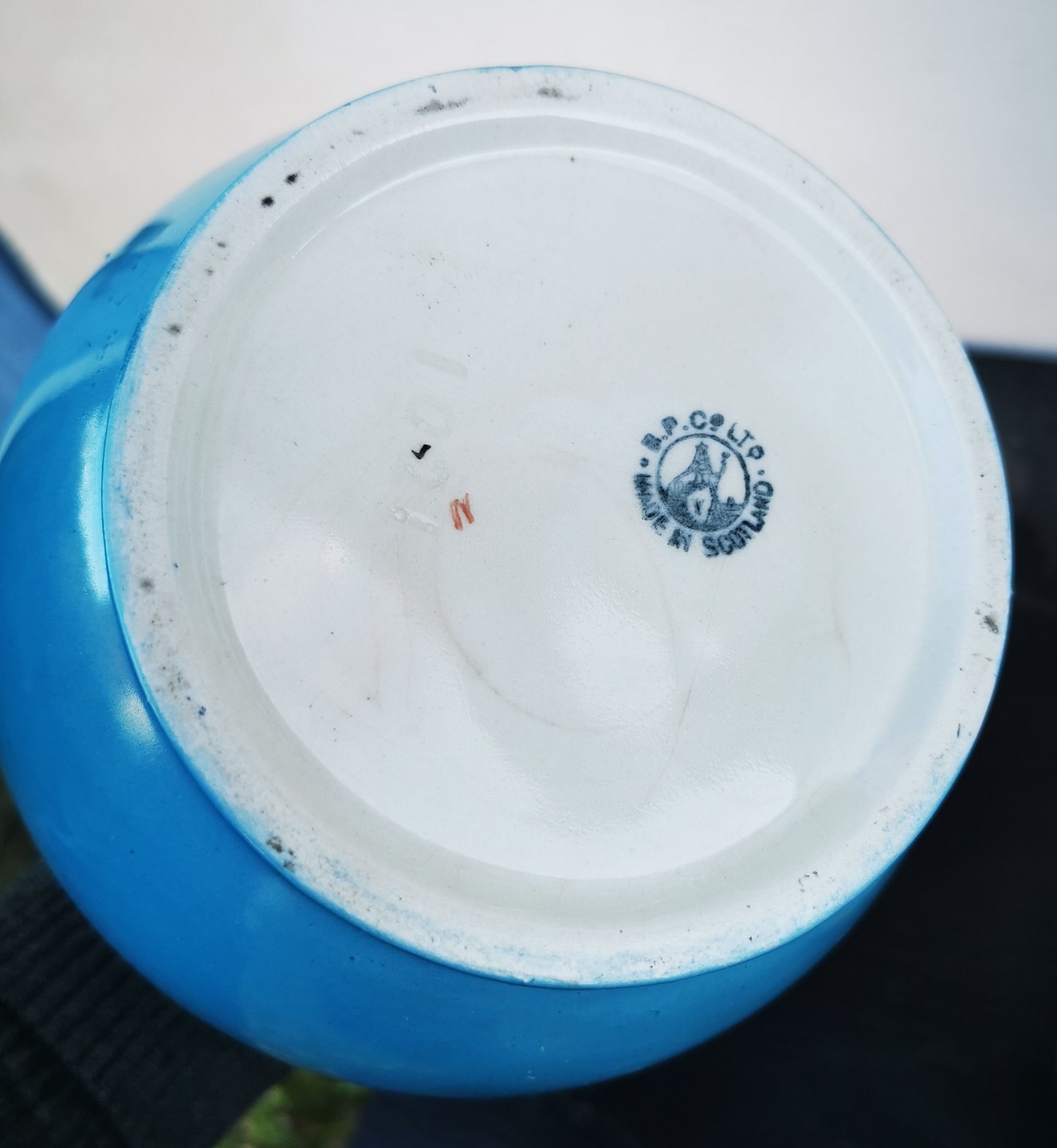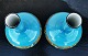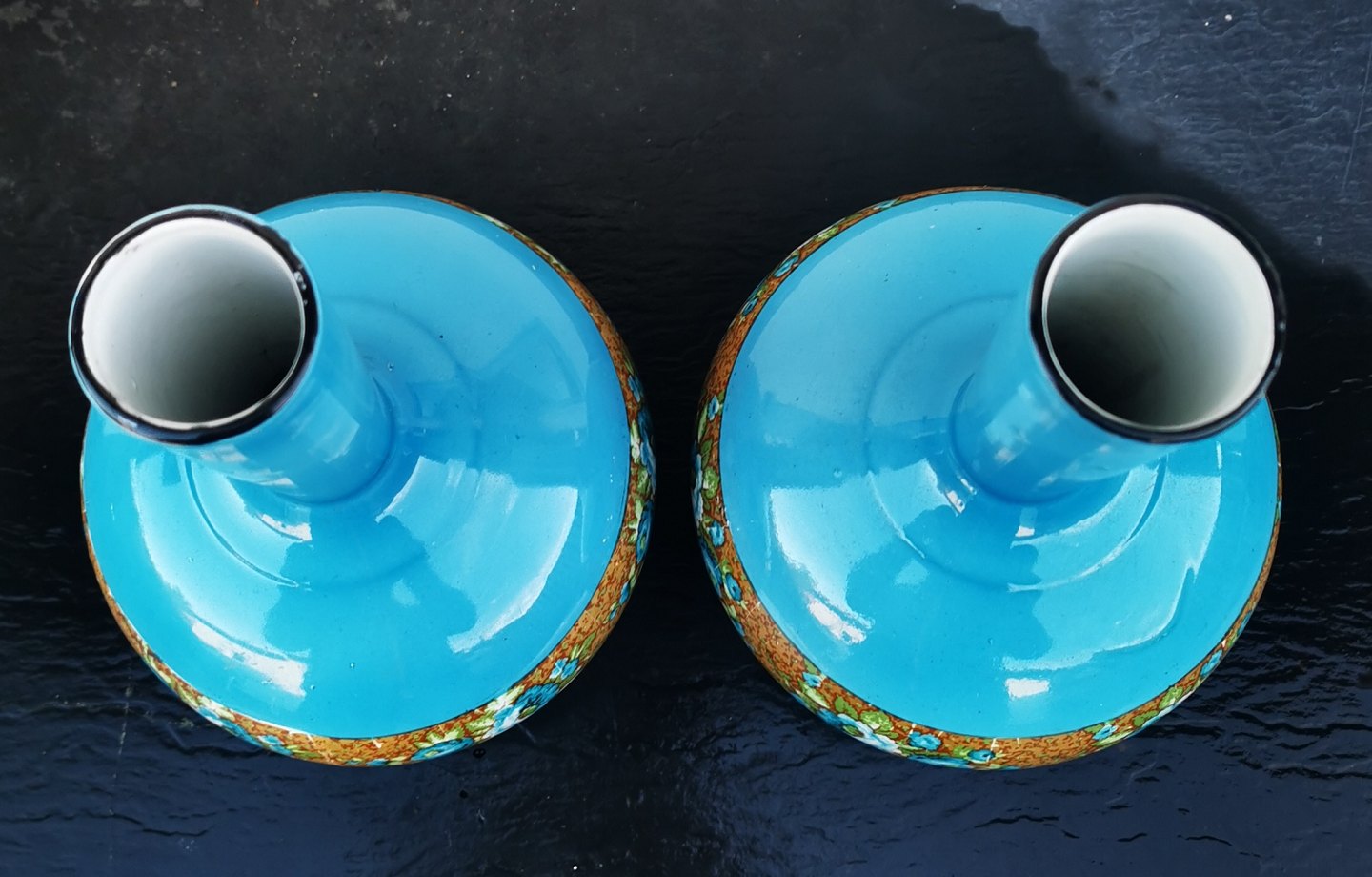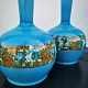 Par blå art deco vaser i fajance med blomster dekorationer fra British Bavaria (B.P. Co. Ltd) i Skotland. Fremstår i god stand uden skader eller reparationer. Fremstillet i 1920´erne. Fabriksmærket på bunden. H. 26½ cm (10.43 tommer).