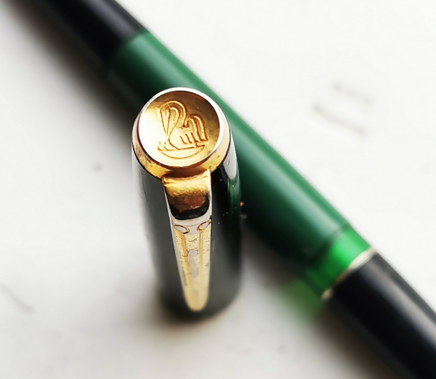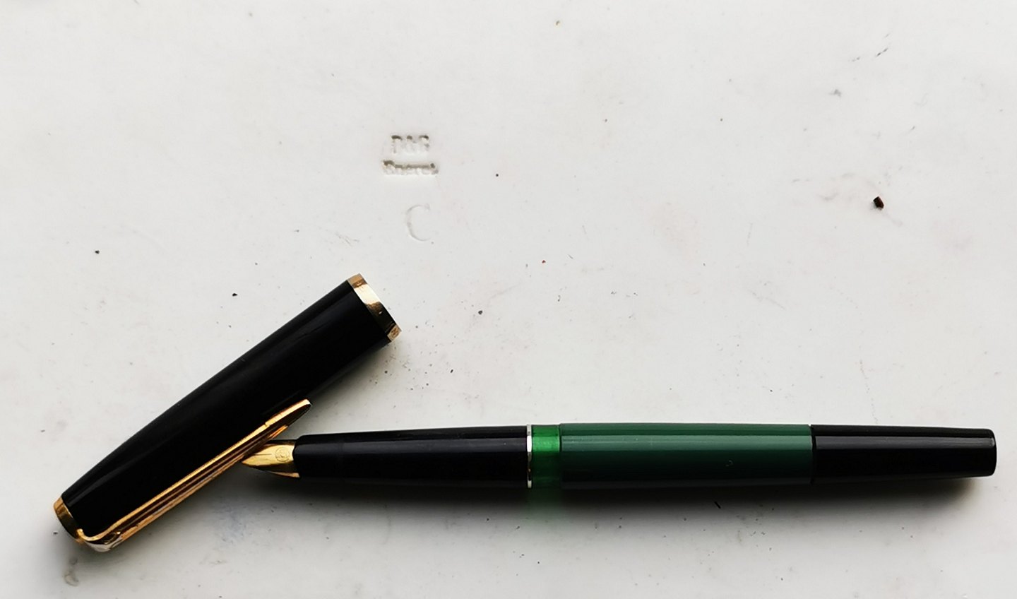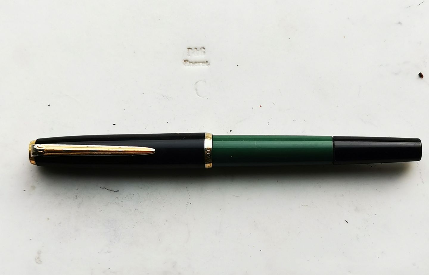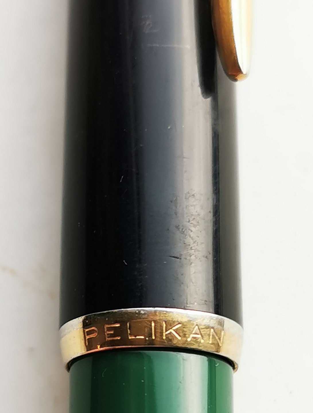 Grøn Pelikan fyldepen med sort hætte. Fremstillet i Tyskland i 1970'eene. Pistol filler. Fremstår I god og funktionsdygtig stand. Klar til at blive brugt. L.13,5 cm.